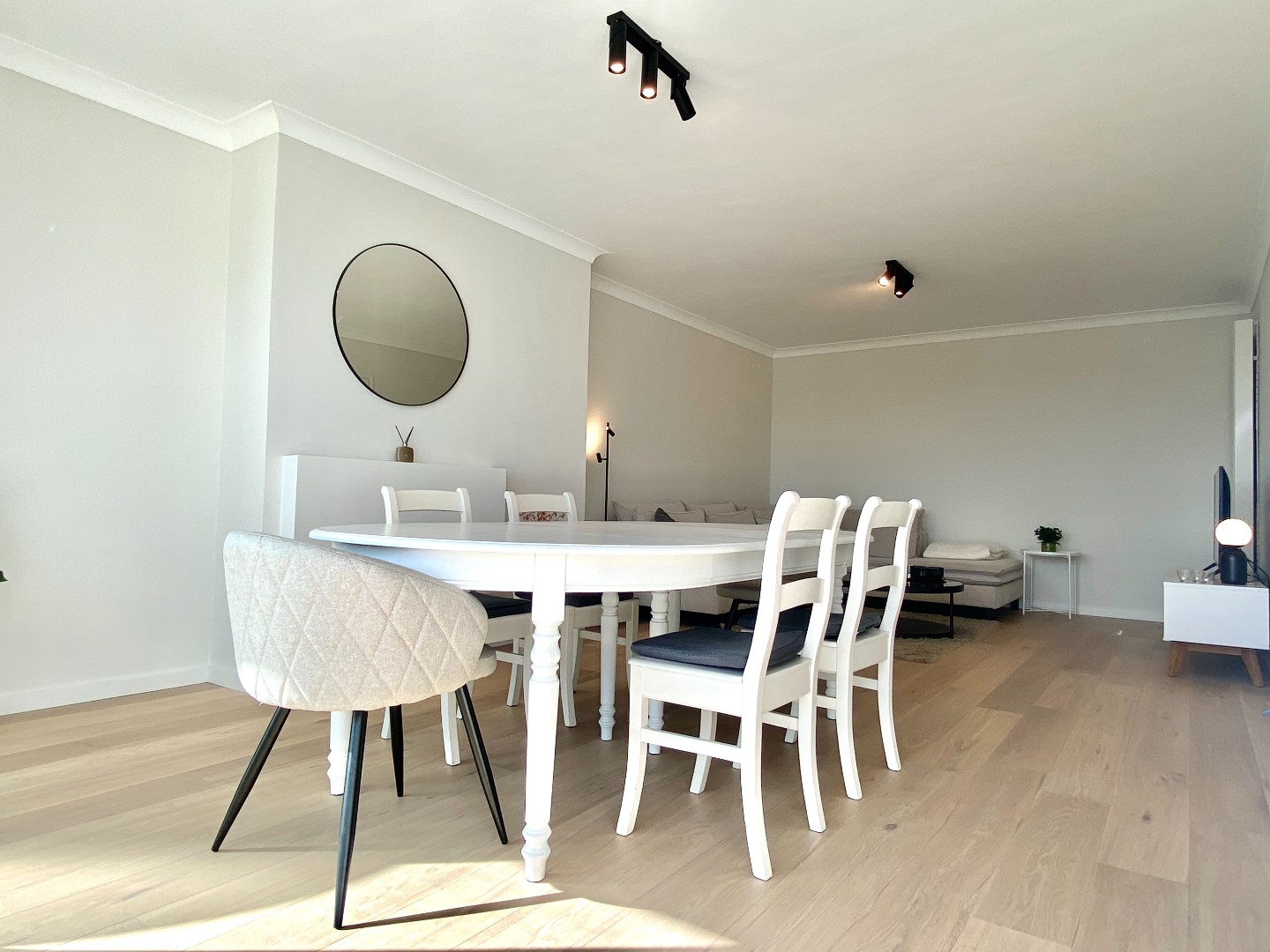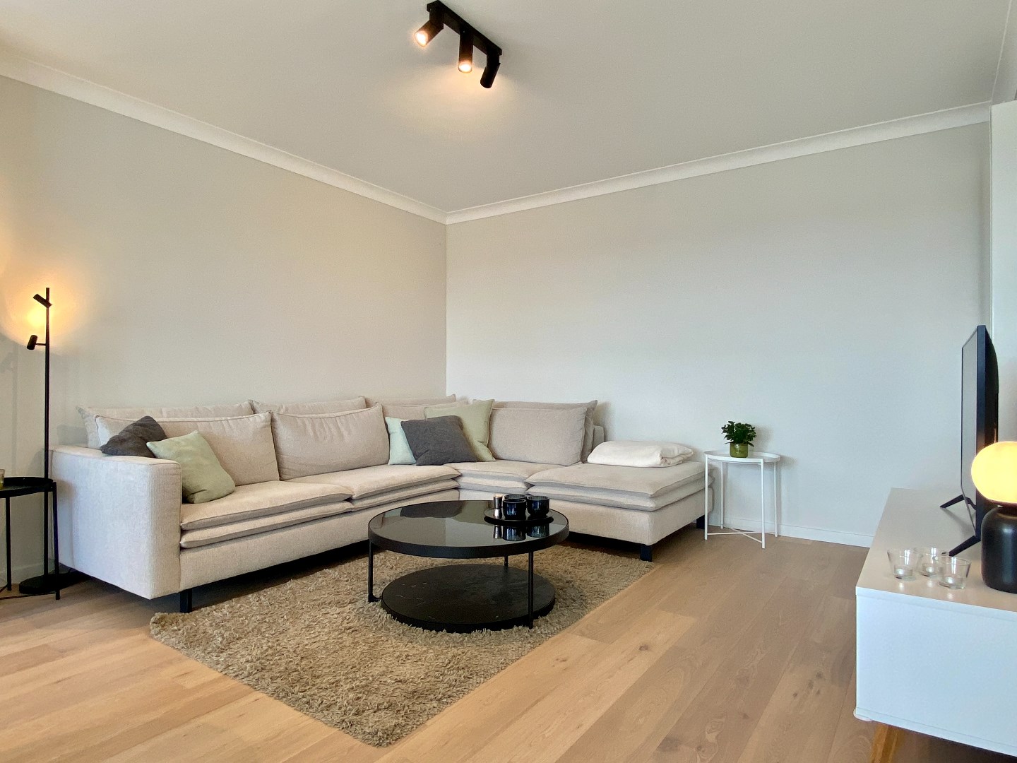 De ruime leefruimte met aanpalend zonnig terras creëert een luchtig en licht gevoel. De ingerichte keuken is voorzien van alle benodigde toestellen, waaronder een microgolf, oven en vaatwasmachine, en biedt veel kastruimte.