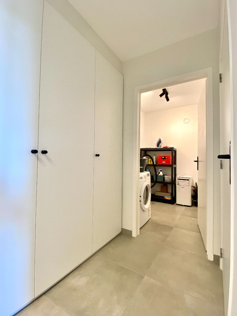 Daarnaast is er een bergplaats met aansluitingen voor een wasmachine en eventueel een droogkast of diepvries. De ingebouwde kasten in de gang bieden extra opbergruimte.