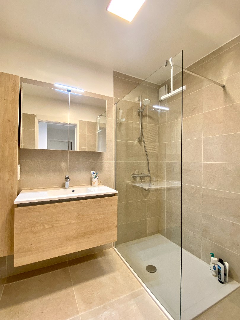 Verderop in de gang bevindt zich een apart toilet en de badkamer, uitgerust met een lavabomeubel met kastruimte en een inloopdouche. De twee slaapkamers zijn aan de achterkant van het appartement gelegen en beschikken ook over een terras/balkon.
