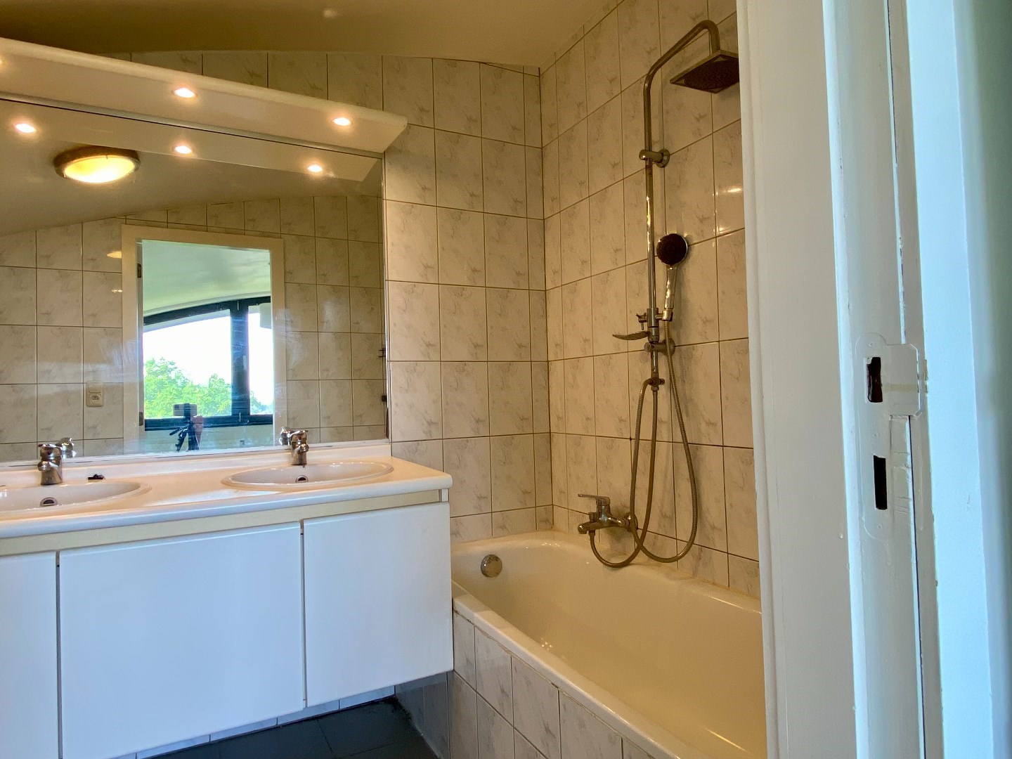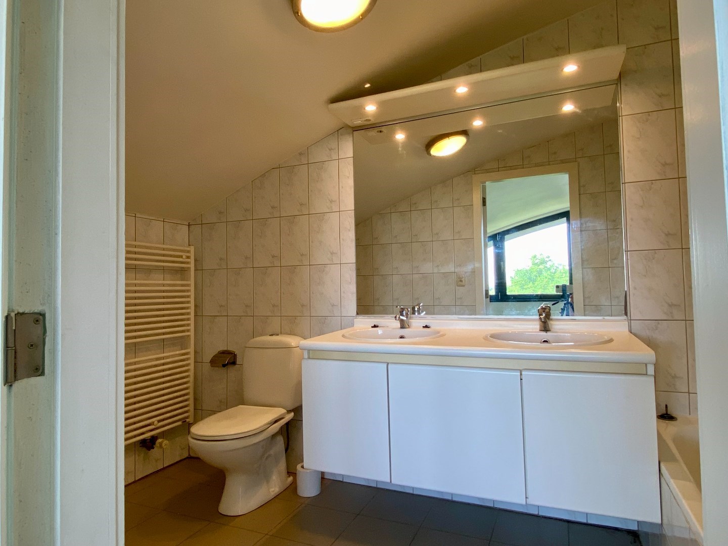 Op het eerste verdiep is er één slaapkamer en een badkamer met dubbele lavabo, toilet en een bad.