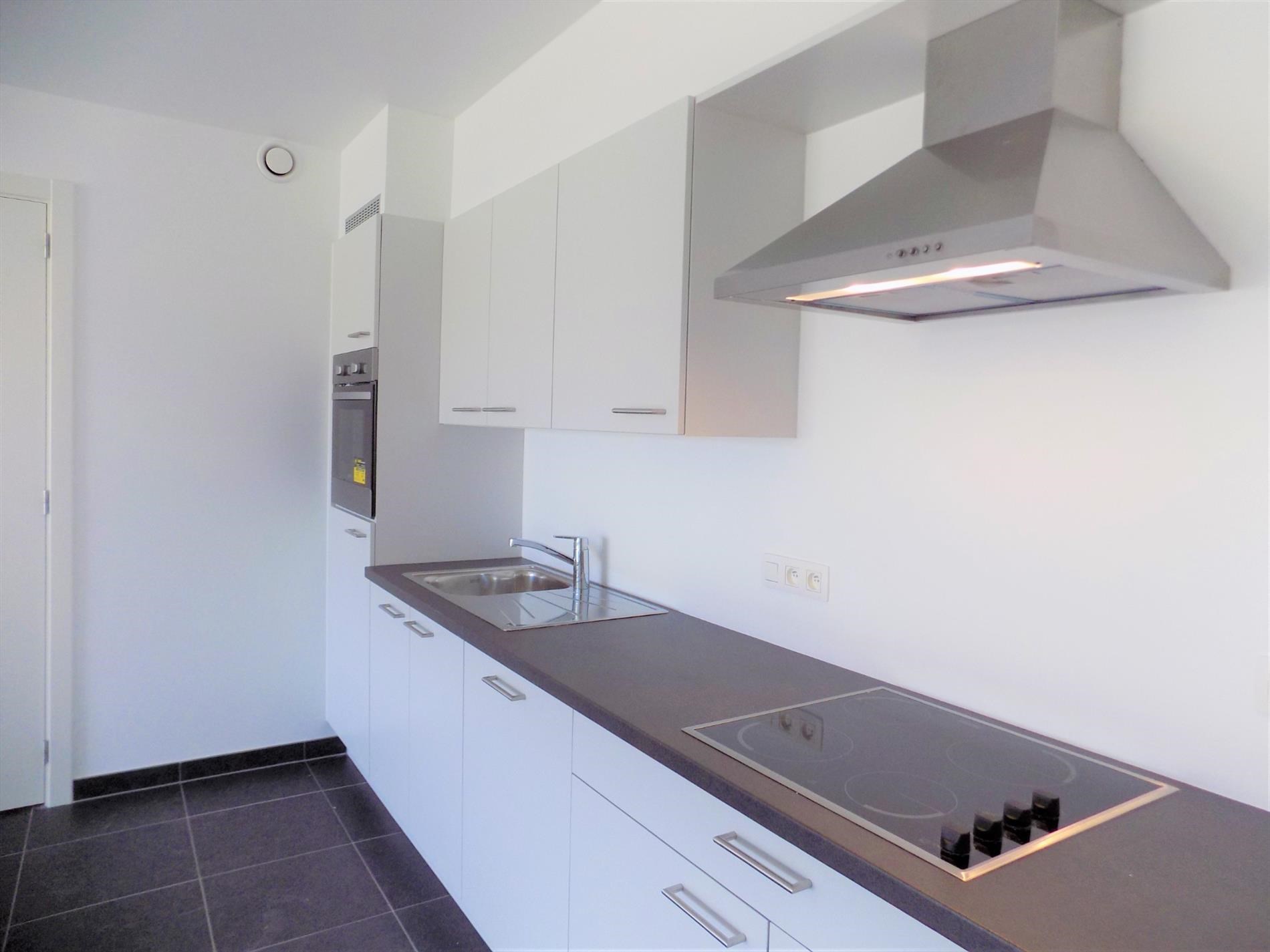 Ingerichte moderne keuken (vaatwas, spoelbak, oven, frigo, dampkap en vooral vele bergkasten maken het geheel praktisch) met leefruimte met heel veel lichtinval.