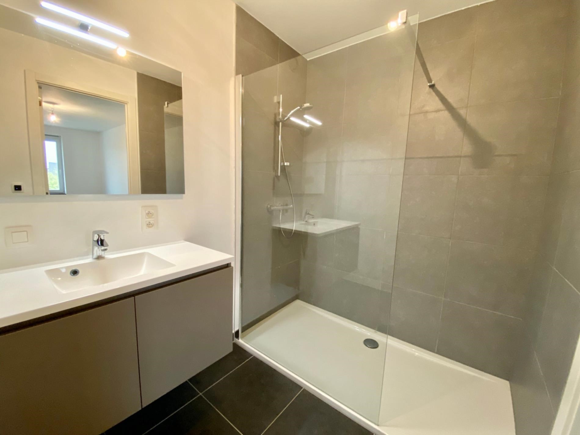 Badkamer met inloopdouche, wastafel met meubel en spiegel.