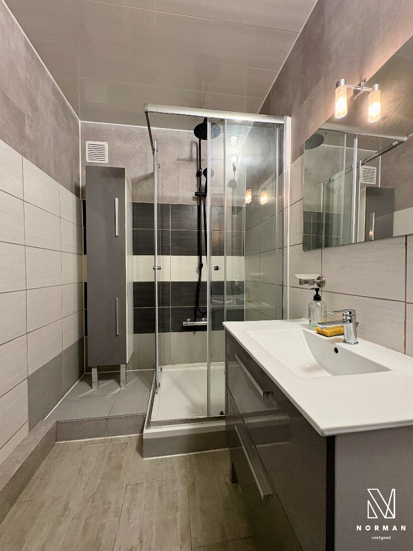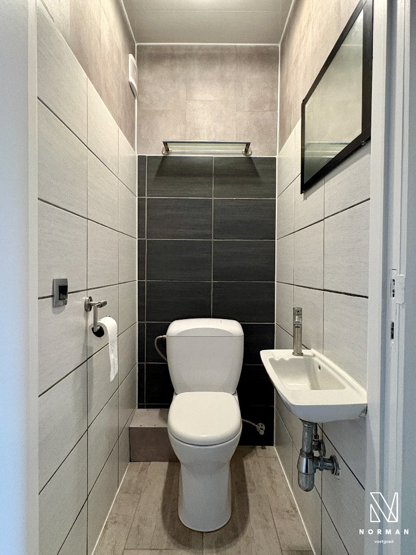Verder is er op de gang een afzonderlijk toilet, de badkamer voorzien van lavabomeubel en douche en 2 slaapkamers gelegen achteraan.