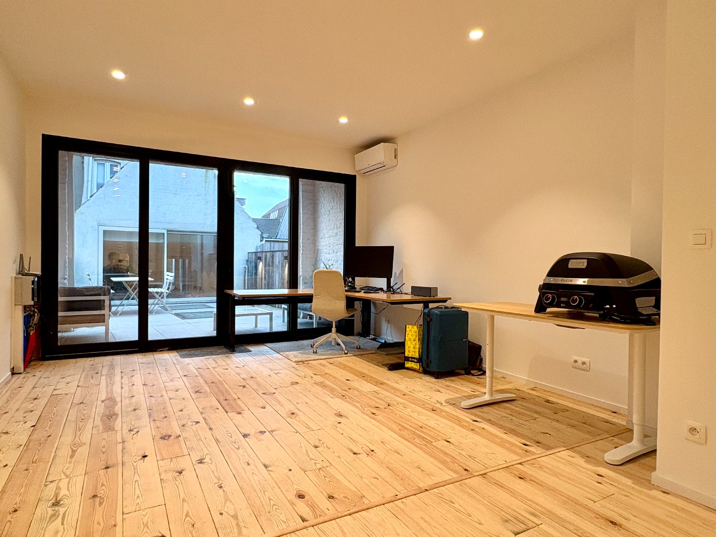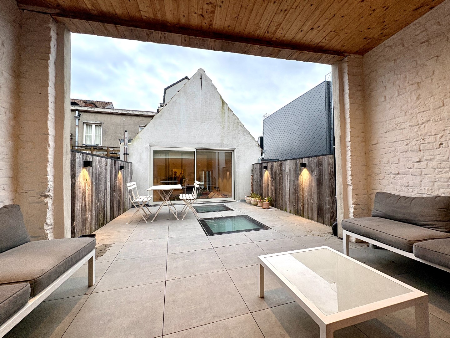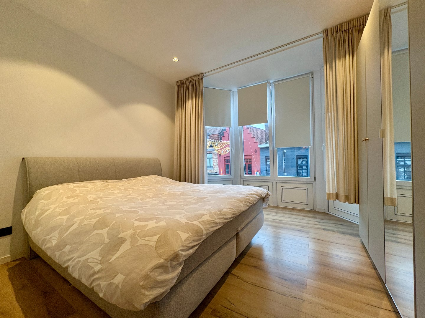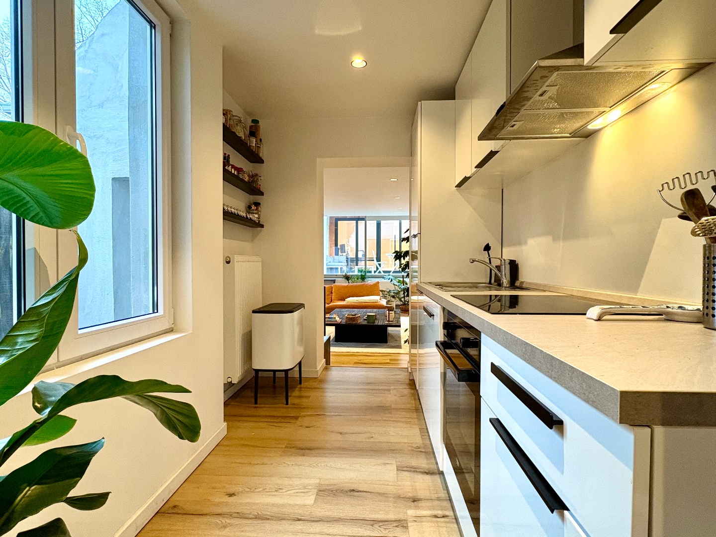 Deze verborgen parel is gelegen in het stadscentrum van Kortrijk en maakt deel uit van een kleinschalig gebouw. Het appartement bevindt zich op de eerste verdieping en is bereikbaar via de trap. De inkomhal biedt toegang tot het leef- en slaapgedeelte. Aan de voorkant van het gebouw bevindt zich de slaapkamer met een aangrenzende badkamer, uitgerust met een lavabomeubel en een inloopdouche. Verderop in de gang is er nog een apart toilet. Aan de andere kant van de gang komt men uit in de zitruimte, die beschikt over een volledig ingerichte keuken. Achteraan bevindt zich de grote, lichtrijke woonkamer met grote raampartijen, die uitzicht biedt op het dakterras. Achter het dakterras bevindt zich een extra ruimte, volledig ingericht met alle voorzieningen, evenals een bijkomende badkamer met douche en lavabomeubel. Aansluitend is er nog een berging voorzien.