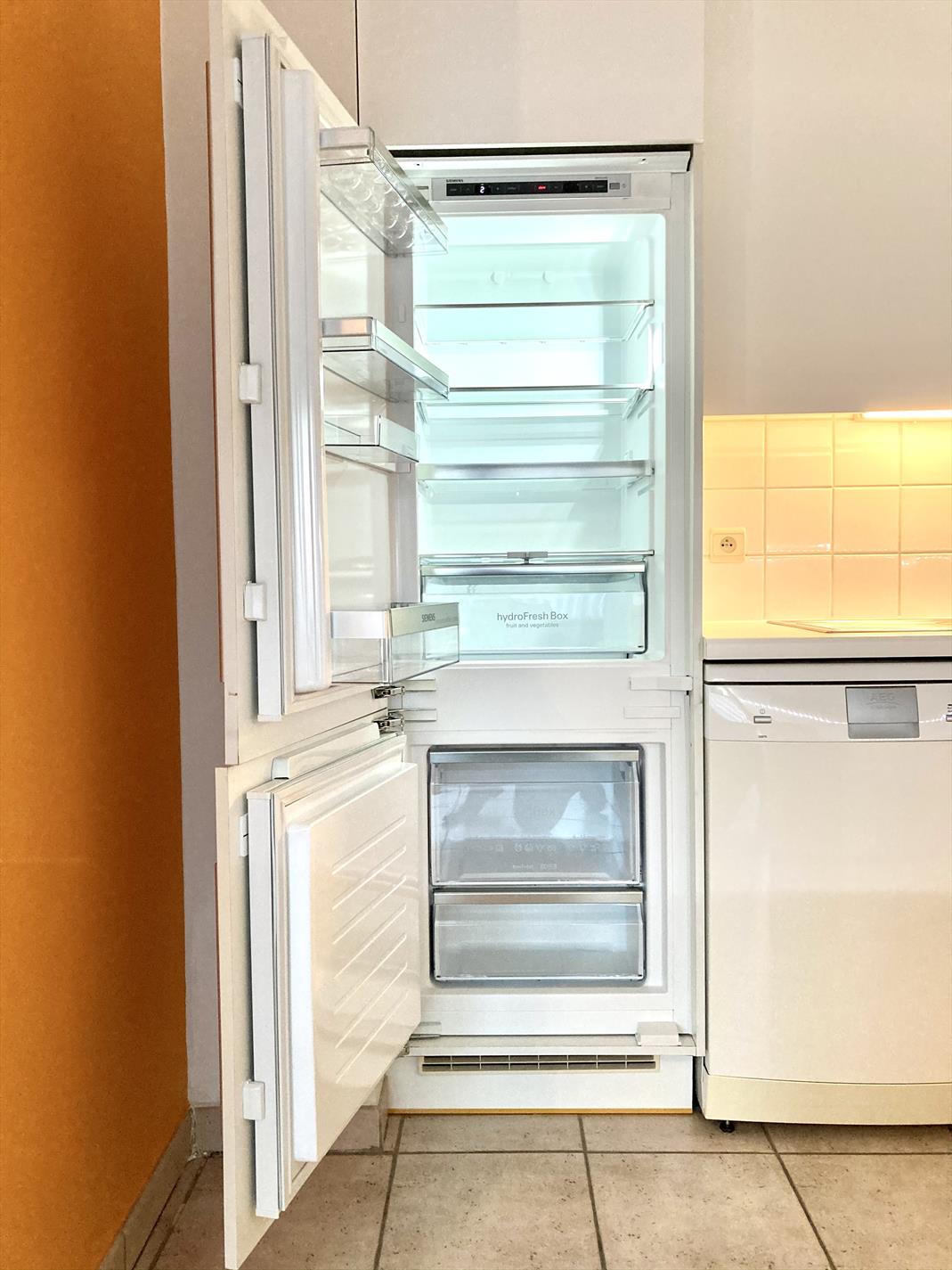 Ruime leefruimte voorzien met open keuken. In de inkomhal is er bergruimte voorzien plus ingebouwde kasten die kunnen dienen als vestiaire.