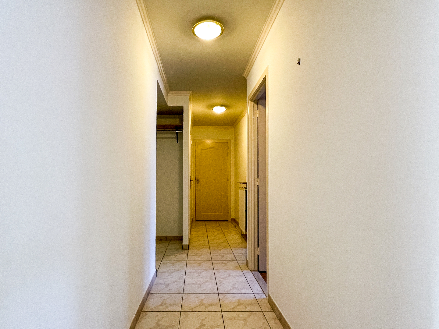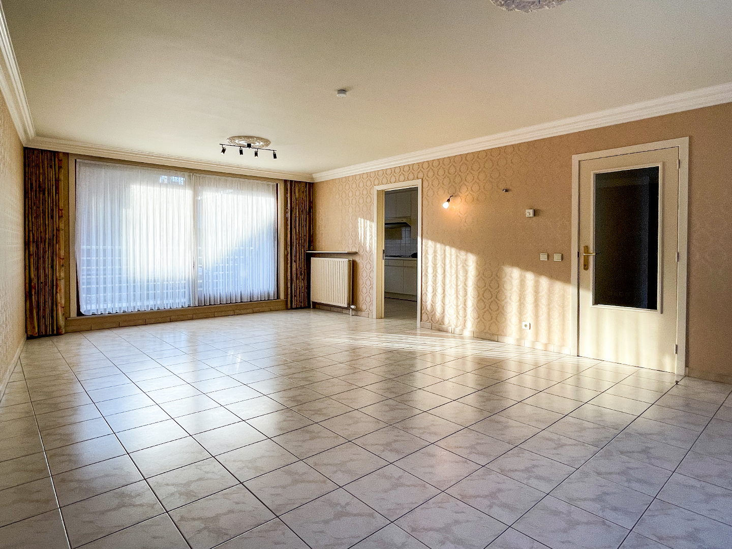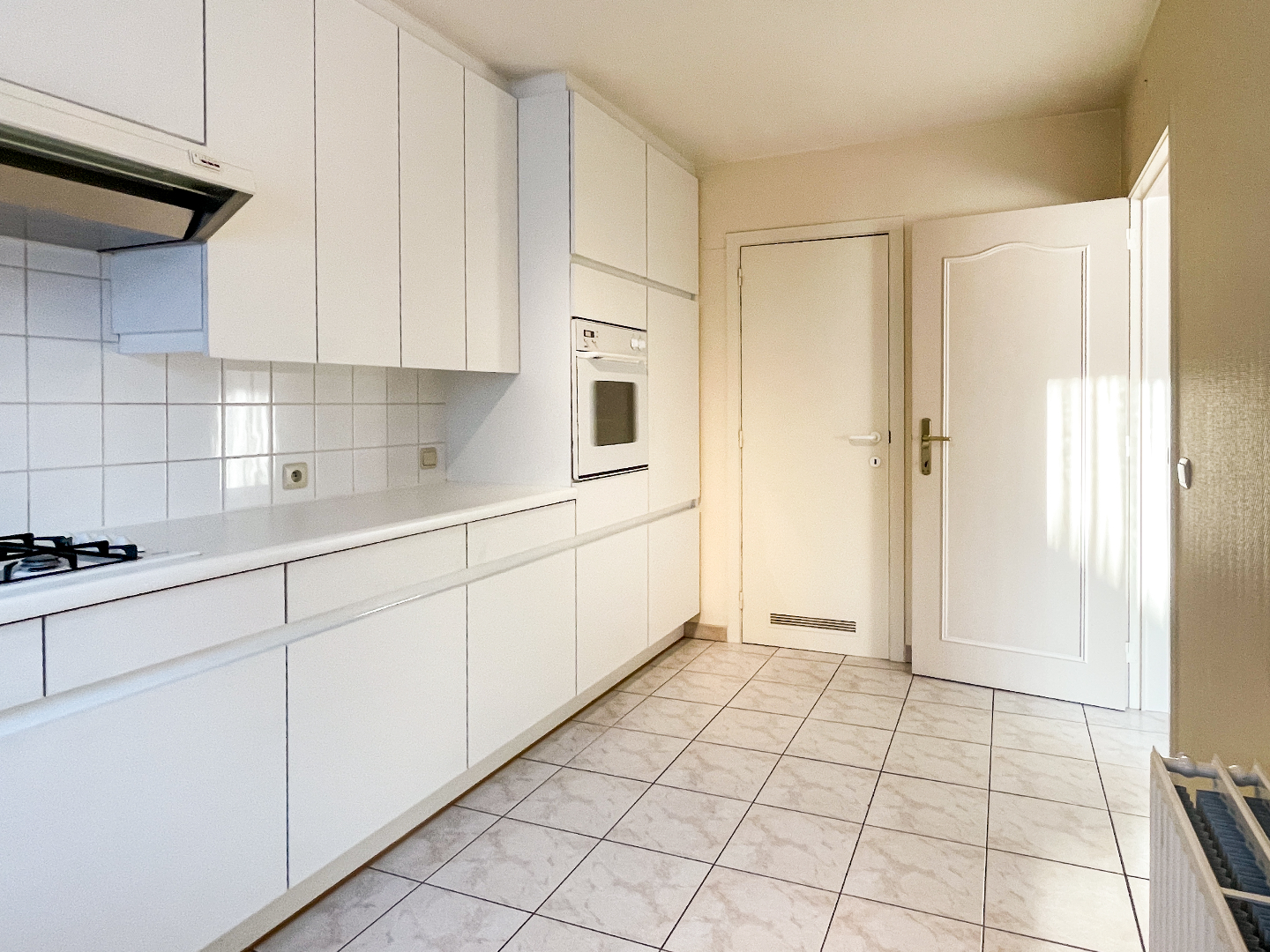 Ruime inkom met apart toilet, vestiaire en 3 slaapkamers. De leefruimte is bijzonder ruim en heeft 2 grote raampartijen. Een lichtrijk appartement! Aansluitend is de zeer grote keuken. Volledig geïnstalleerd en vooral vele kastruimte. Om de hoek is de berging, terug een ruime berging!
