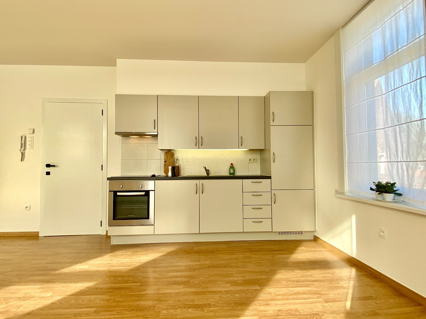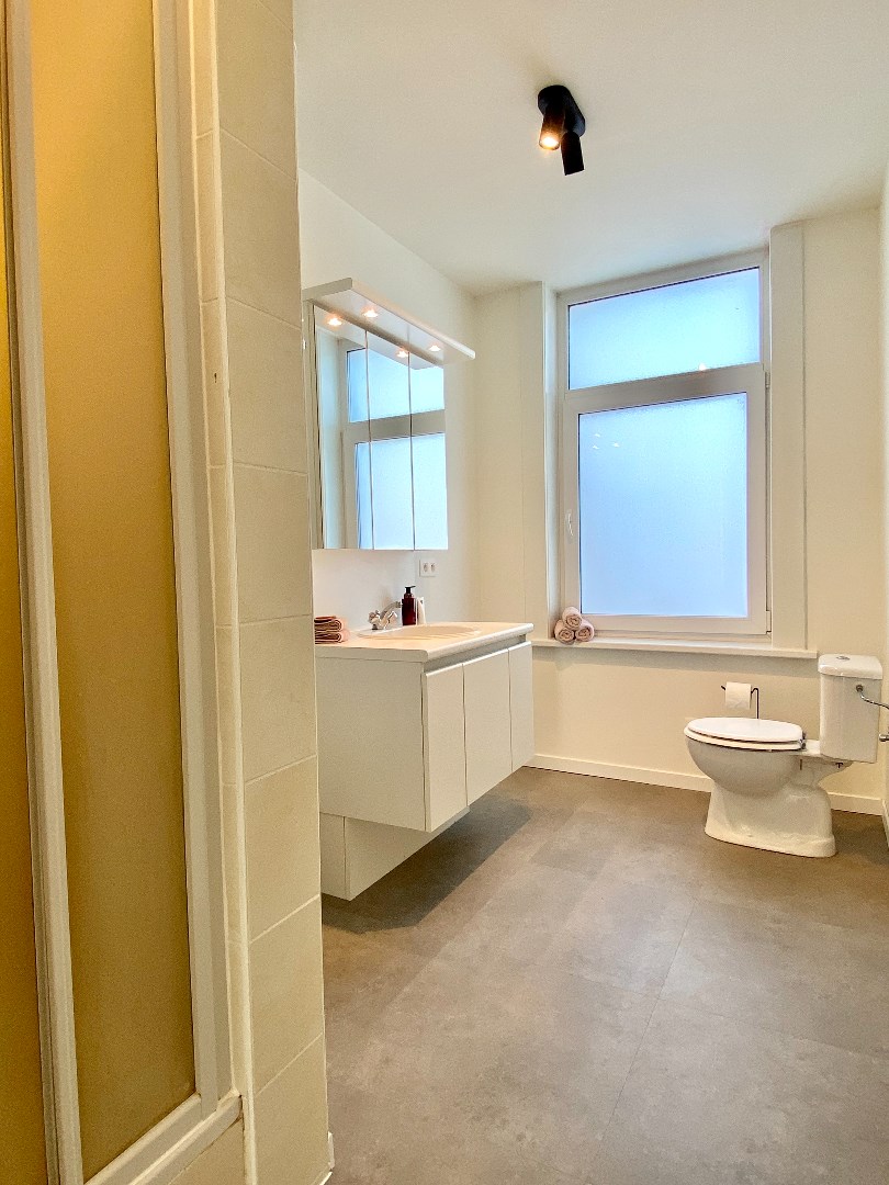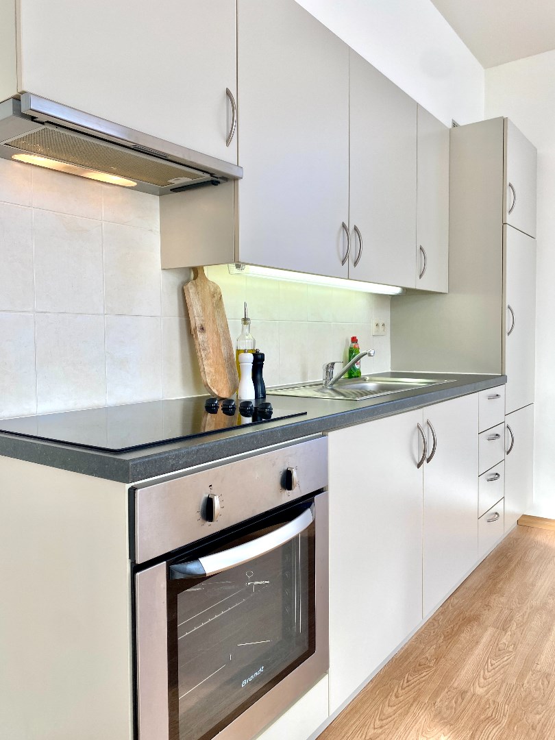 Het appartement beschikt over een open, volledig uitgeruste keuken (fornuis, oven, dampkap en frigo), ideaal voor wie van koken houdt. Er is één slaapkamer aanwezig, geschikt voor een alleenstaande of een koppel, en de badkamer is uitgerust met een douche, een lavabo in meubel en spiegelkast en toilet. Gordijnen en verlichting zijn voorzien.