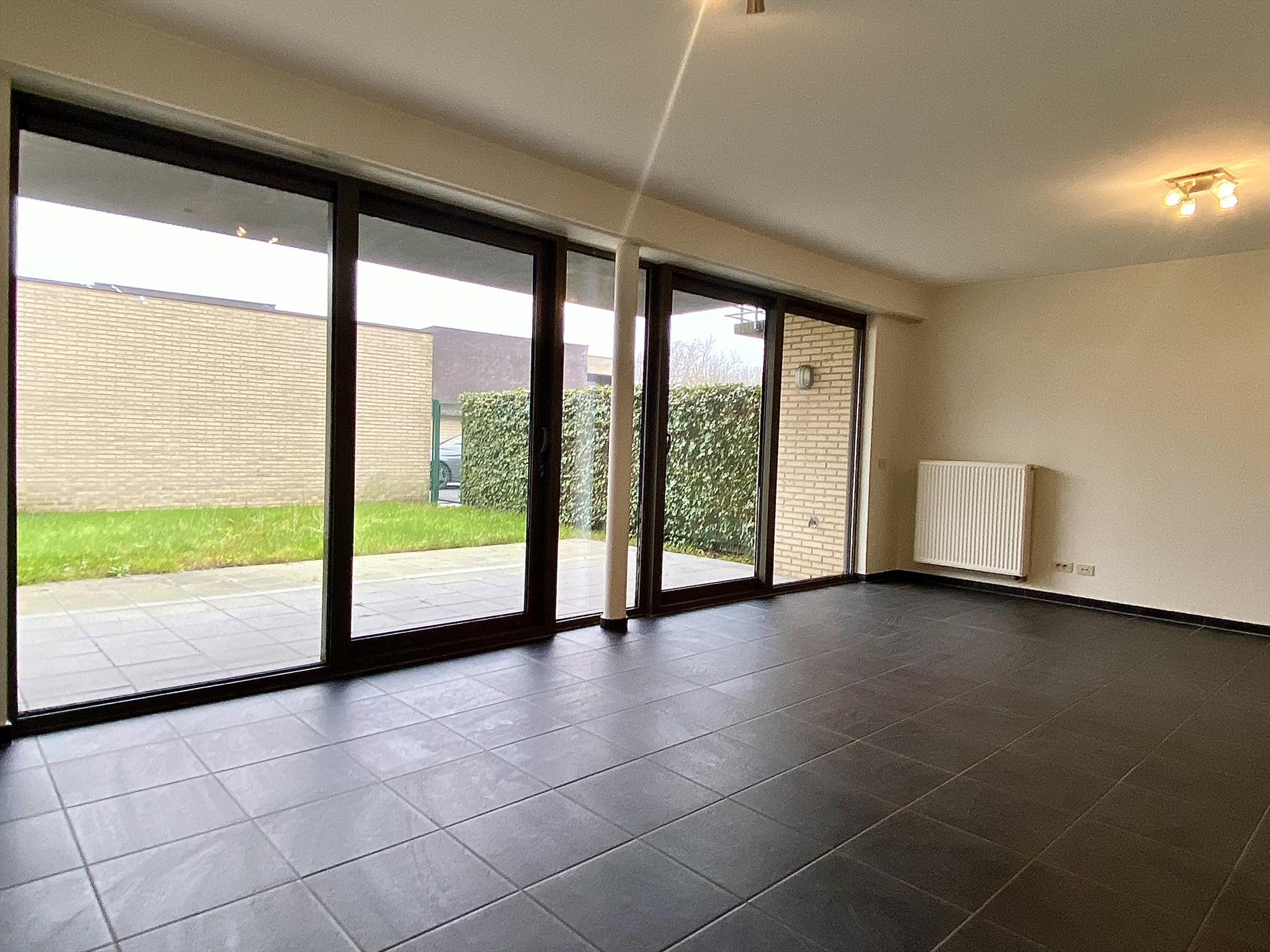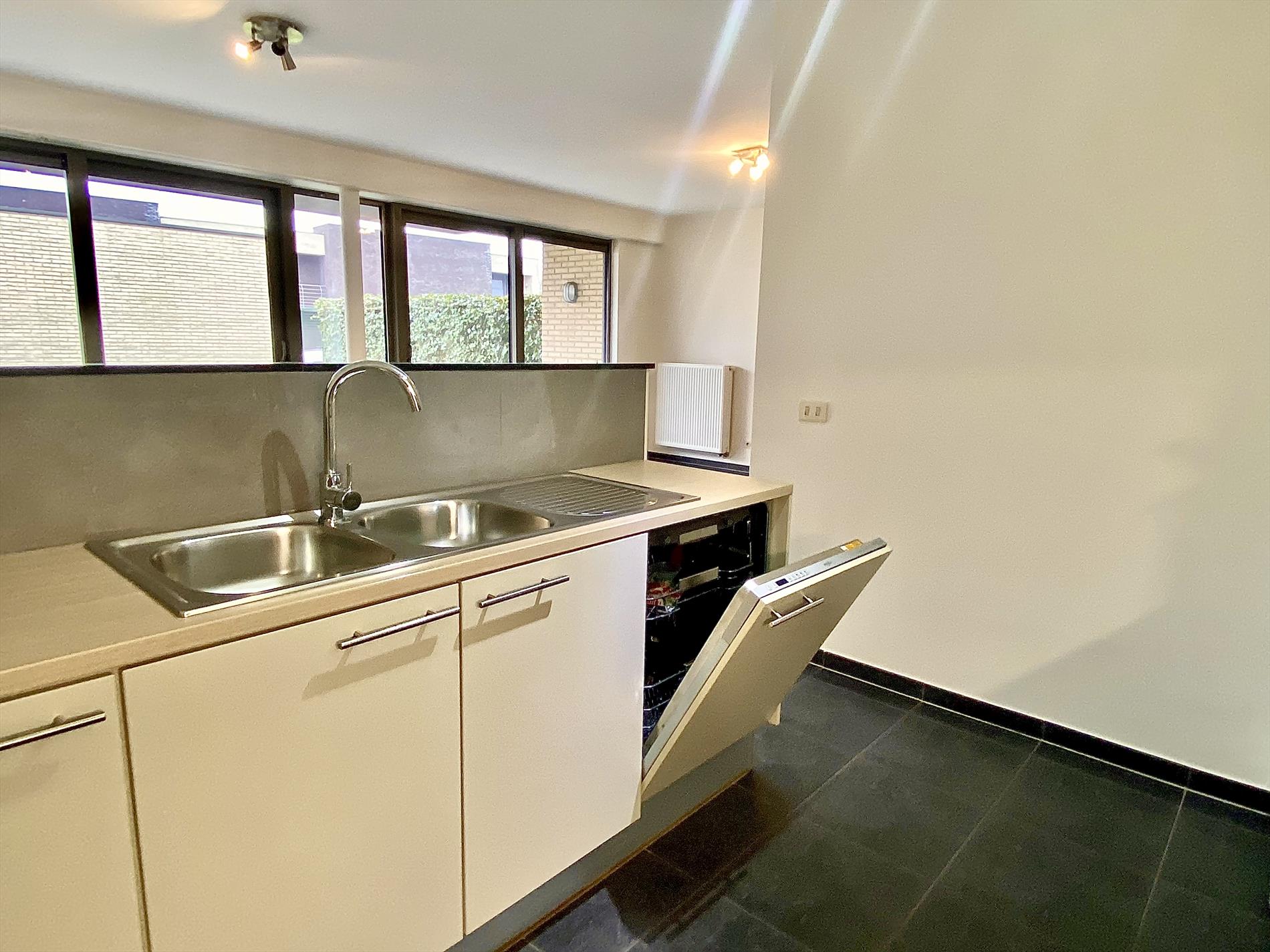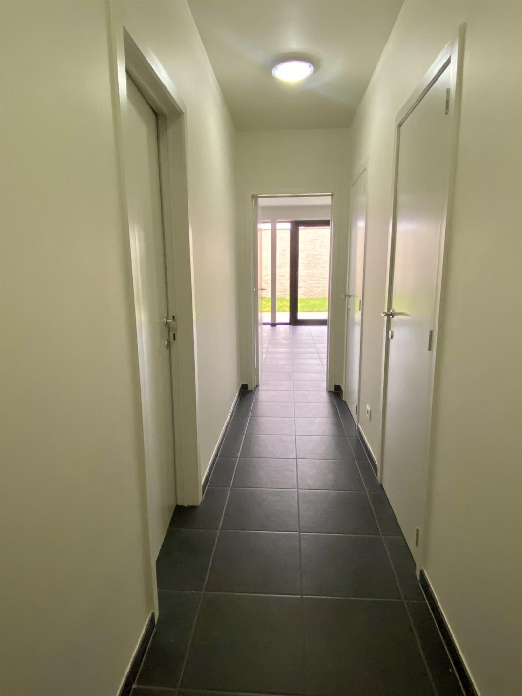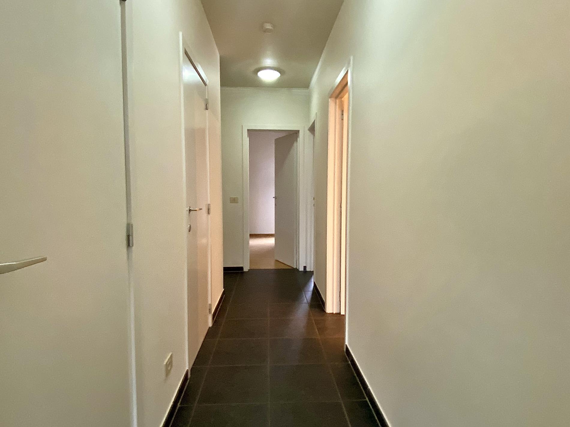 Als we binnenkomen in het appartement hebben we op onze linkerkant en de deur recht voor ons de twee slaapkamers met een gedeeld terrasje. Lopen we dan door de gang bevindt de ruime badkamer met inloopdouche en dubbele lavabo zich op de linkerkant, op de rechterkant het aparte toilet. Naast het aparte toilet is er ook een opbergruimte waar aansluiting voorzien is voor een wasmachine. Als we de gang doorgelopen zijn komen we in de lichtrijke woonkamer met de volledig uitgeruste keuken aanpalend. En hier stopt het niet, er is ook een zuidgerichte tuin aanwezig die mooi is afgesloten.