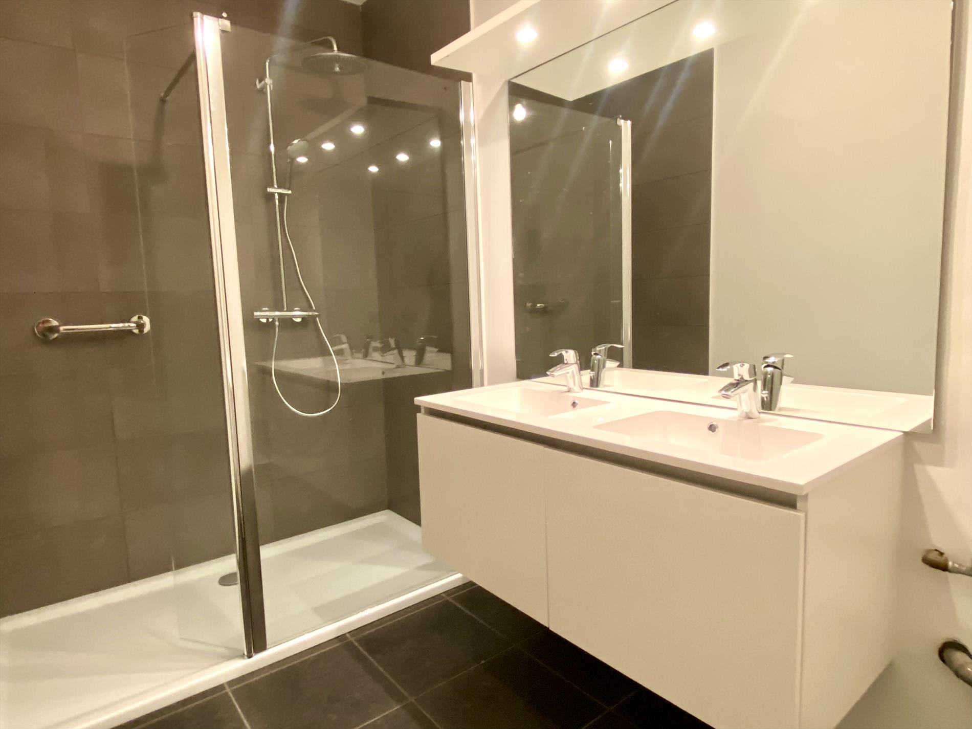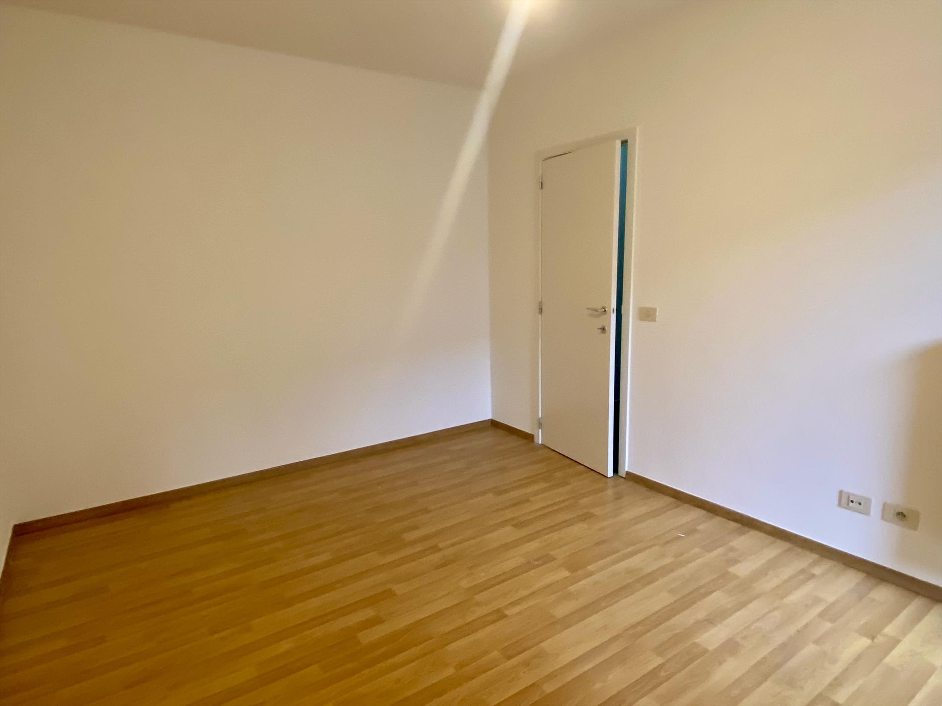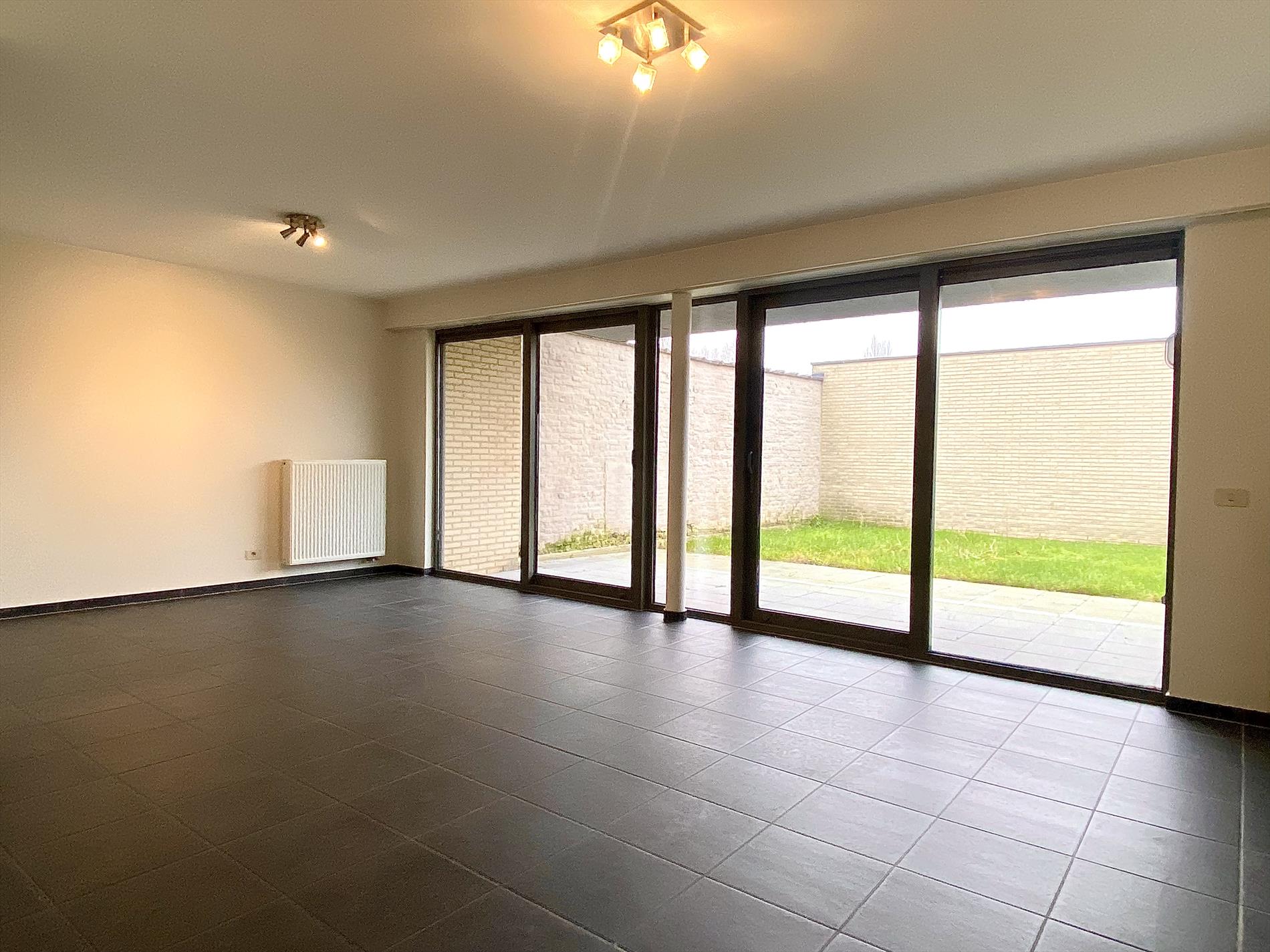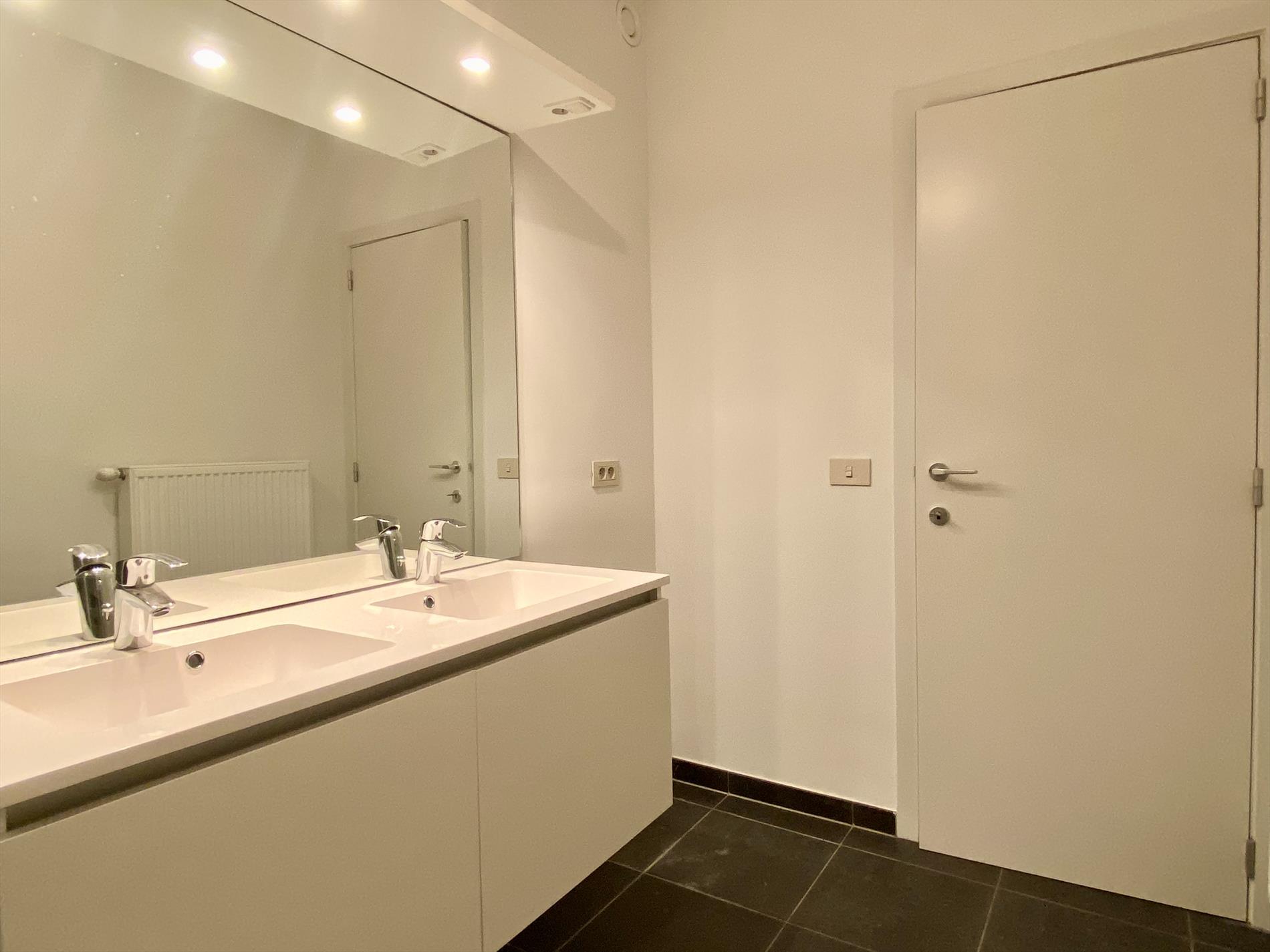 Als we binnenkomen in het appartement hebben we op onze linkerkant en de deur recht voor ons de twee slaapkamers met een gedeeld terrasje. Lopen we dan door de gang bevindt de ruime badkamer met inloopdouche en dubbele lavabo zich op de linkerkant, op de rechterkant het aparte toilet. Naast het aparte toilet is er ook een opbergruimte waar aansluiting voorzien is voor een wasmachine. Als we de gang doorgelopen zijn komen we in de lichtrijke woonkamer met de volledig uitgeruste keuken aanpalend. En hier stopt het niet, er is ook een zuidgerichte tuin aanwezig die mooi is afgesloten.