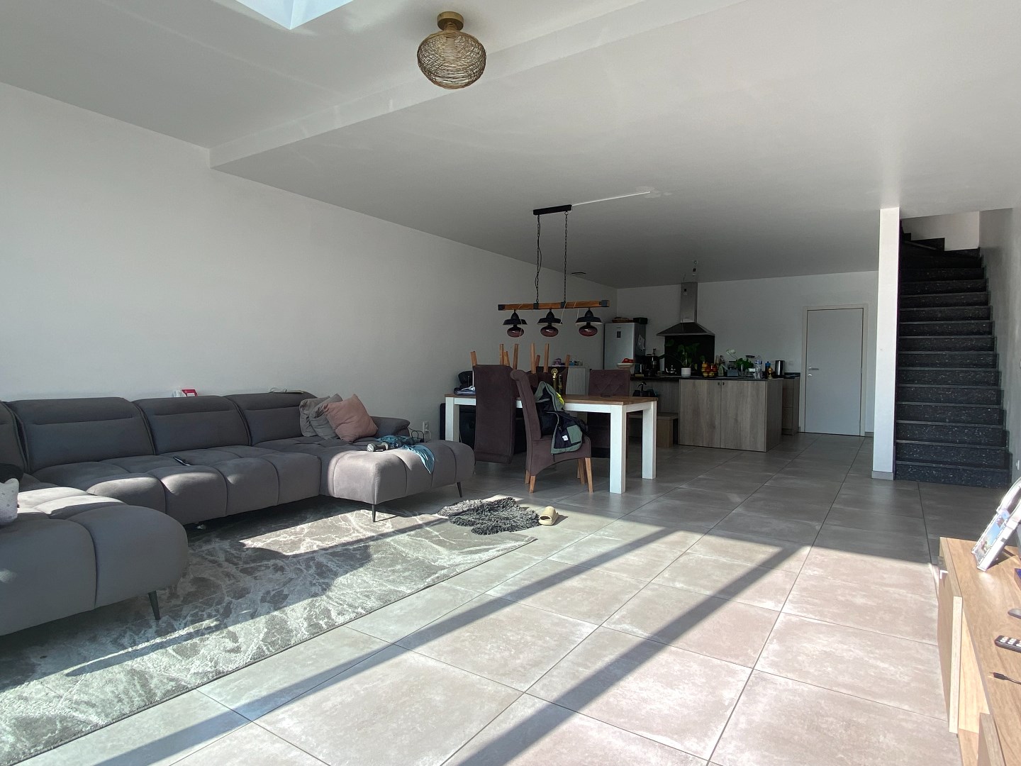 De woning heeft 2 deuren aan de voorgevel. Een van deze is de klassieke inkomstdeur maar de andere is deze naar de berging. Zo kan uw fiets binnen gestald worden. De entree heeft een apart toilet en brengt ons naar de open keuken. Deze is volledig geïnstalleerd en heeft een aangenaam zicht over terras en zuid-gerichte tuin.