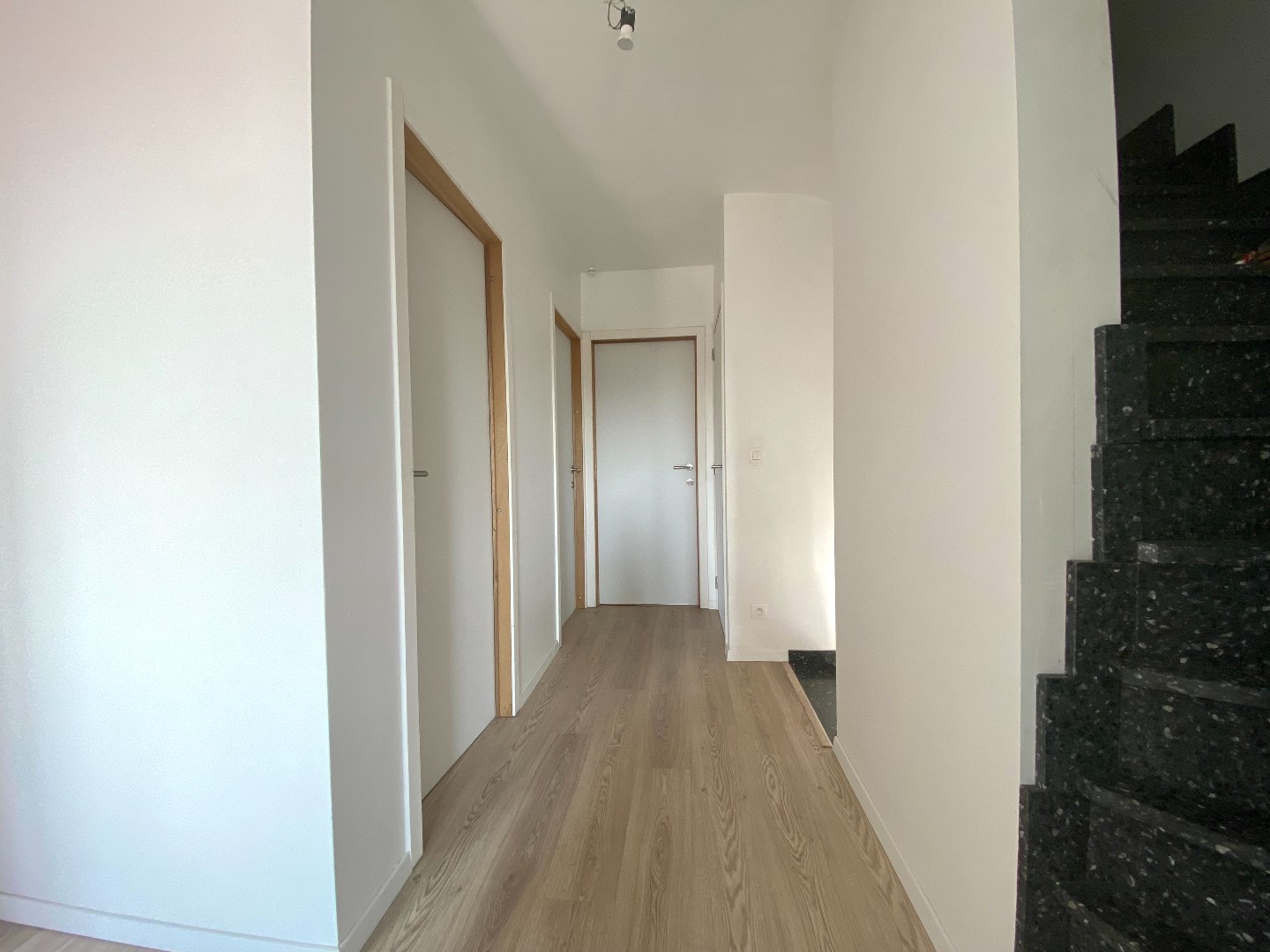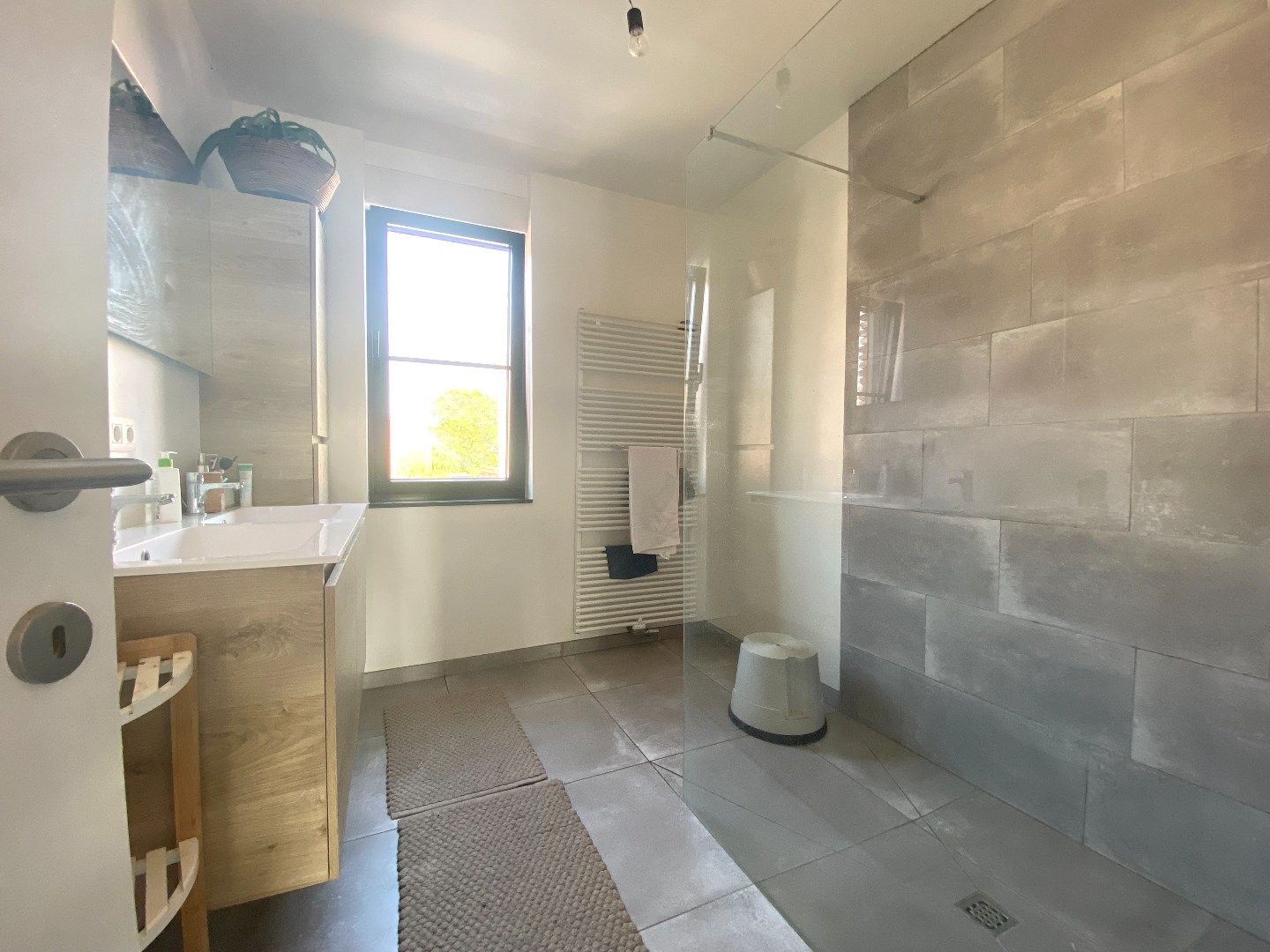Het verdiep bevat 3 echt ruime slaapkamers en centraal een kamer voor was en droogkastvoorziening. Verder is er een apart toilet op de gang en een badkamer met inloopdouche.