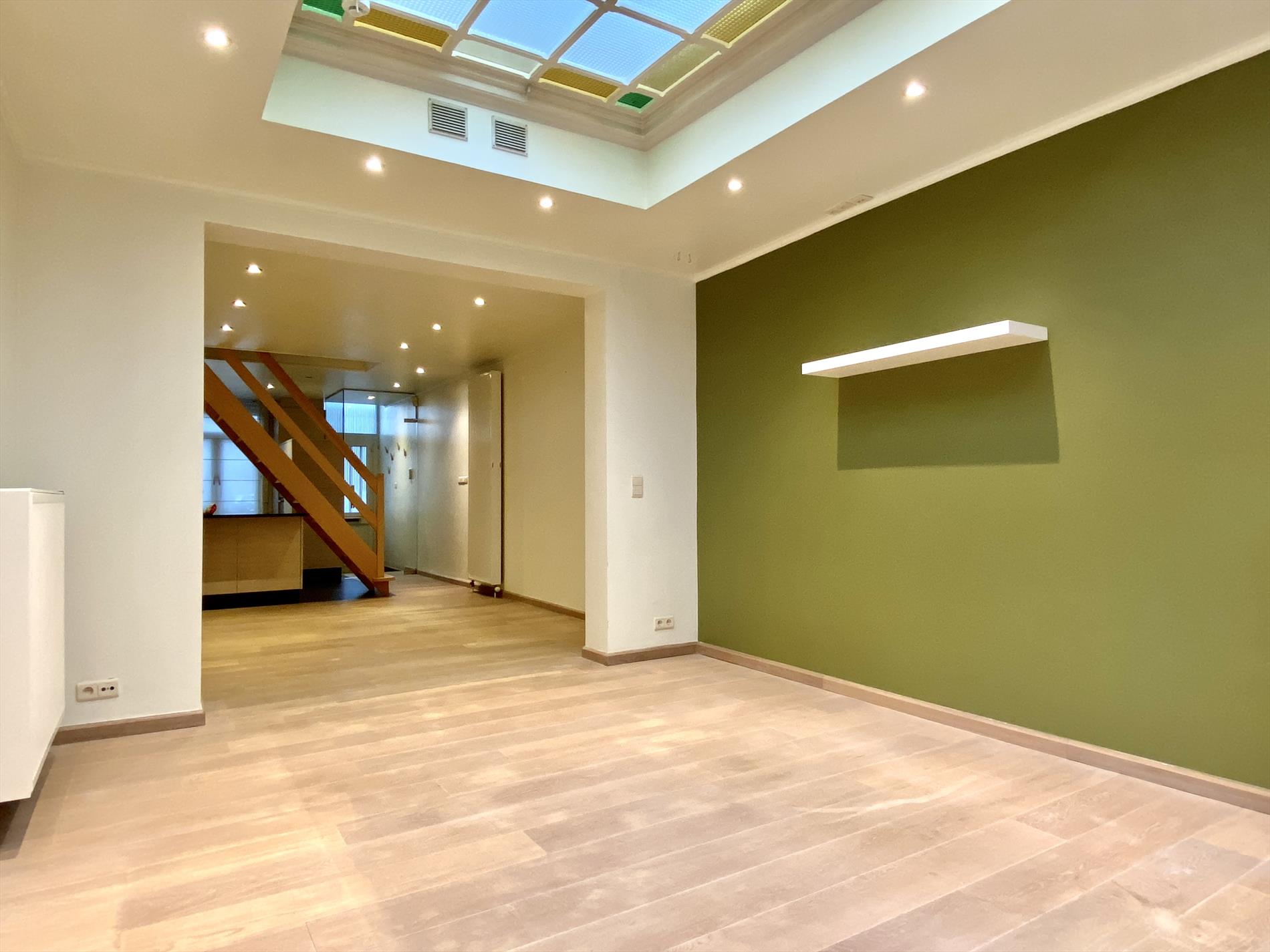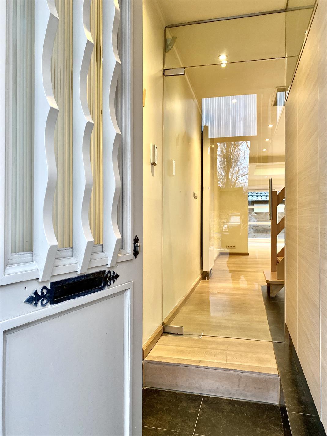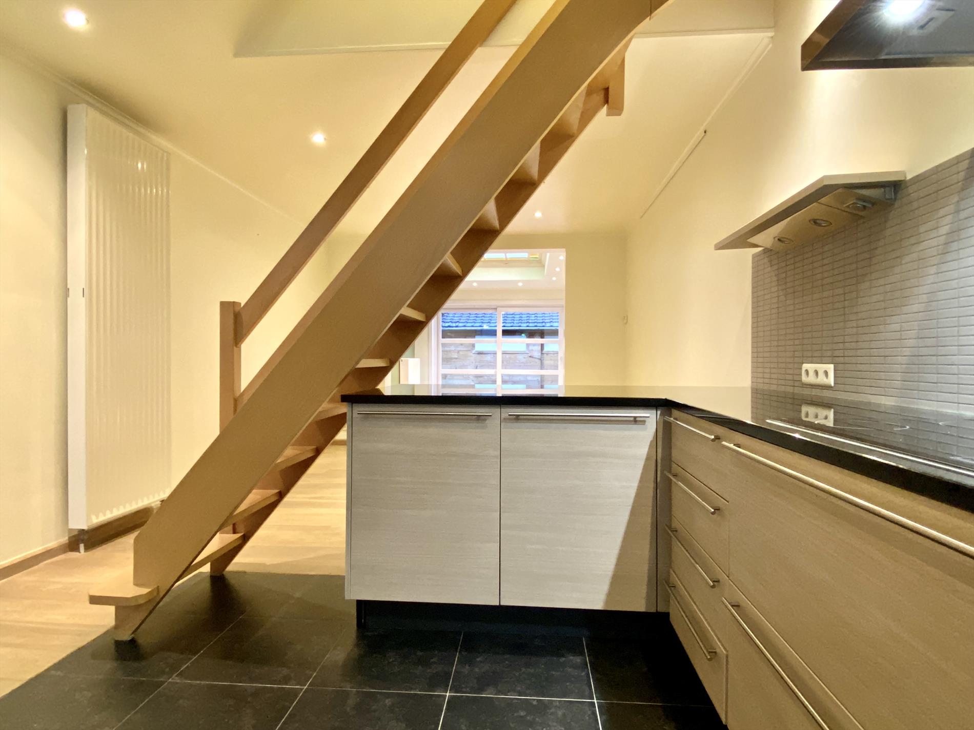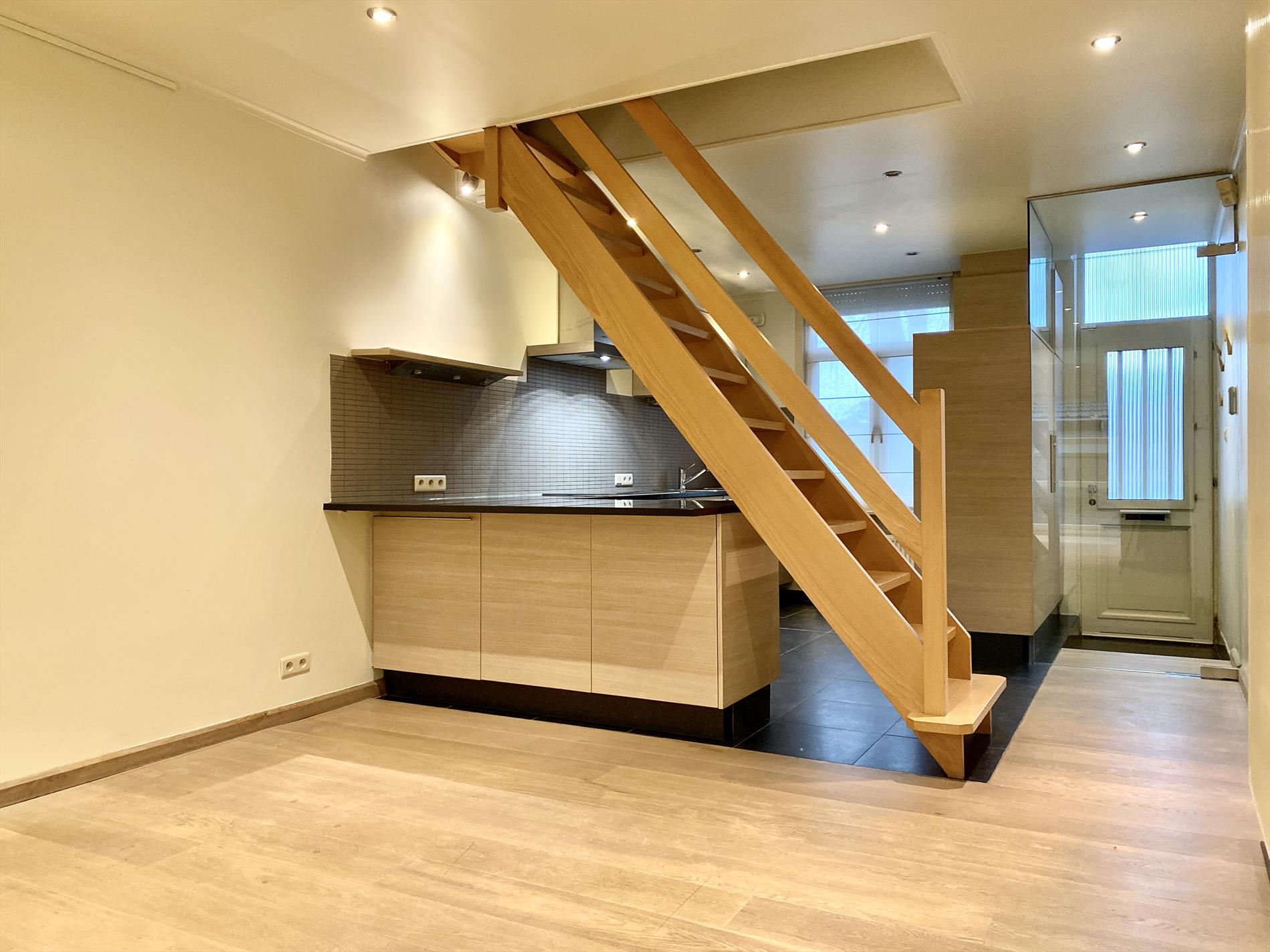 Recent is deze woning gerenoveerd met respect voor enkele karakteristieke elementen. Inkom met glazen tussendeur, aansluitend is er de open keuken met vele kastberging, alle benodigde toestellen en een natuurstenen werkblad.