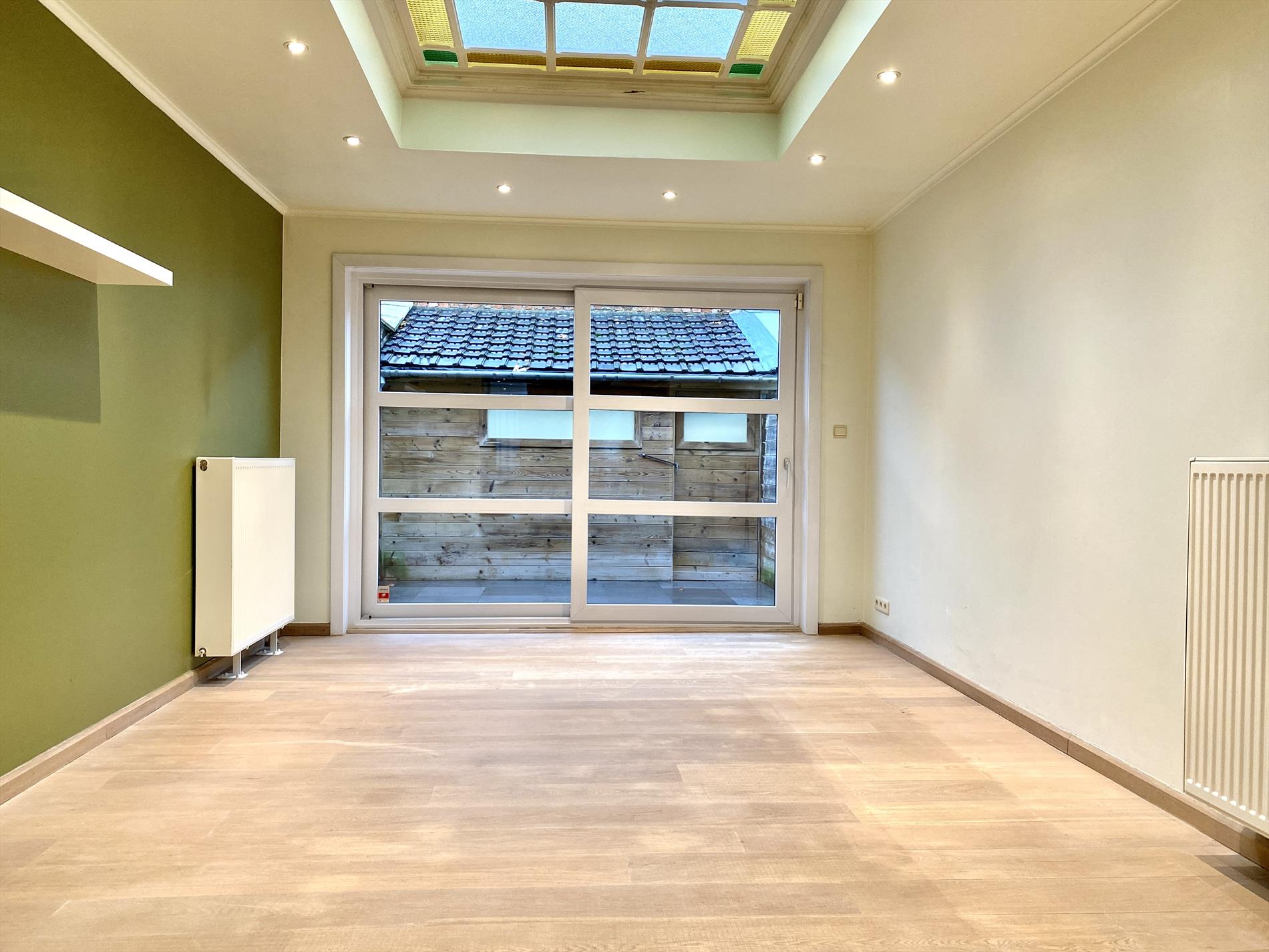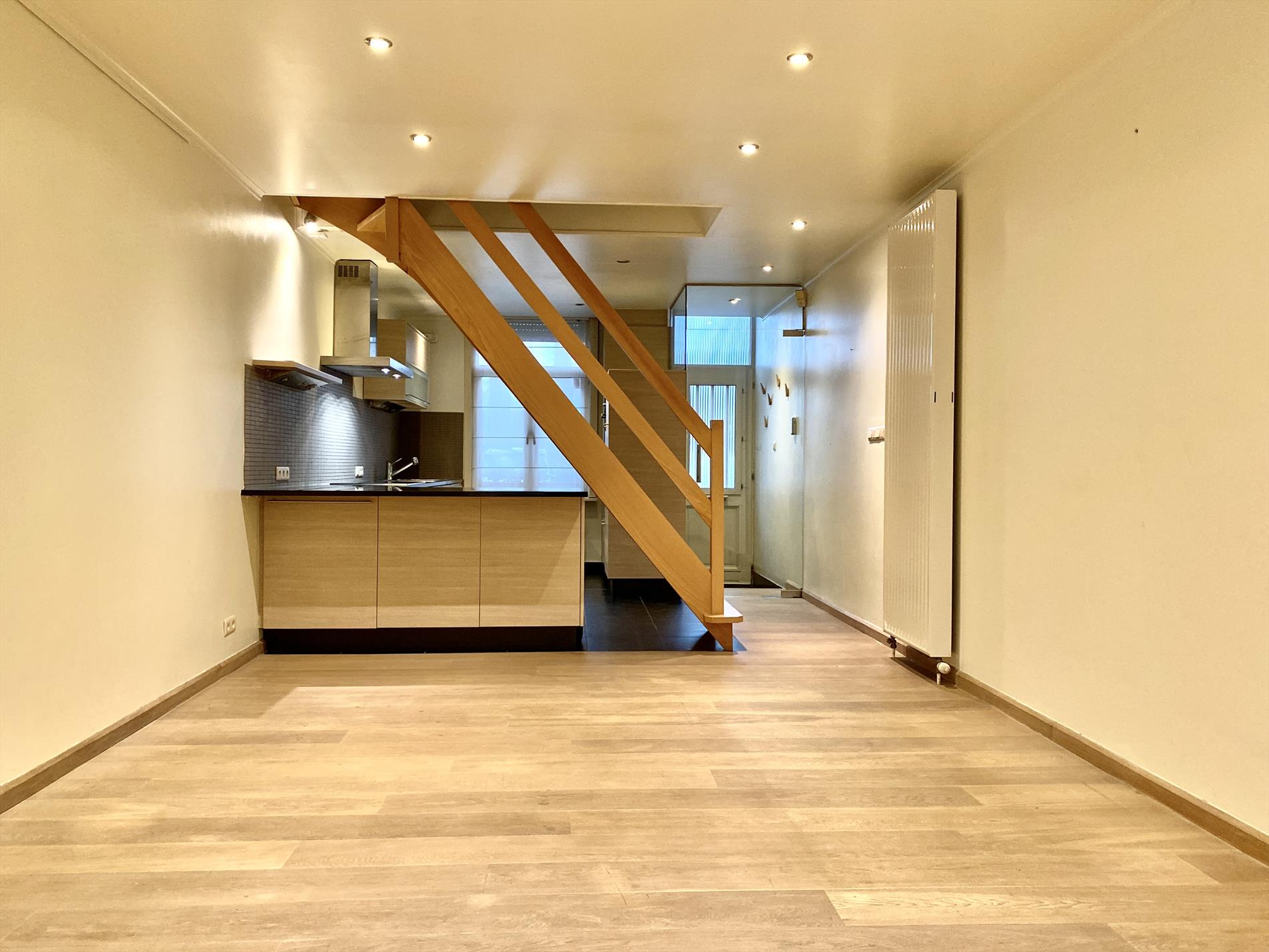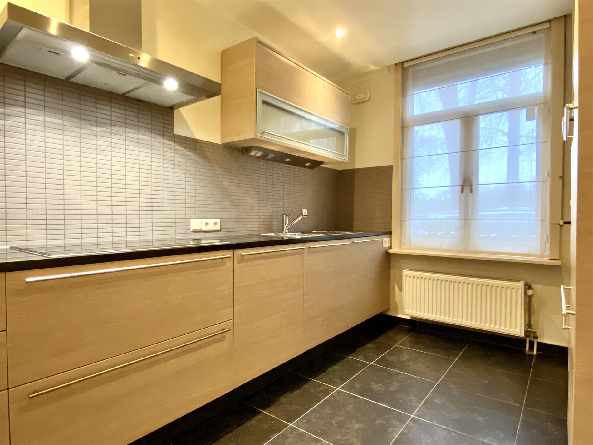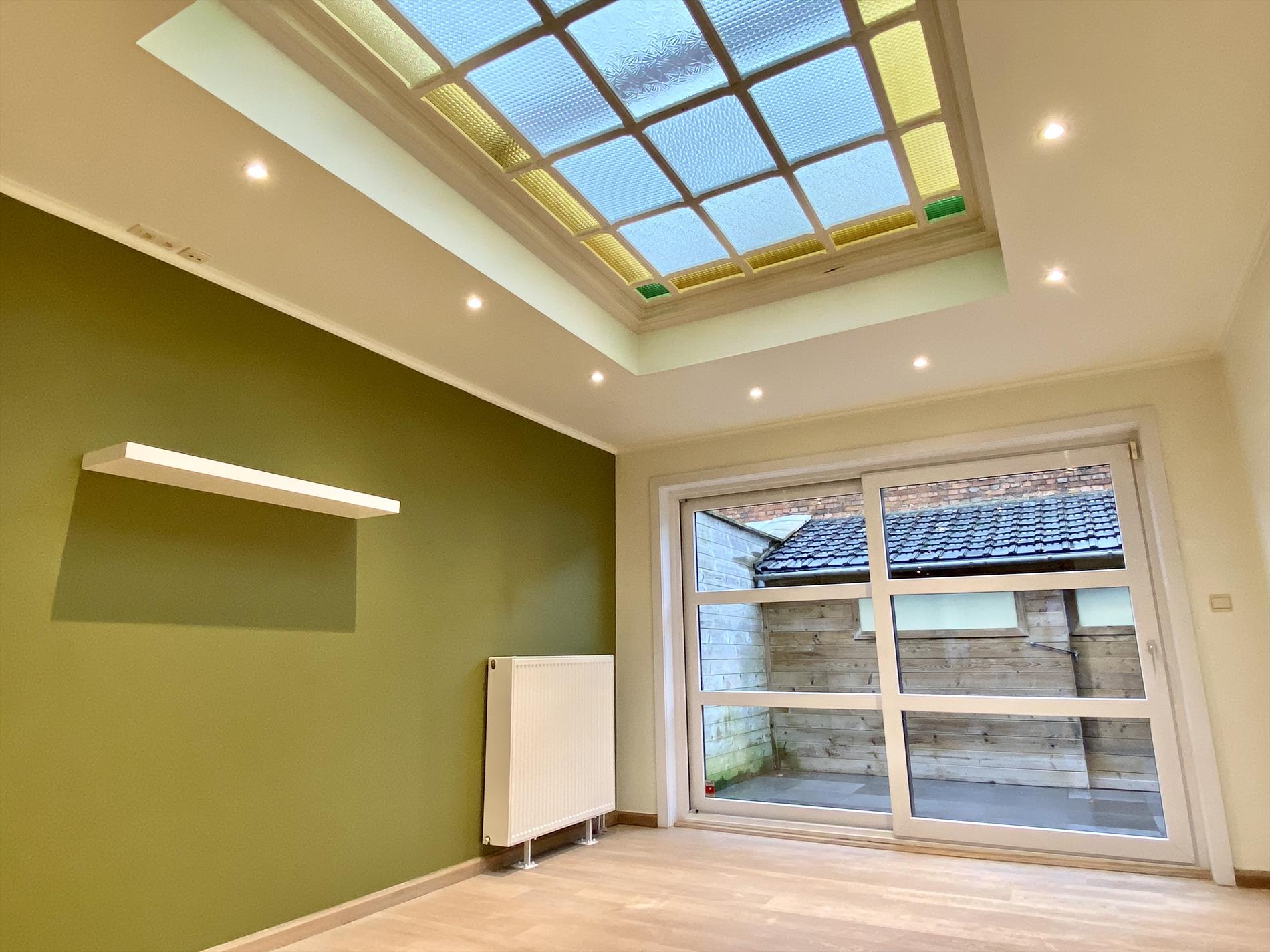 Recent is deze woning gerenoveerd met respect voor enkele karakteristieke elementen. Inkom met glazen tussendeur, aansluitend is er de open keuken met vele kastberging, alle benodigde toestellen en een natuurstenen werkblad.