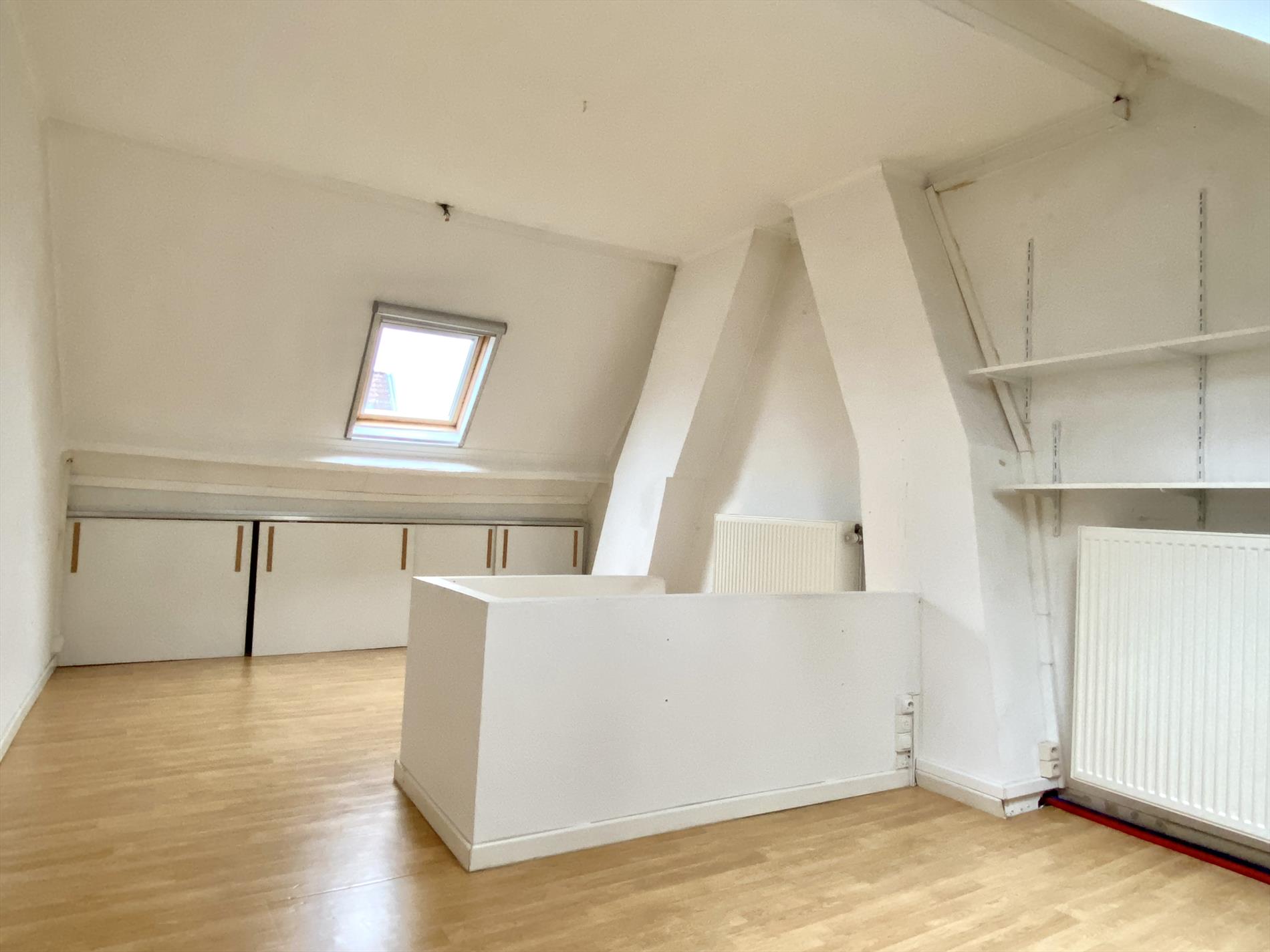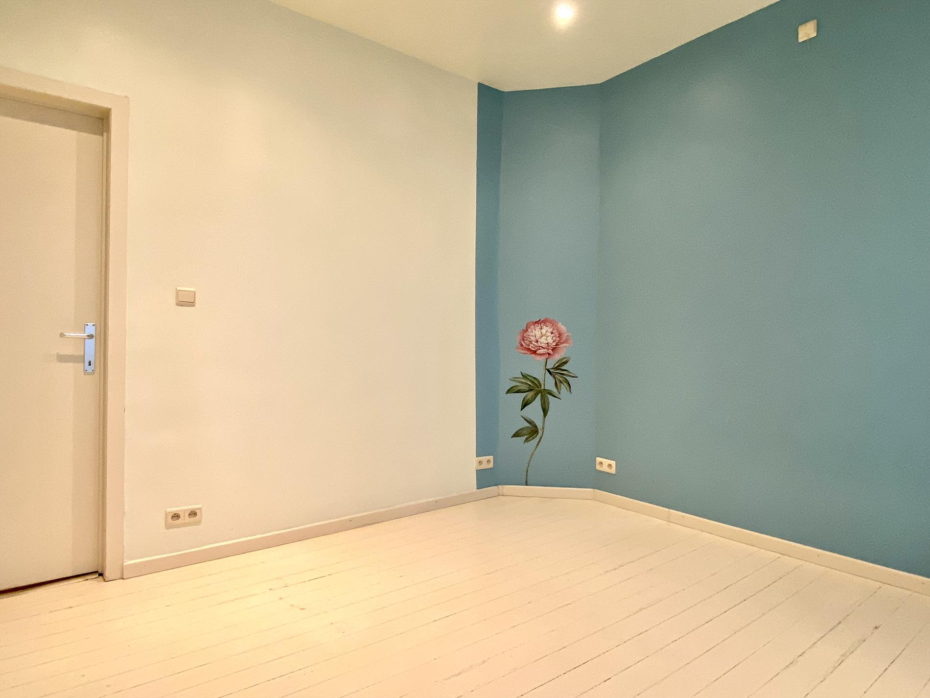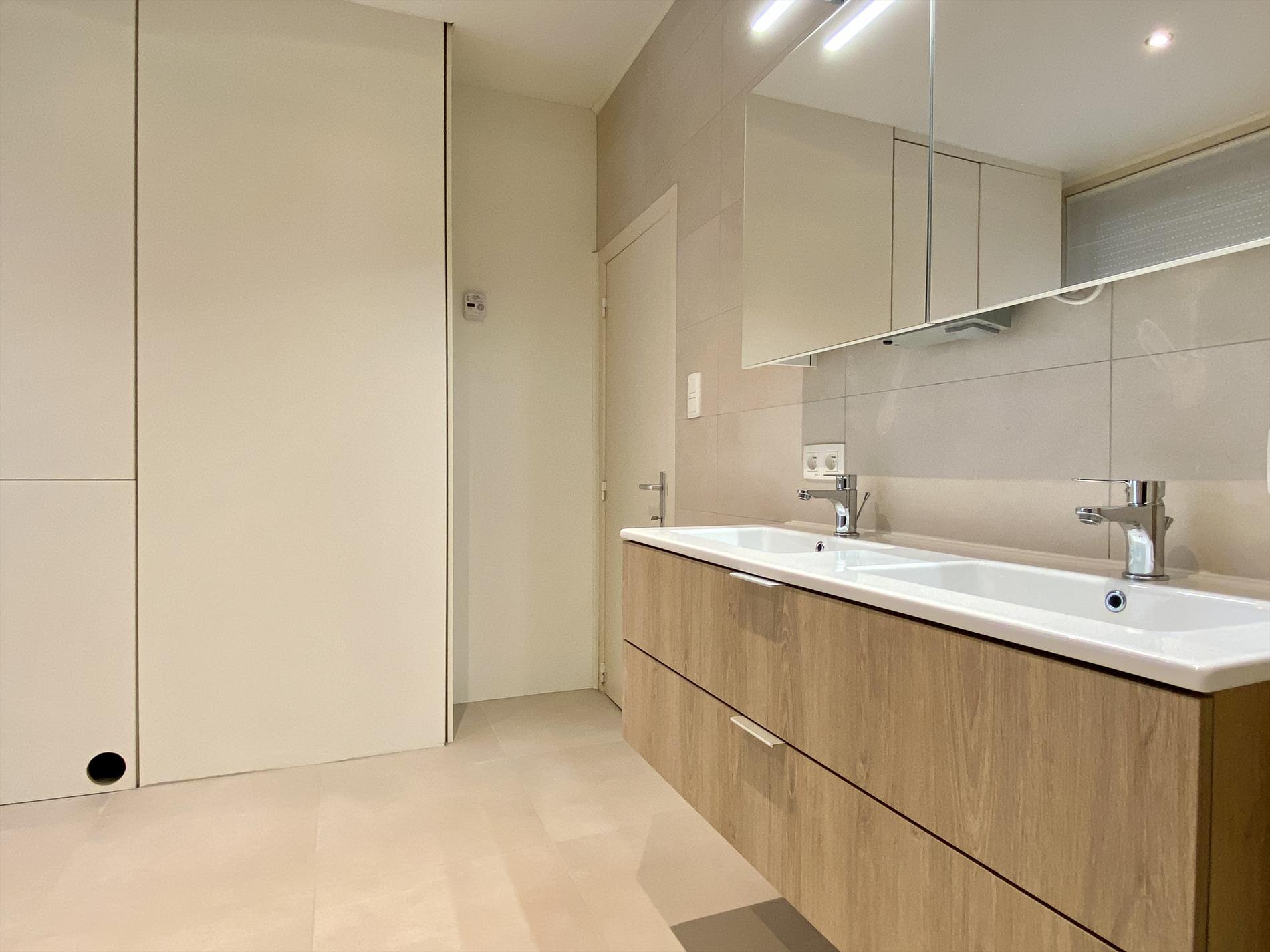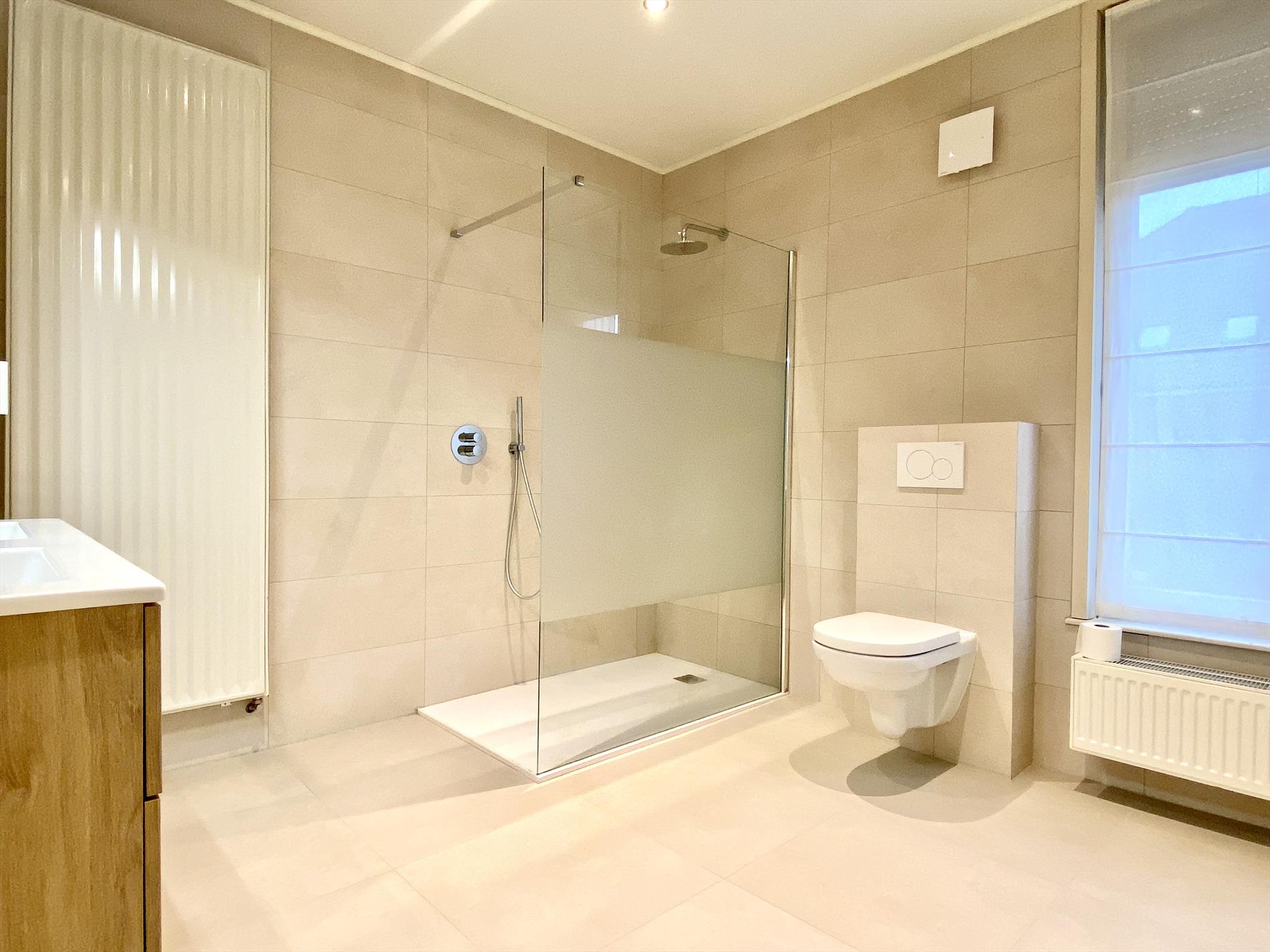 Het verdiep bevat een ruime slaapkamer (rolluiken aanwezig). De badkamer bevat een inloopdouche, toilet en dubbele wastafel met spiegelkast.