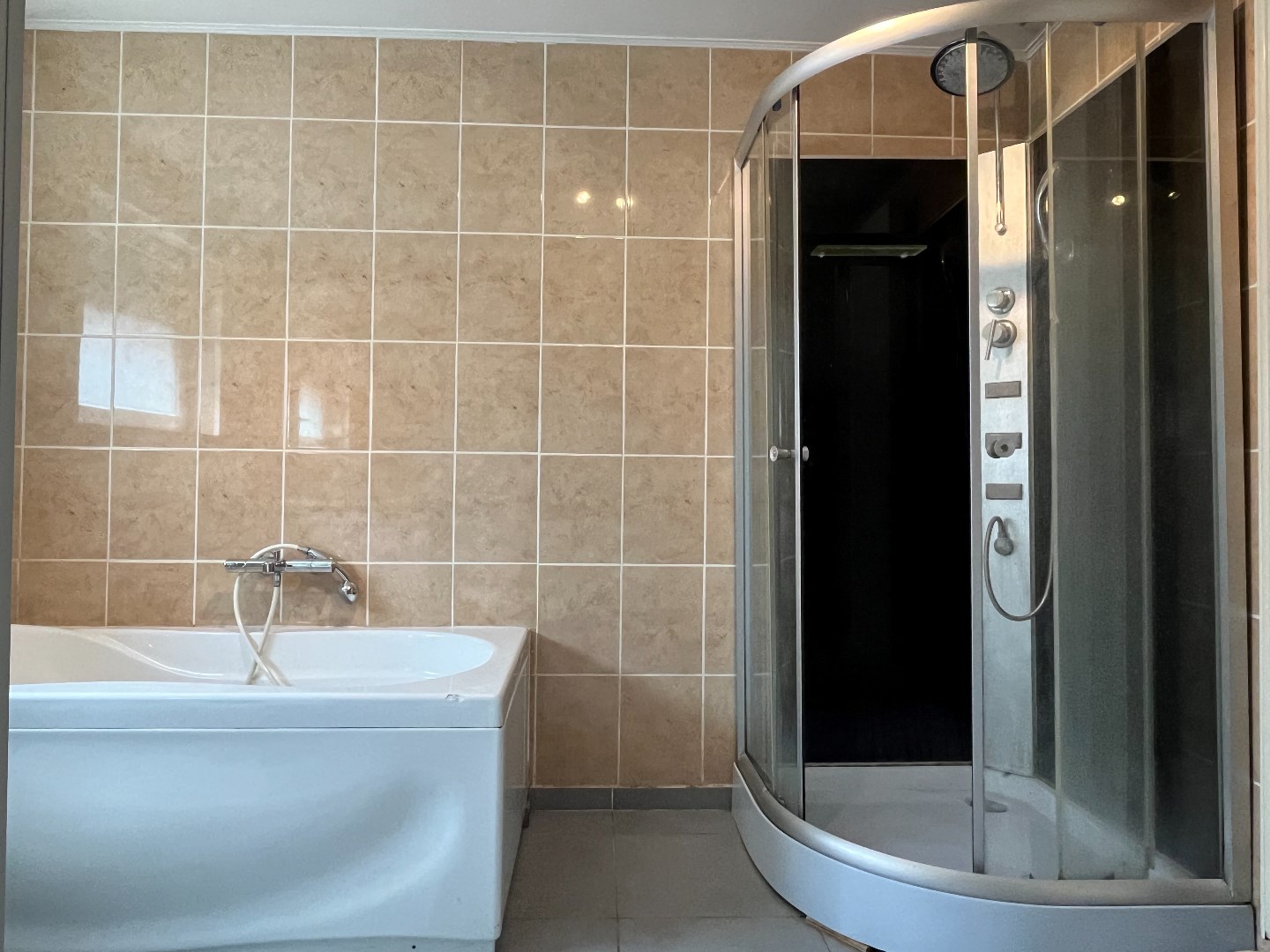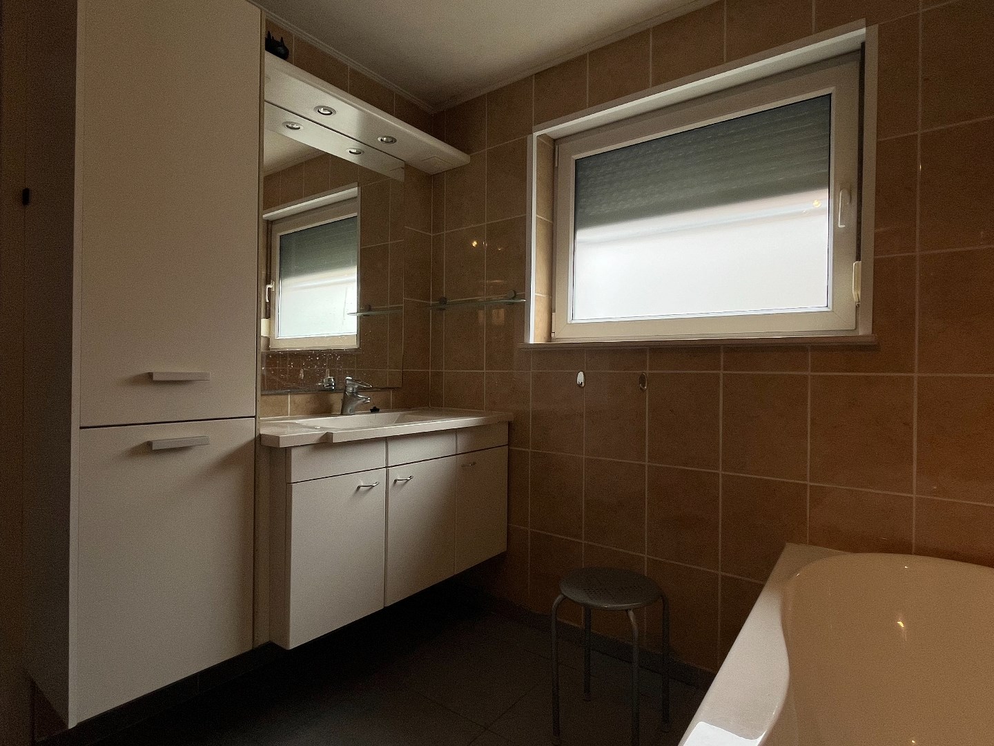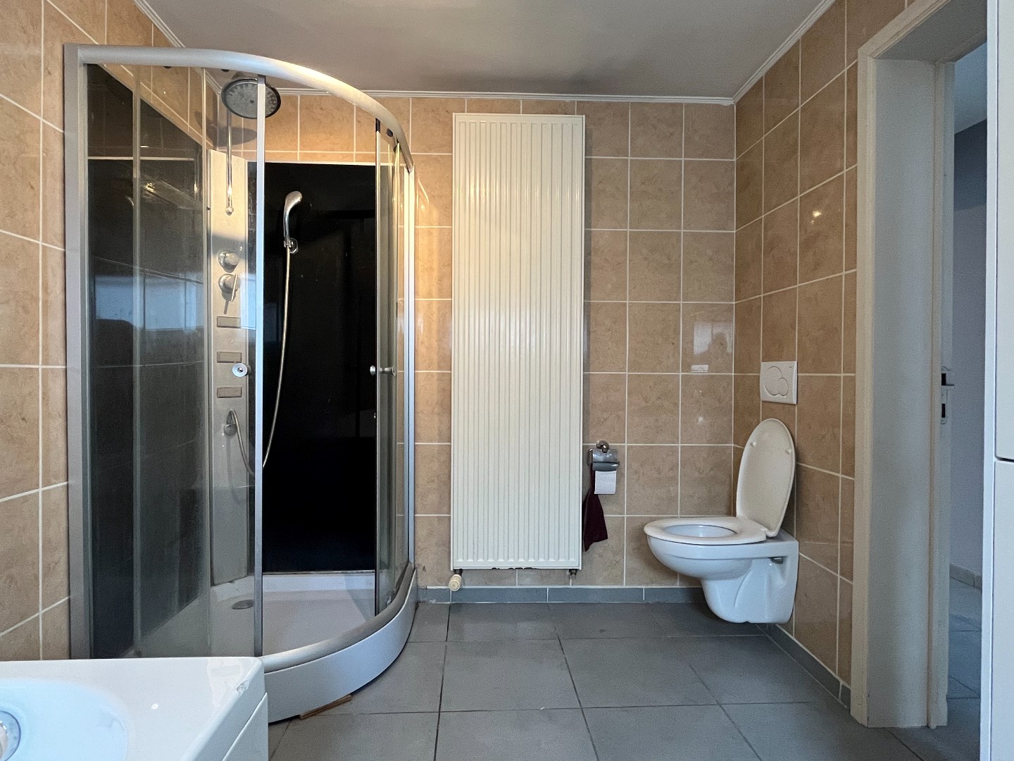 De badkamer bevindt zich op het gelijkvloers en is uitgerust met een bad, toilet, douche en lavabo.