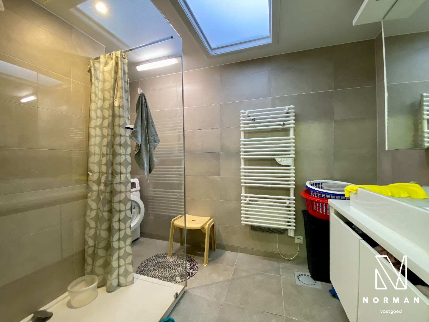 Achteraan is er een afzonderlijk toilet, badkamer met inloopdouche en dubbele lavabo.