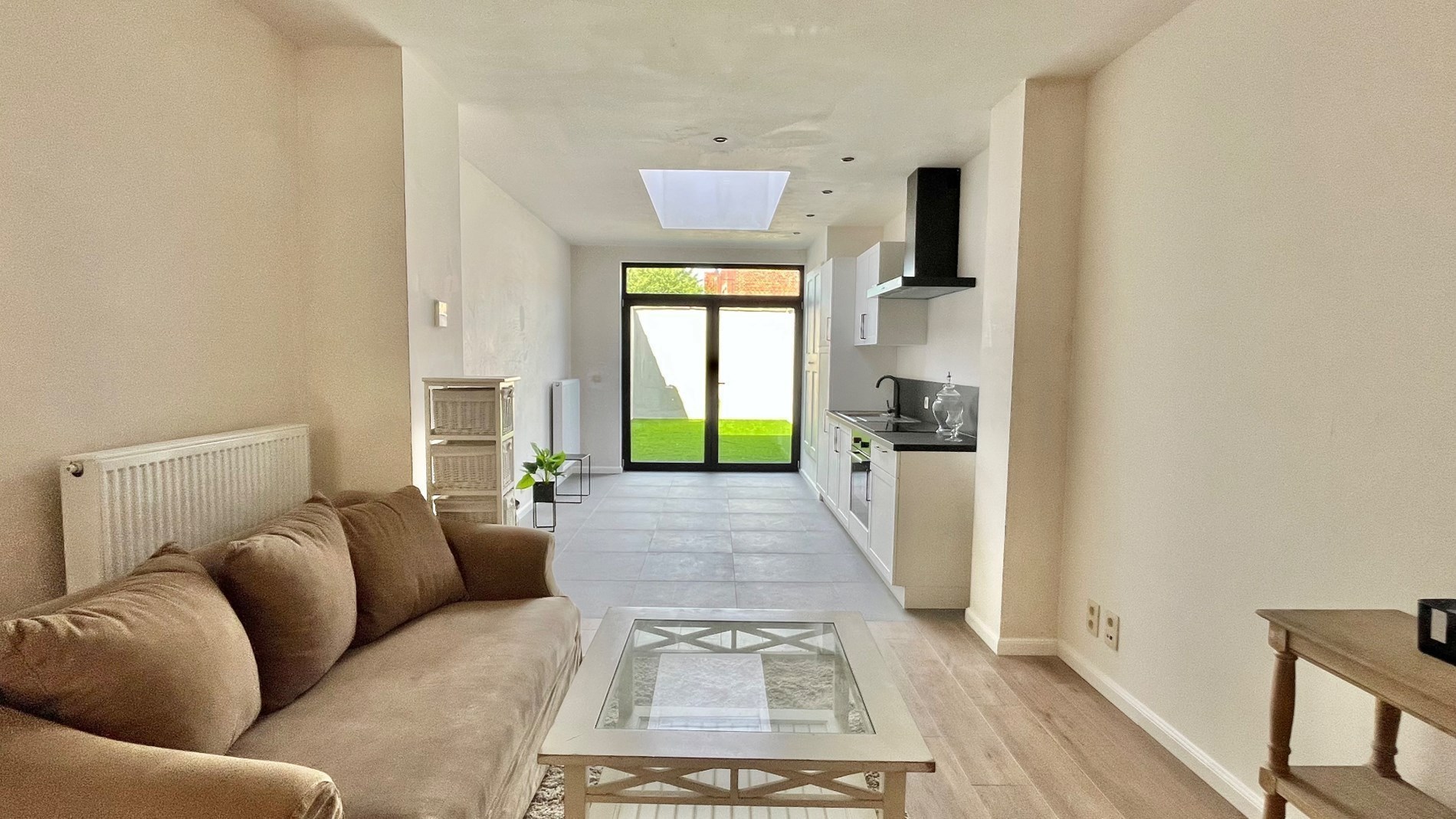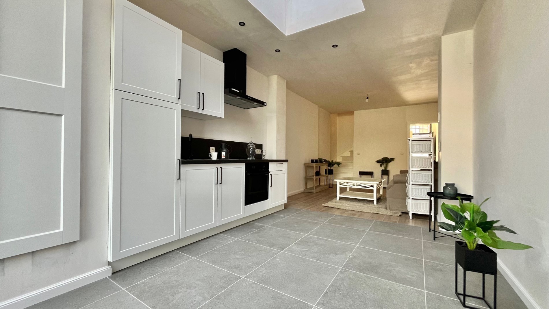 Bij het betreden van de woning kom je in de ruime inkomhal met een veelzijdige voorplaats, vb. perfect als bureauruimte of als berging. Aansluitend bevinden zich de kelder, de open leefruimte, met een moderne minimalistische keuken en een raampartij die uitkijkt op de aangename stadstuin.