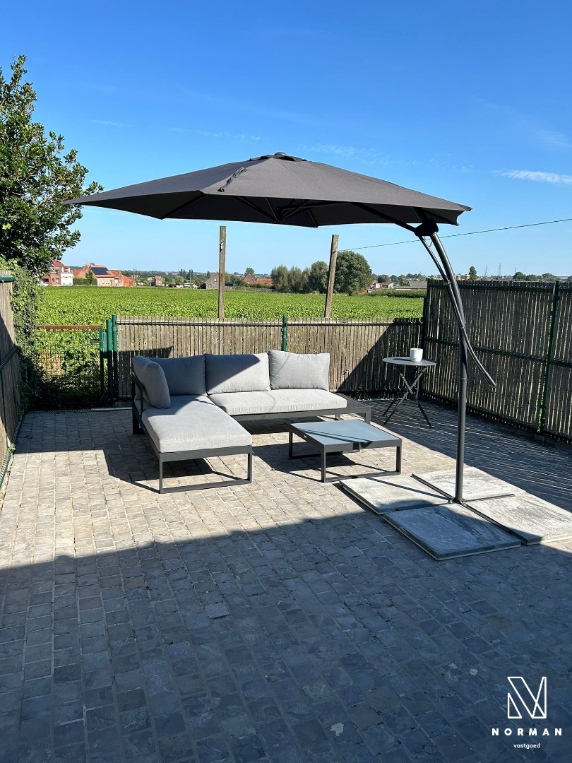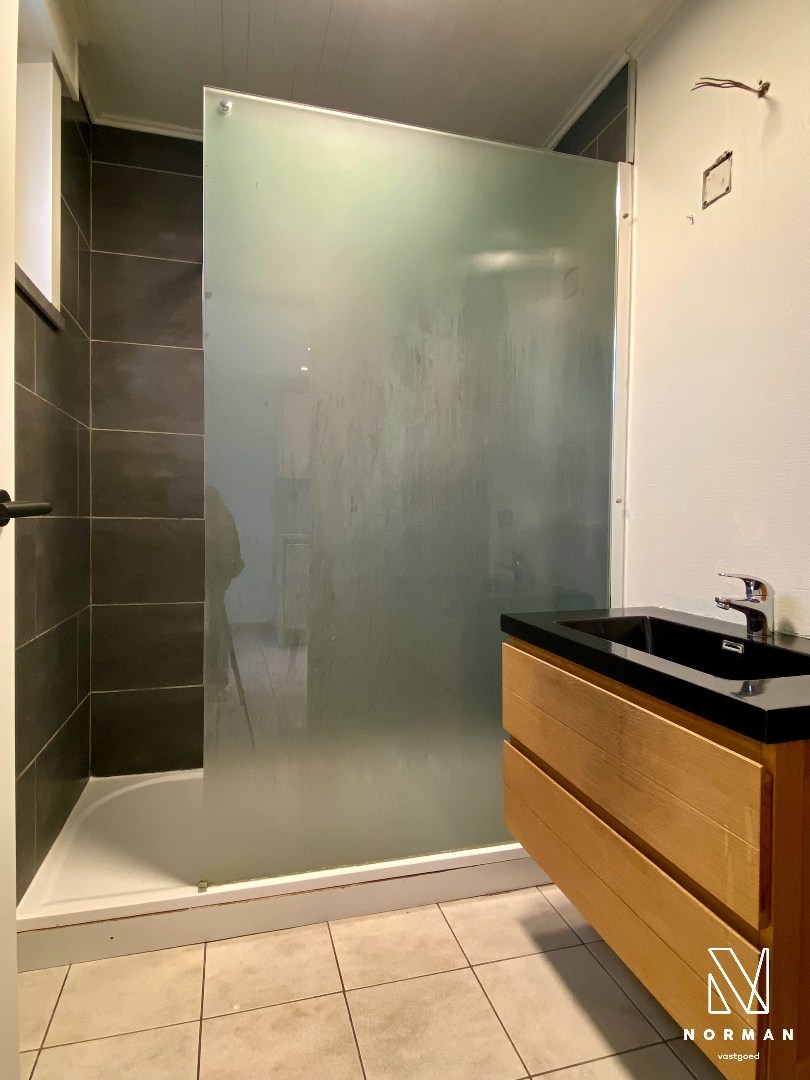 Achteraan is er een veranda die toegang biedt naar de achtertuin met zonneterras. Verder vinden we nog de badkamer beneden (lavabomeubel en inloopdouche) en een ruime berging met voorziening voor wasmachine en droogkast.
