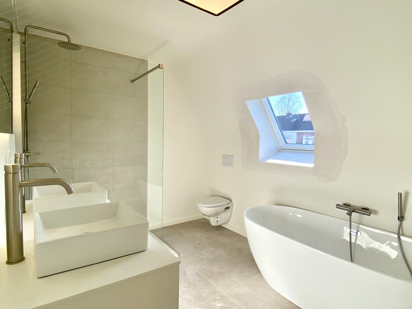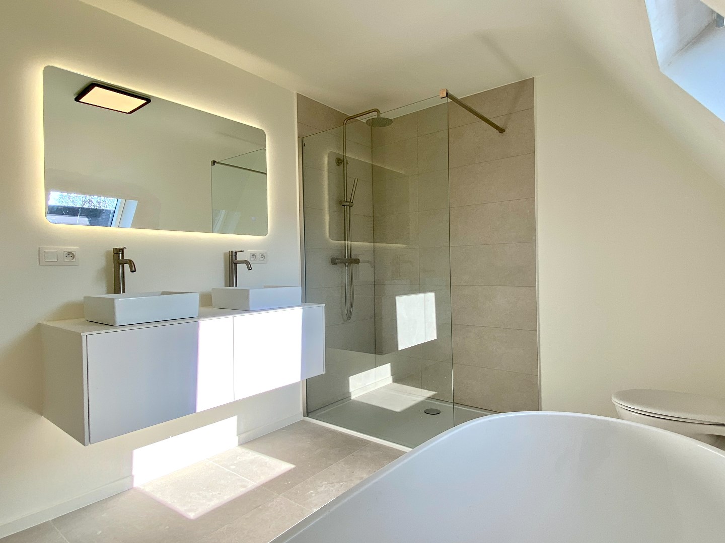 Het verdiep bevat 3 echt ruime slaapkamers en een badkamer. Deze heeft een inloopdouche, ligbad, dubbele wastafel en verlichte spiegel. (Hier moet de schilder nog enkele zaken afwerken).