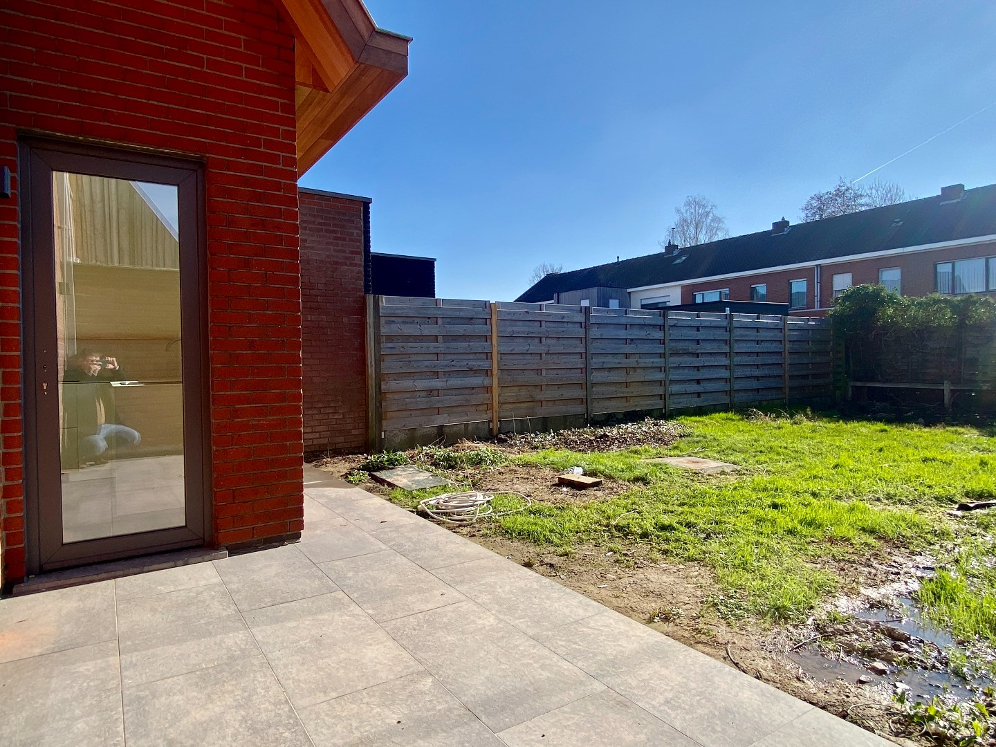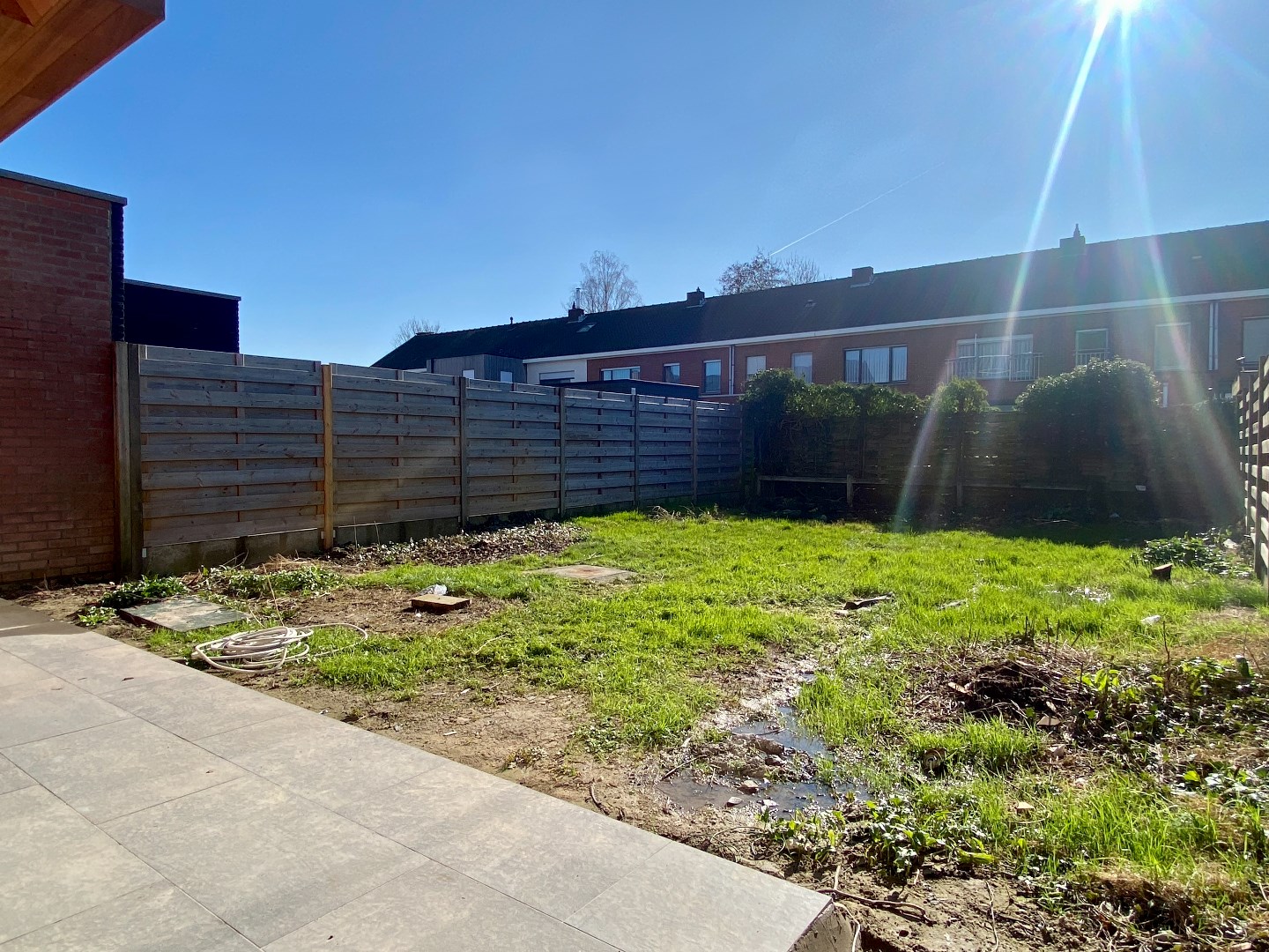 De tuin is volledig omheind, heeft een aangenaam terras en wordt nog opgehoogd met aarde, zodat het terras mooi overloopt in de tuin.