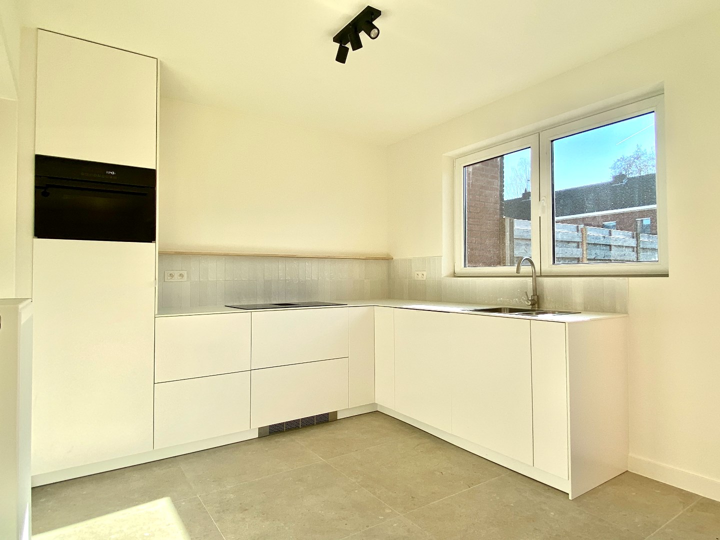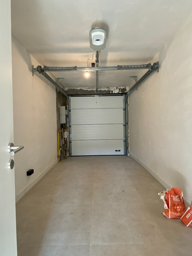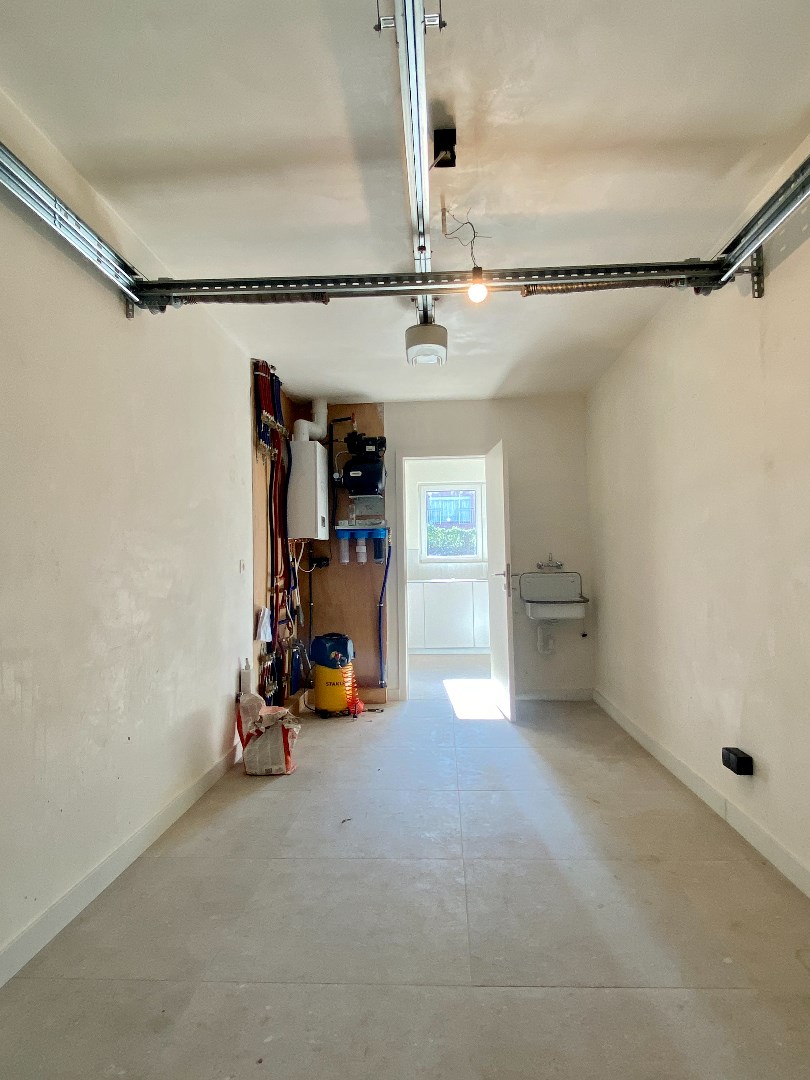 De stalen deur verwelkomt ons in de leefruimte. Hier zijn verschillende grote raampartijen die voldoende zonlicht binnenlaten. De keuken is volledig geïnstalleerd en heeft een aparte berging plus een aanpalende garage.