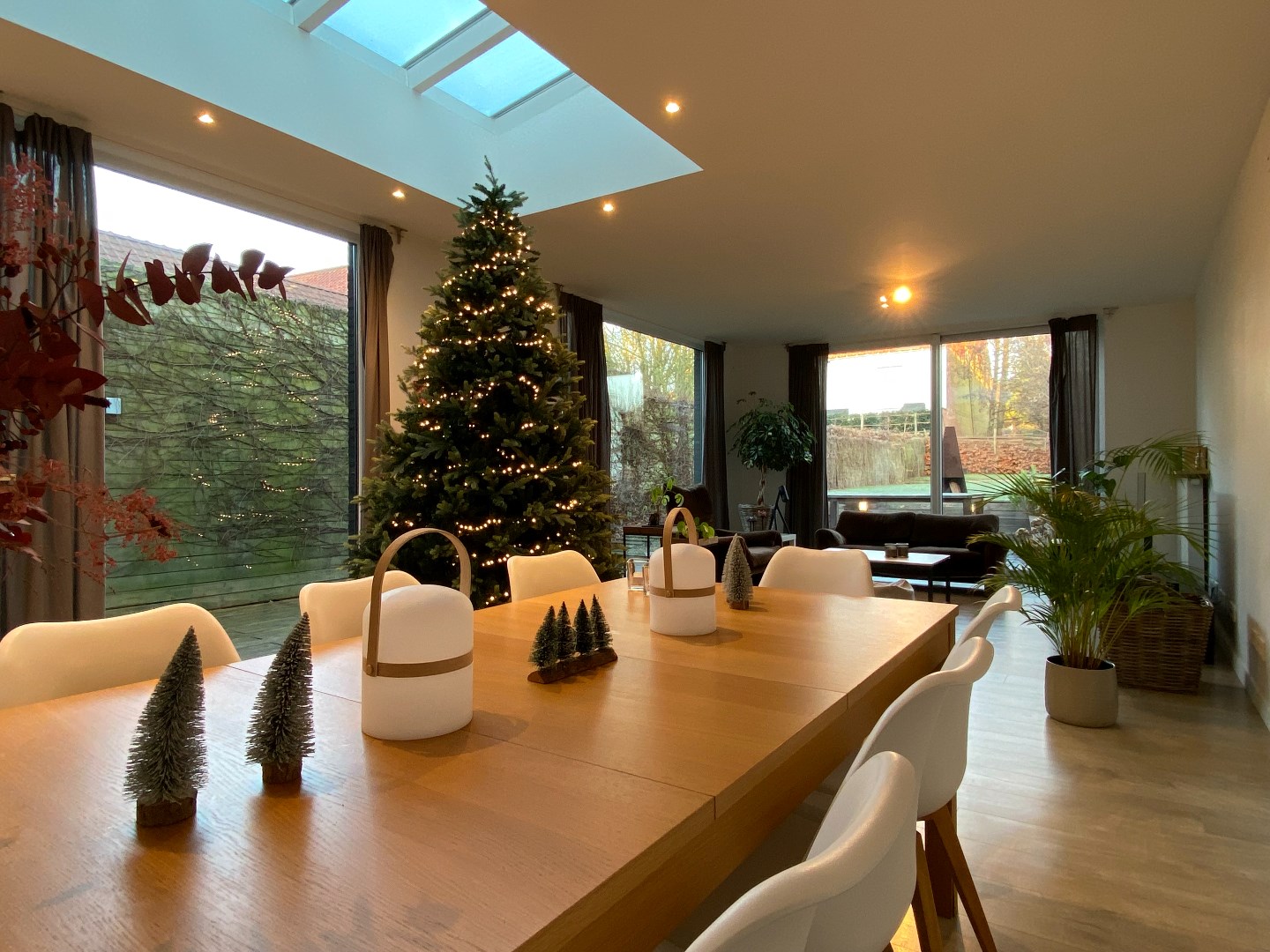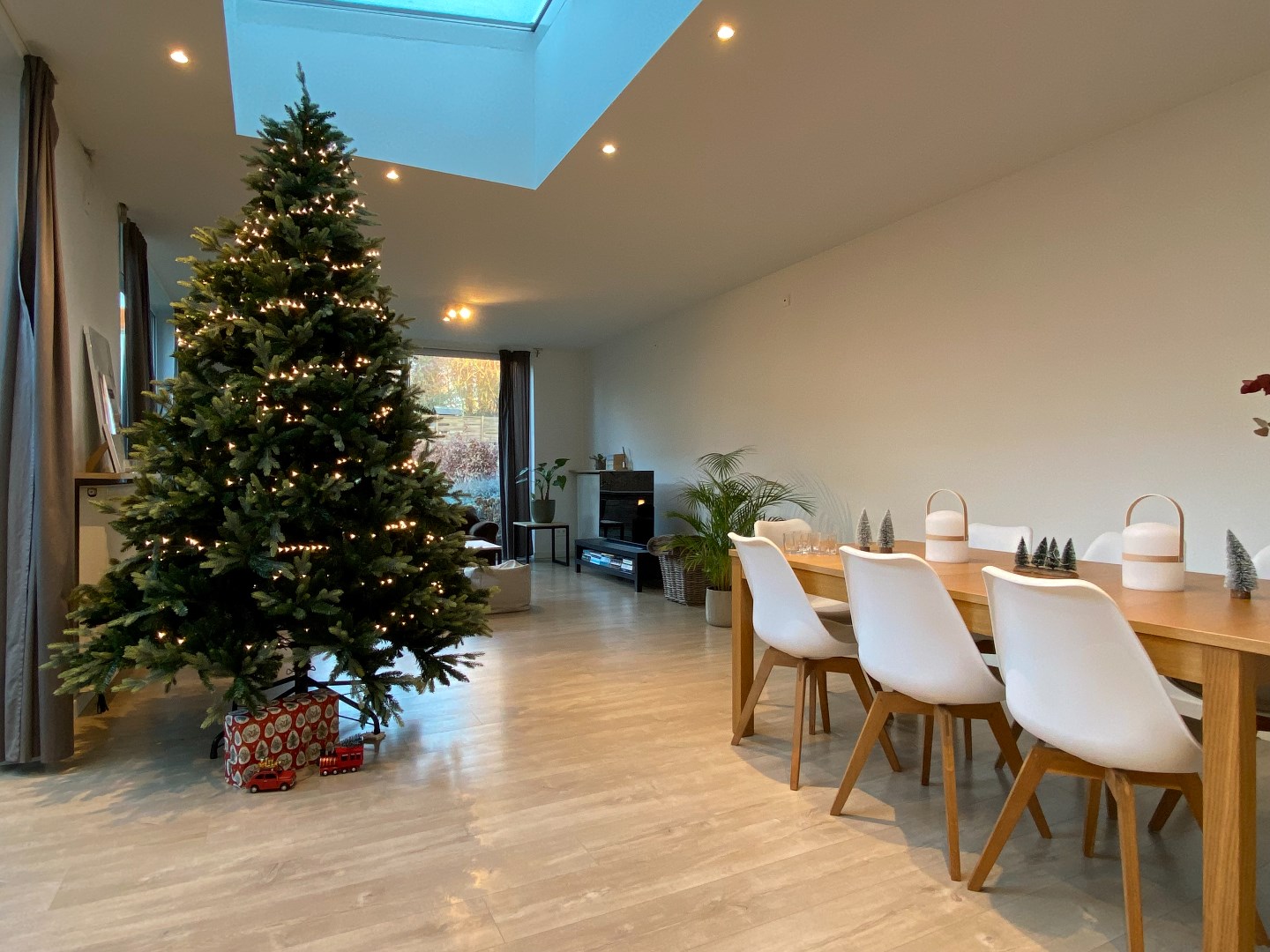 De grote leefruimte kijkt uit op de tuin en staat in verbinding met de keuken. Aanpalend een extra bergruimte met plaats voor vaatwasmachine, wasmachine en overige zaken. Uitkijkend op het mooi aangelegd terras en grote tuin.