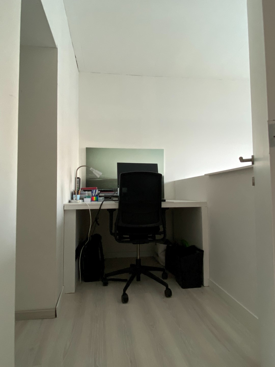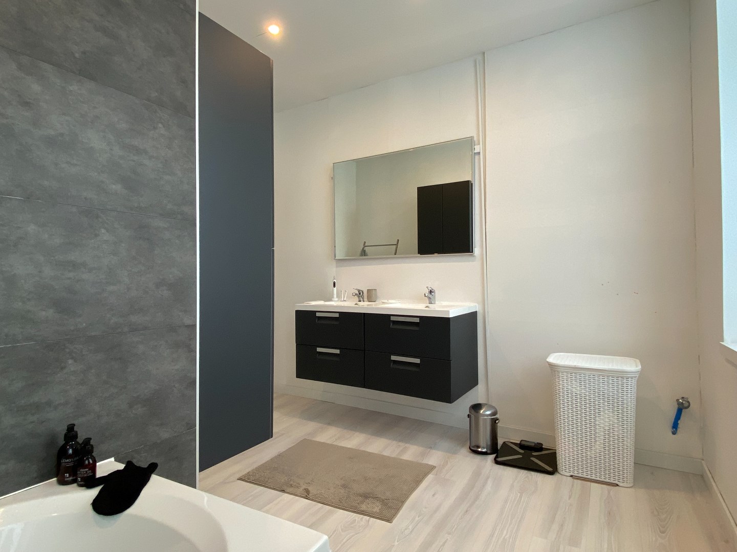 Op de eerste verdieping is er de badkamer met ligbad (combinatie douche) en lavabomeubel. Verder op het verdiep is er op heden een bureau ingericht en vinden we ook de eerste 2 slaapkamers. De huidige bewoner heeft de tweede (kleinere) kamer ingericht als dressing maar kan eventueel gebruikt worden als kinderkamer.