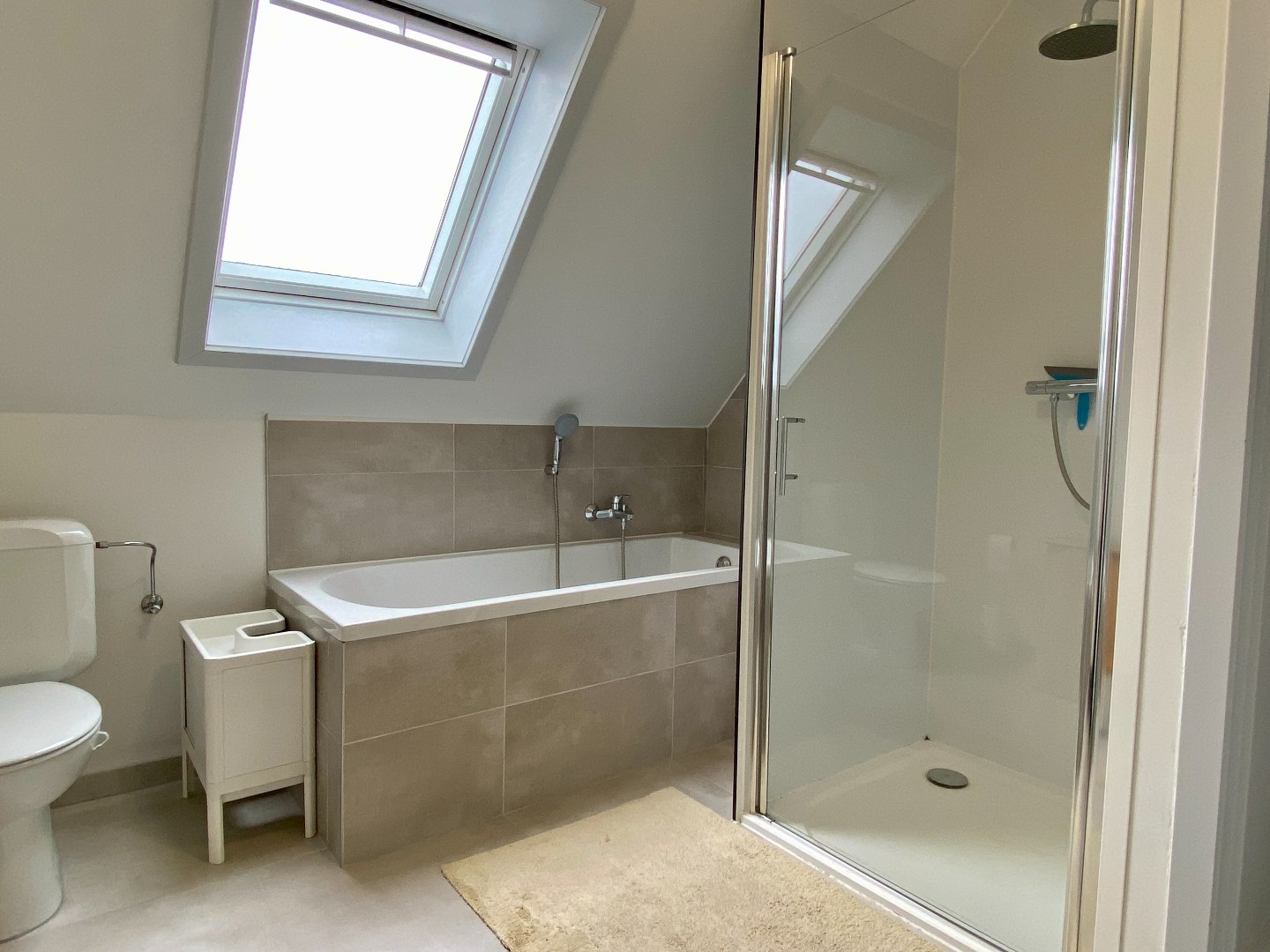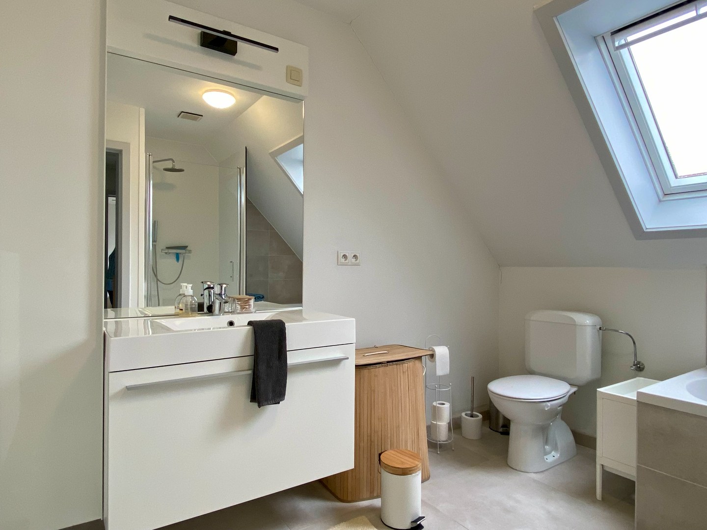 Boven op het verdiep zijn er drie ruime slaapkamers met dakramen, alsook de badkamer. De badkamer is volledig geïnstalleerd met wastafel, toilet, bad en douche.