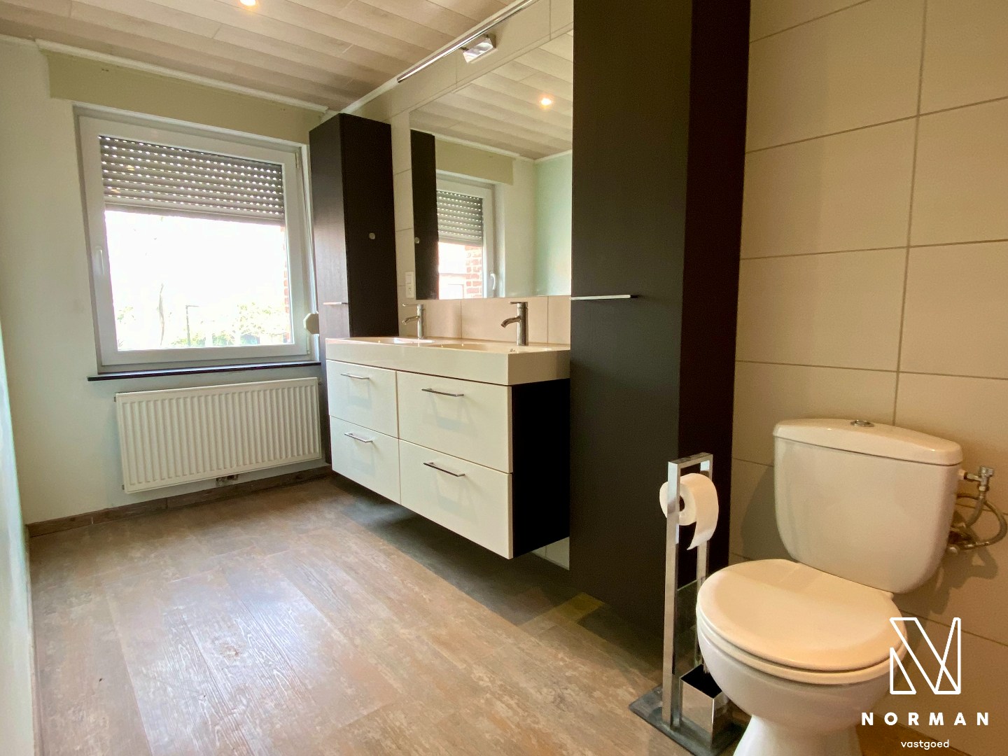 Het verdiep bevat nog een badkamer en een ruime slaapkamer. Een vaste trap brengt ons naar de zolder waar er nog 2 slaapkamers zijn voorzien.