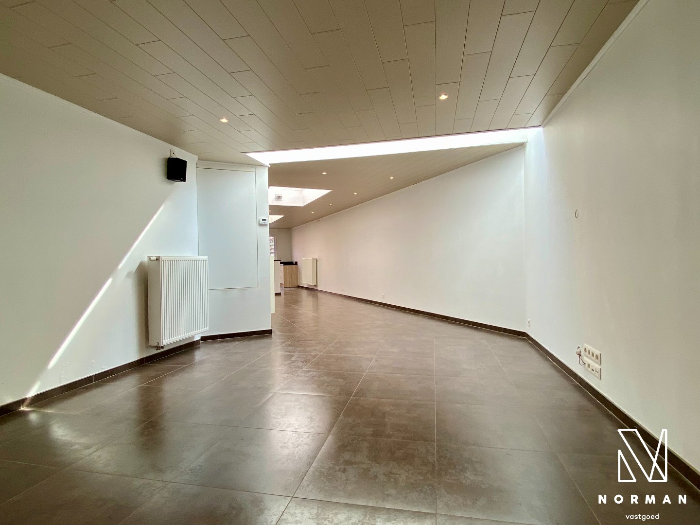 Hierna komen we in de leefruimte. Een lang gestrekte ruimte met hier en daar gerieflijke bergingen voorzien. De keuken is een open geheel met zicht over de tuin. Deze is voorzien van alle toestellen (uitgezonderd koelkast) en een luxe werkblad.