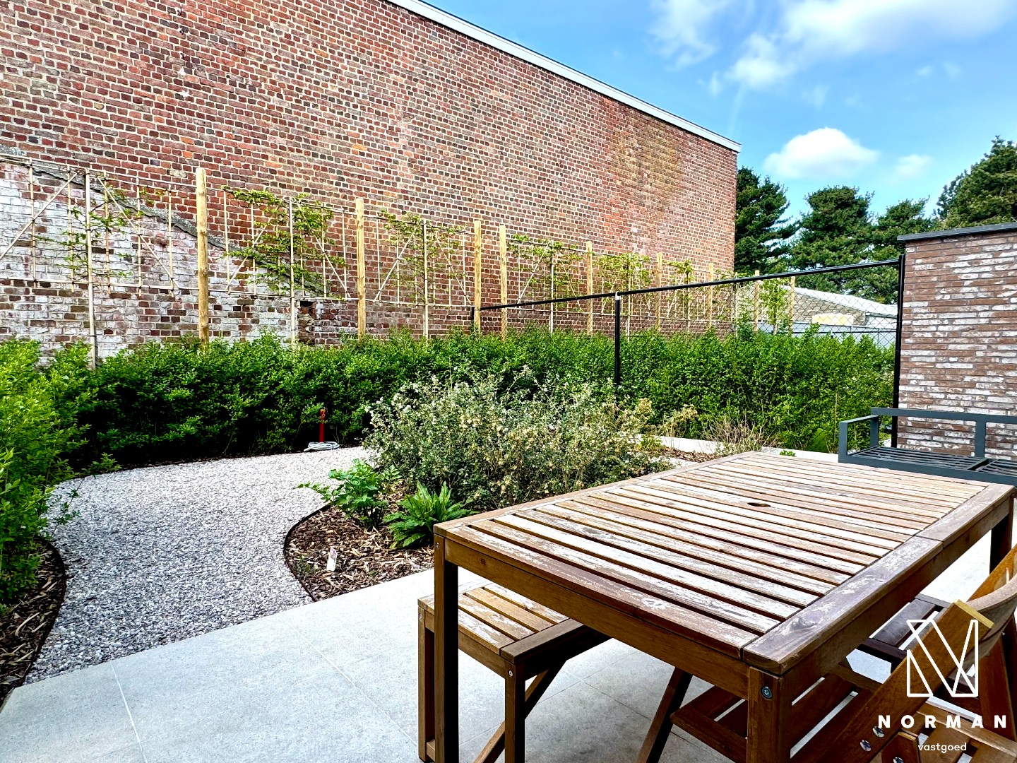 Bij het binnenkomen betreed je de inkomhal met gastentoilet. De ruime en lichtrijke leefruimte geeft uit op het terras en aangelegd tuin. Aansluitend bevindt zich de open, modern ingerichte keuken, uitgerust met vaatwasser, koelkast, dampkap en fornuis. Naast de keuken is er een praktische berging.