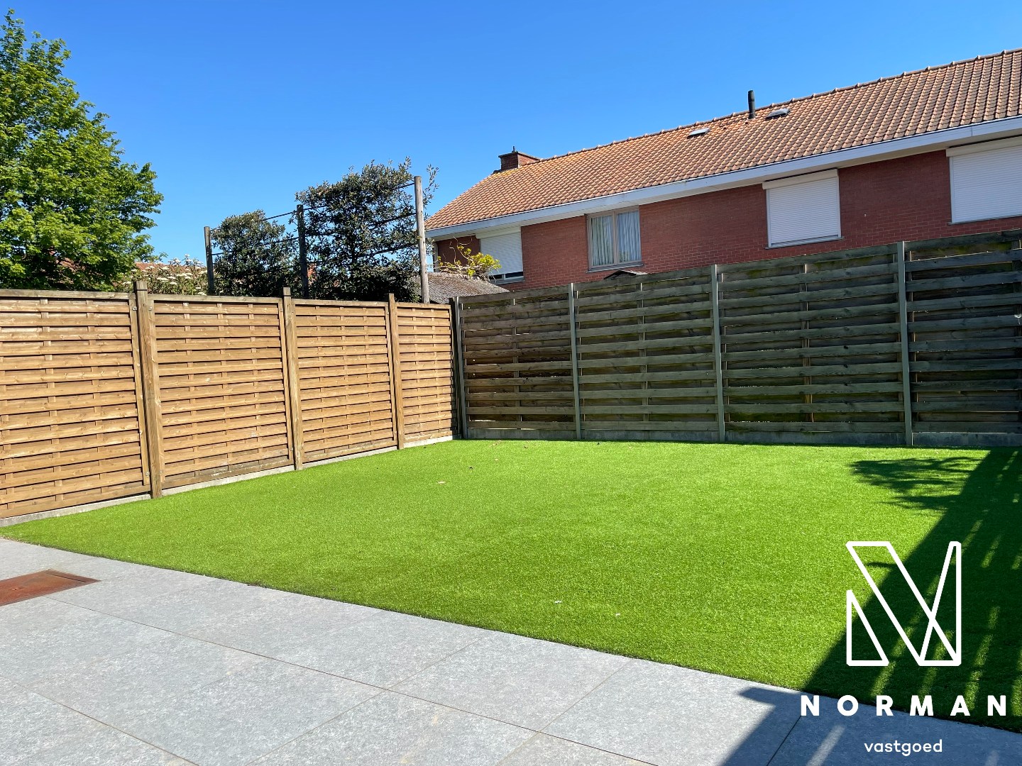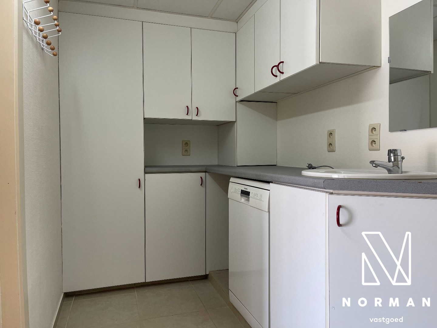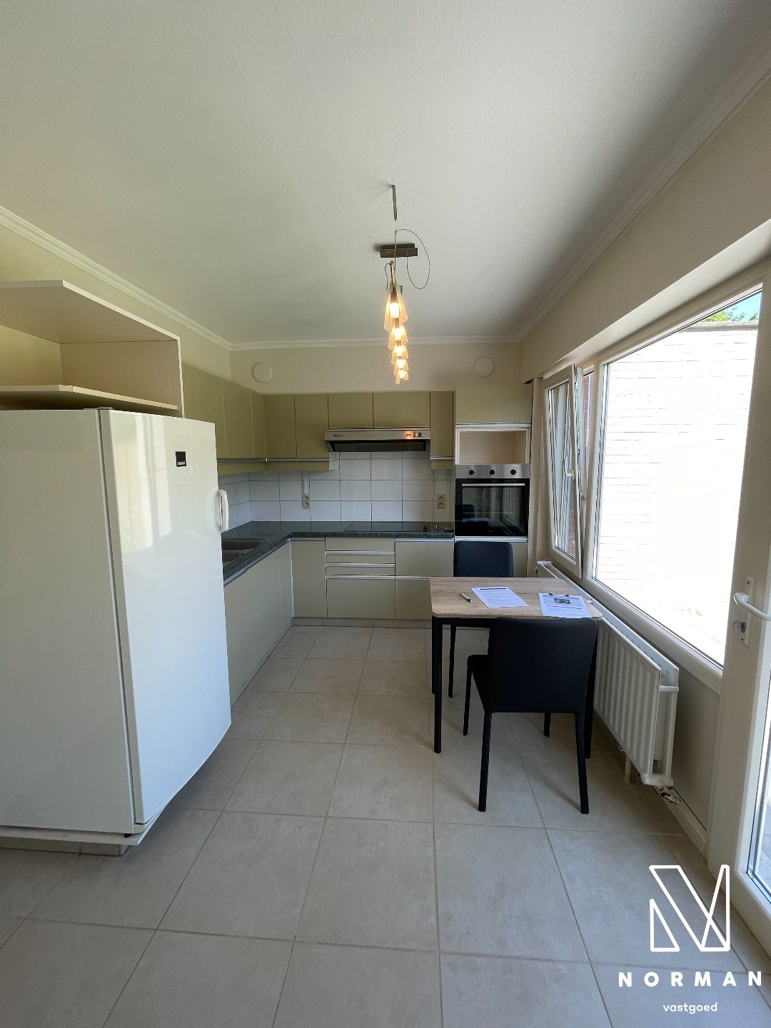 De woning omvat een inkomhal met gastentoilet, een lichtrijke leefruimte met zicht op de tuin en een keuken uitgerust met fornuis, oven en dampkap (de losstaande koelkast kan worden overgenomen). Aansluitend is er een praktische bijkeuken en een garage met extra bergruimte.