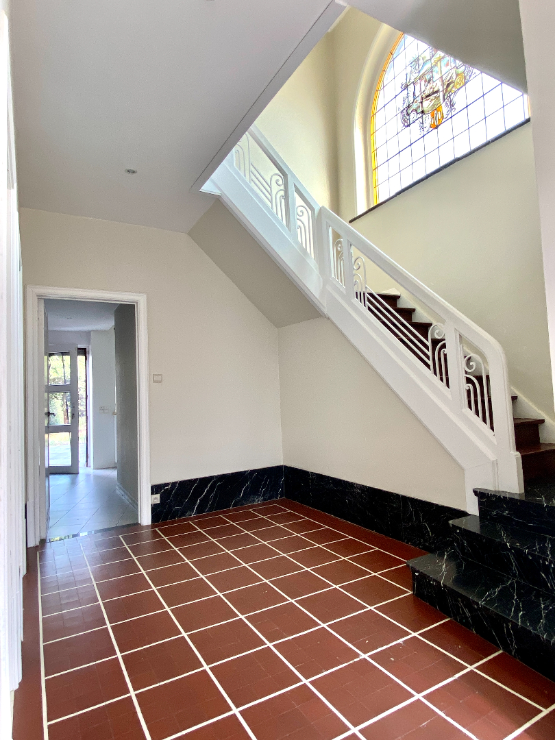 Grote inkom met veel lichtinval( en een tussenverdiep met een gastentoilet), leefruimte, keuken, berging, kelder,...