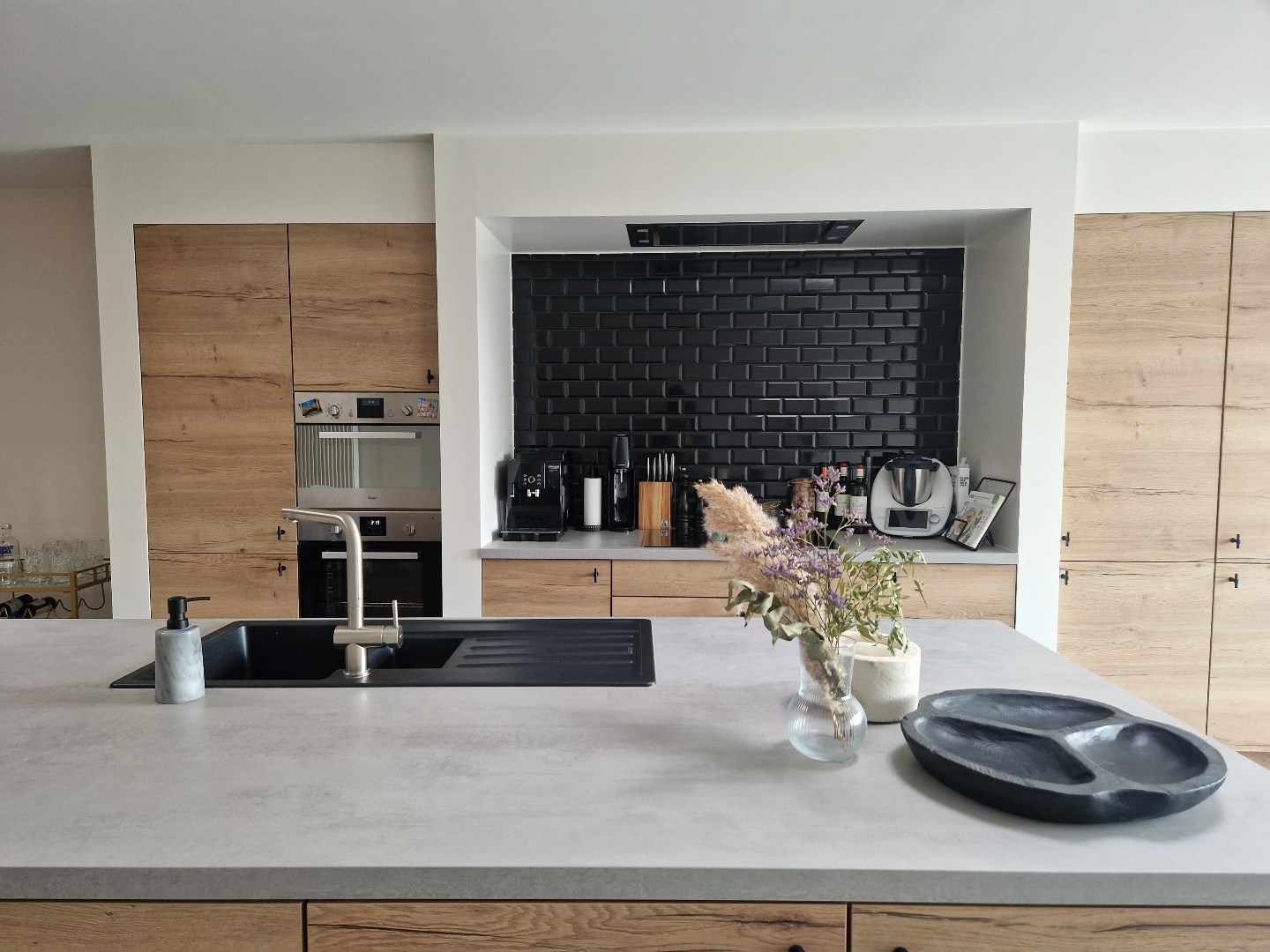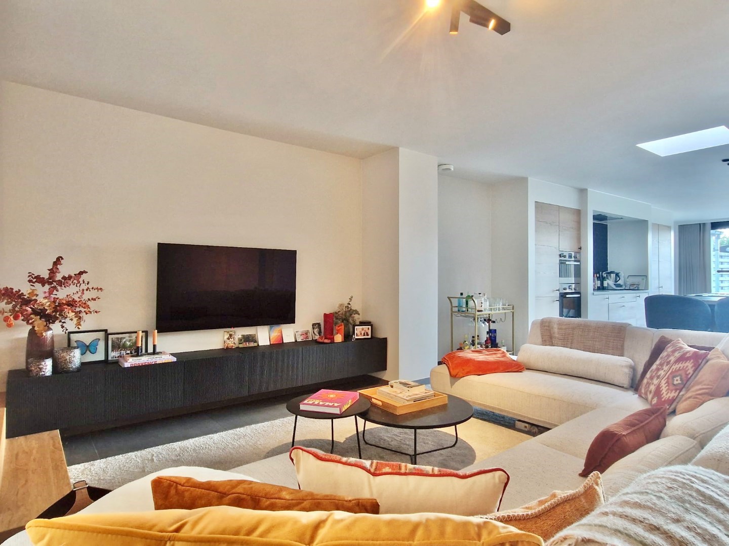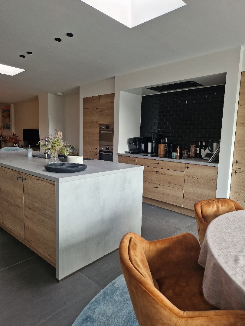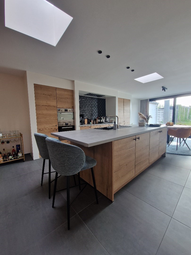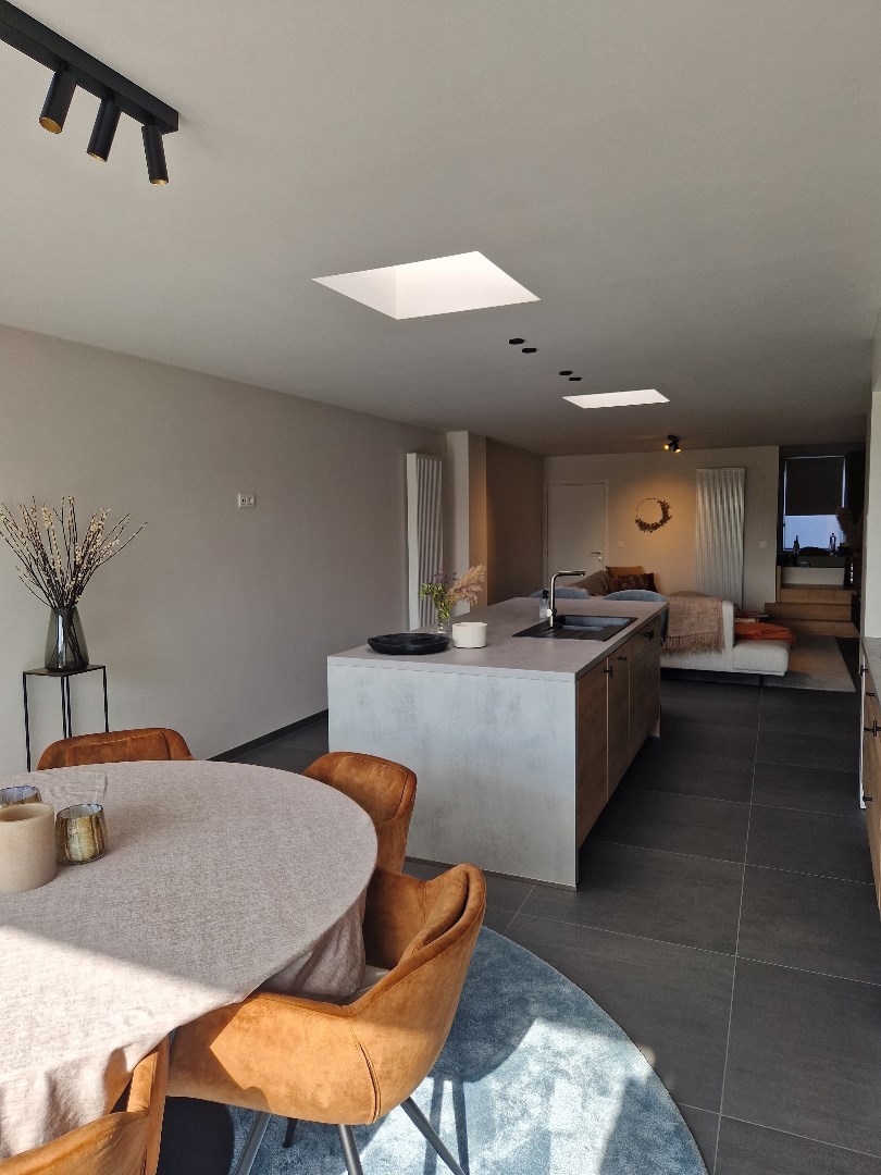 Via de inkomhal met gastentoilet komen we terecht in de leefruimte. Deze is opgedeeld in een zithoek en een open keuken. De keuken, die volledig afgewerkt is, geeft uitzicht op de zongerichte tuin waar er zich ook een uitweg bevindt. Op het gelijkvloers bevindt zich tevens een ruime voorplaats, berging en bureau ruimte.