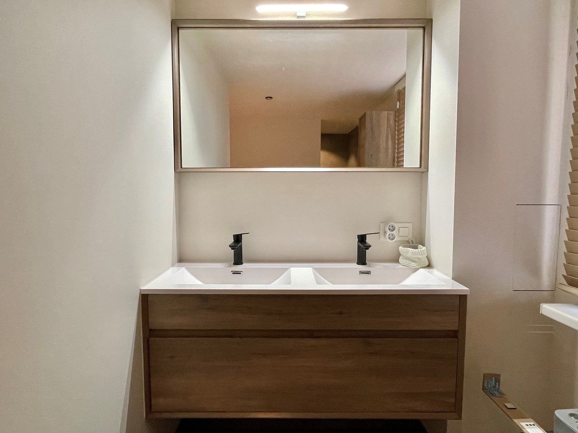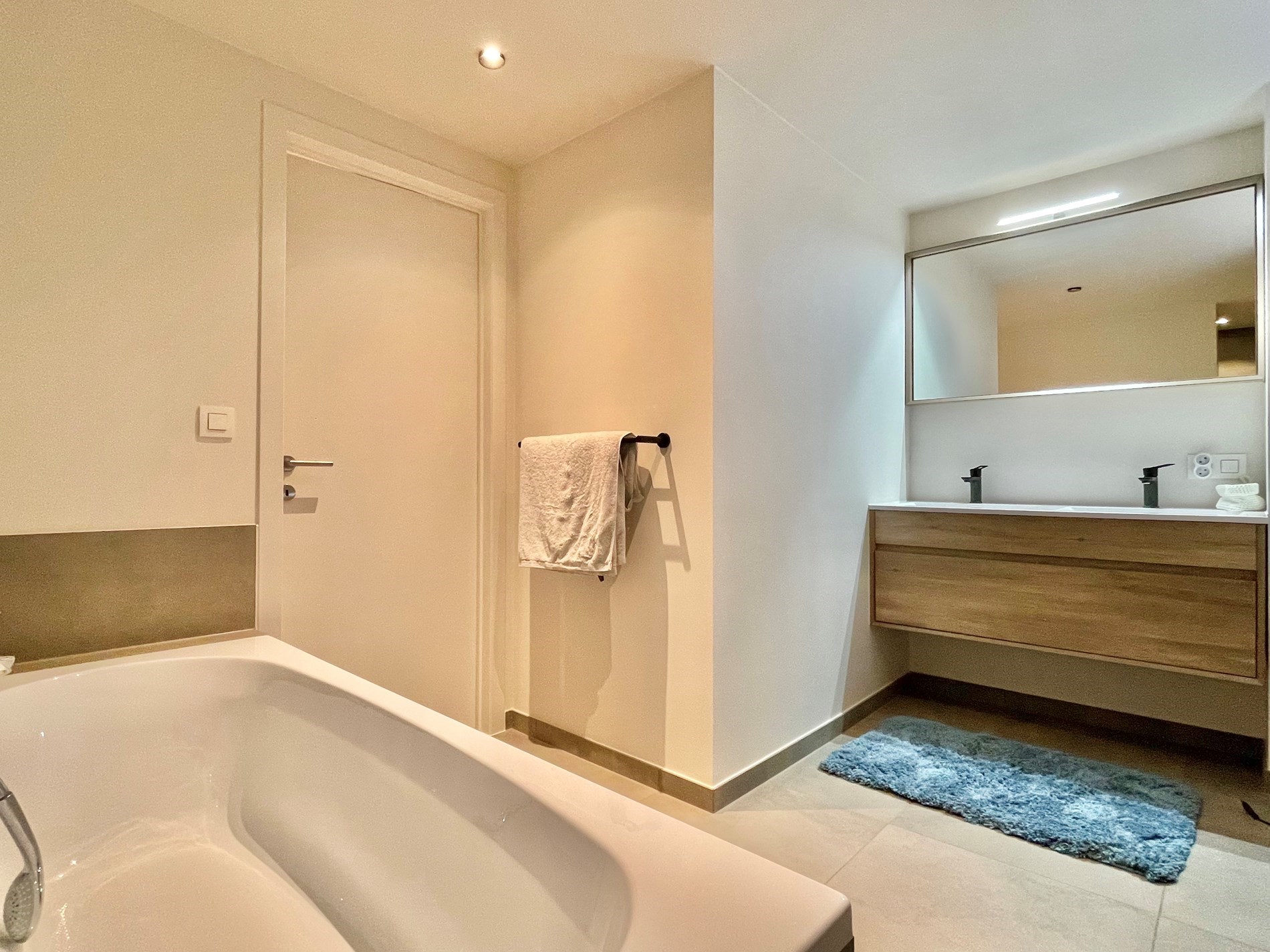Op het eerste verdiep is er een nachthal die toegang geeft tot 5 ruimtes. 2 slaapkamers, een berging met aansluitingen voor wasmachine en droogkast, een apart toilet en tenslotte een luxueuze badkamer met dubbele lavabo, bad en inloopdouche.