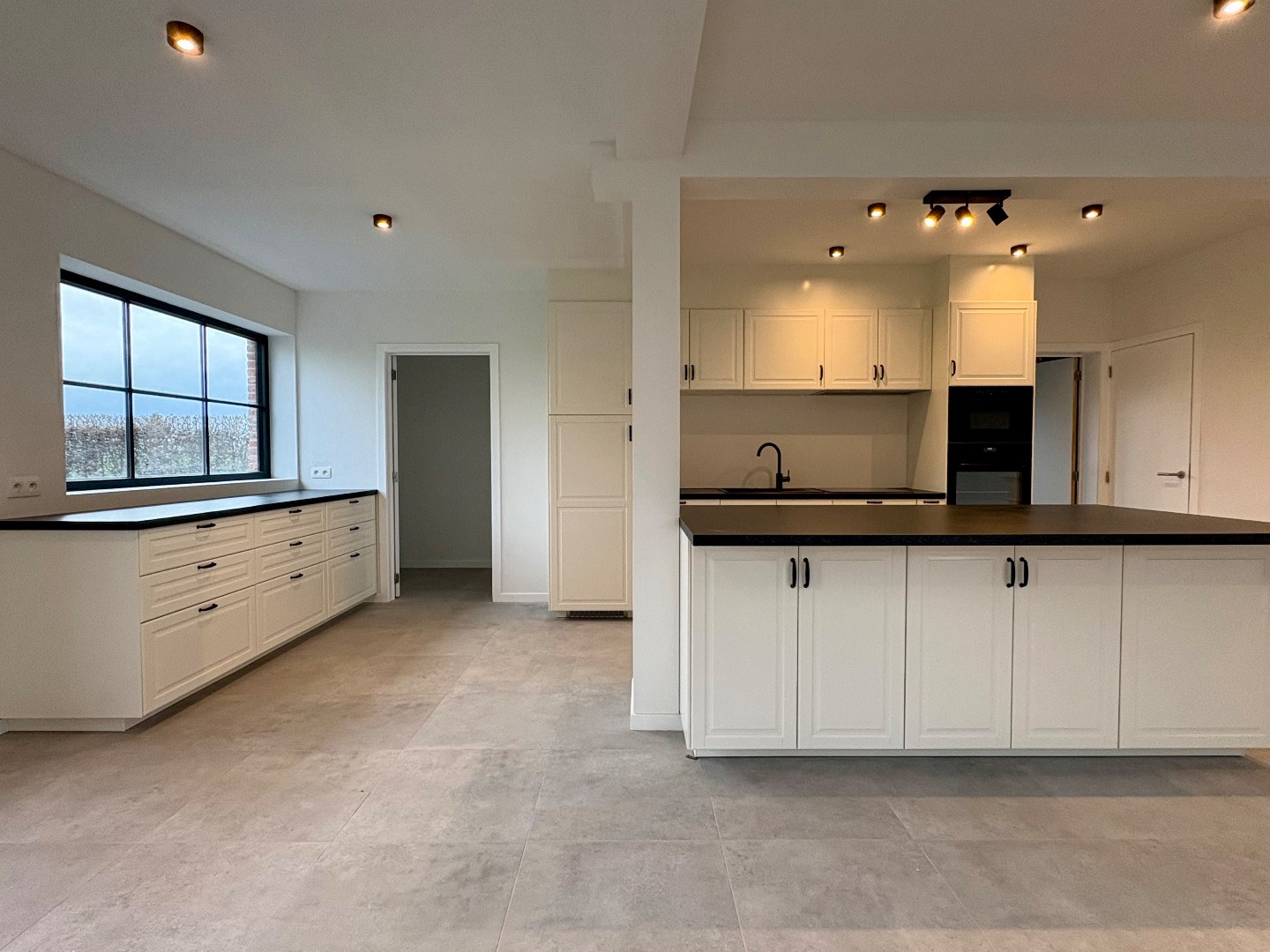 De open keuken met kookeiland beschikt over veel kastruimte en diverse ingebouwde toestellen, waaronder een microgolfoven, oven, vaatwasser en koelkast. Aansluitend bevindt zich een aparte was- en strijkruimte met voldoende plaats voor wasmachine en droogkast. Daarnaast is er nog een berging voorzien voor de technische installaties.
