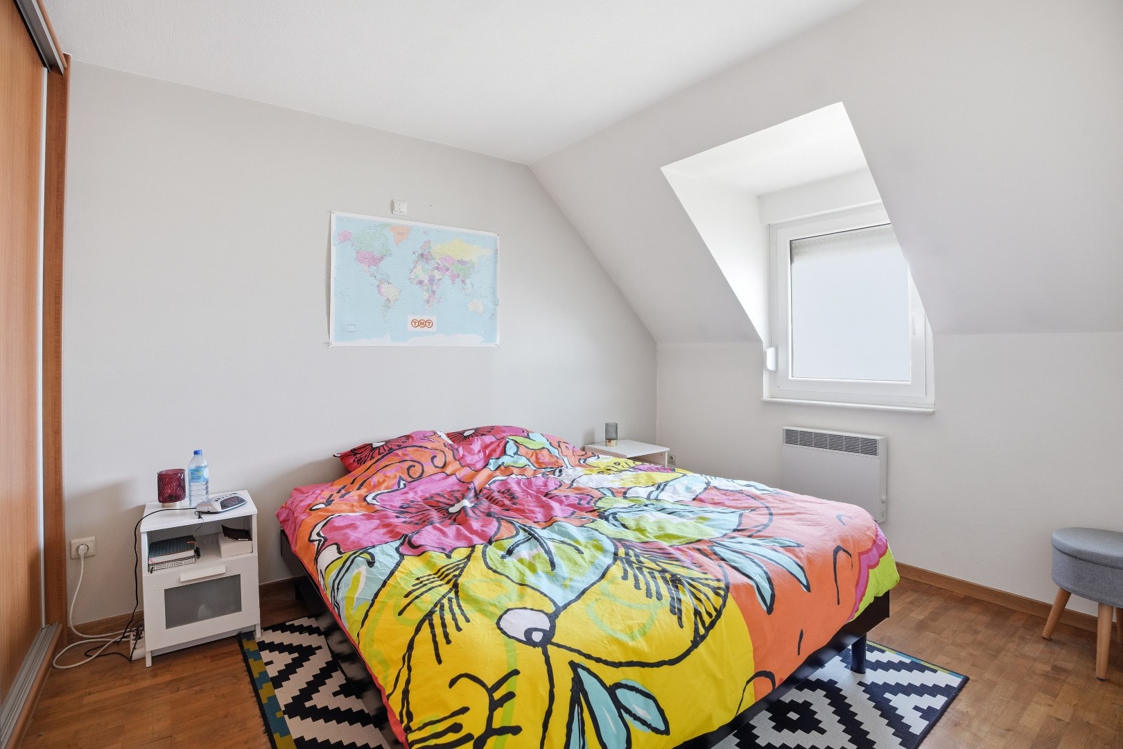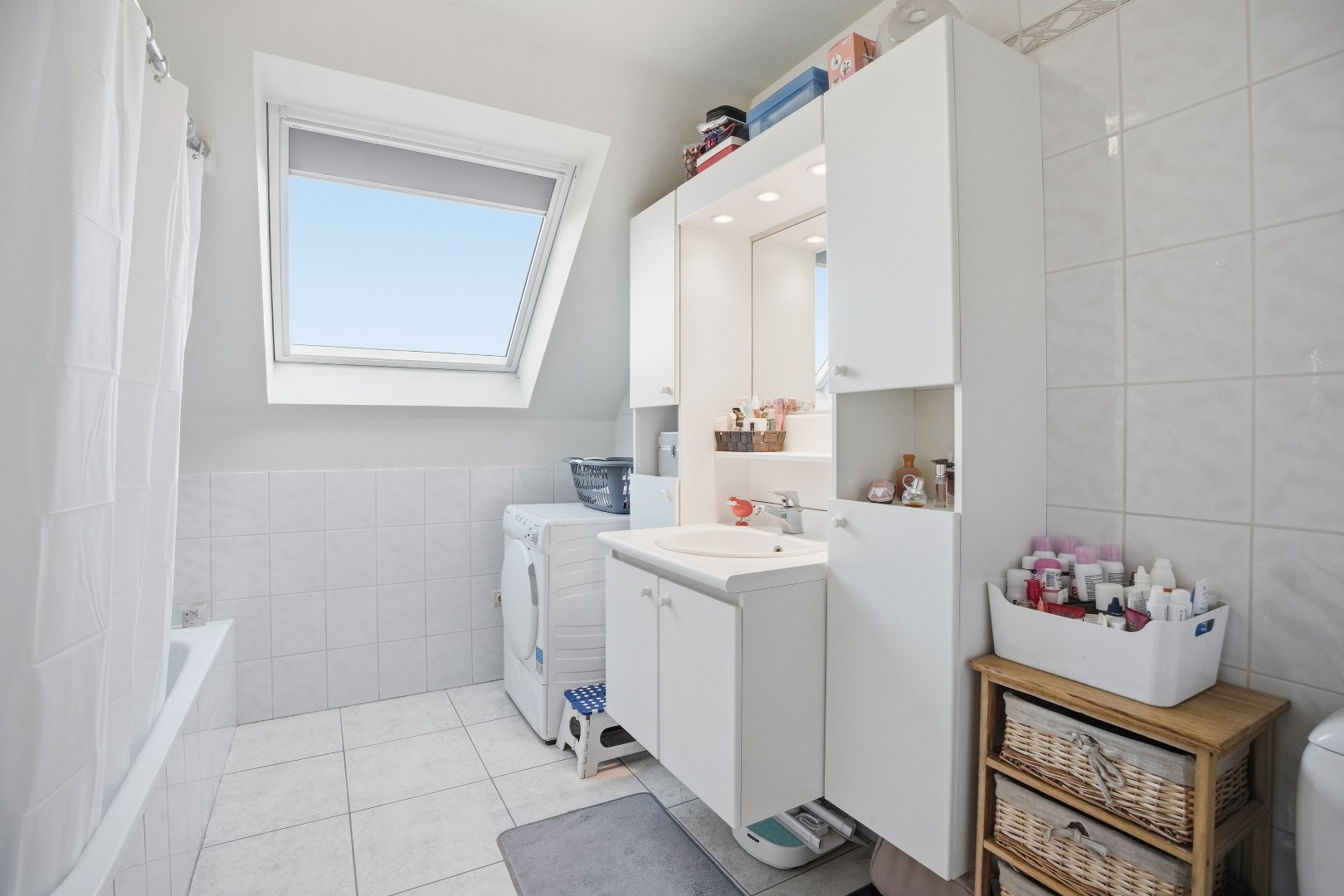 Via de trap bereik je het eerste verdiep. Hier bevindt zich nog een tweede slaapkamer en de badkamer, uitgerust met een lavabo, bad/douche en aansluiting voor een wasmachine.