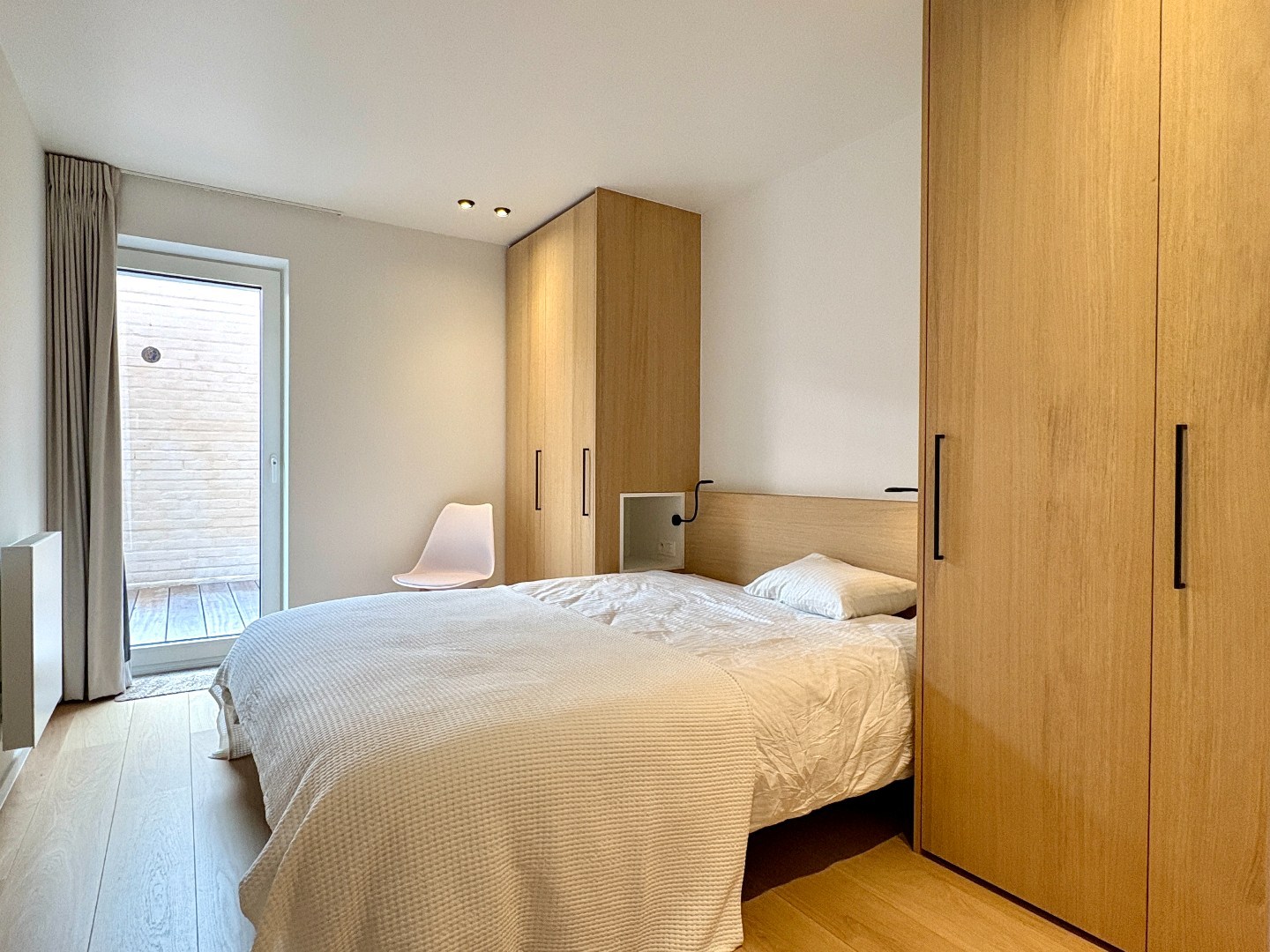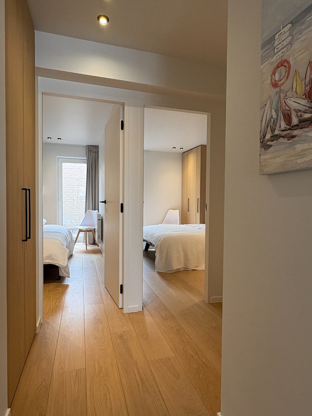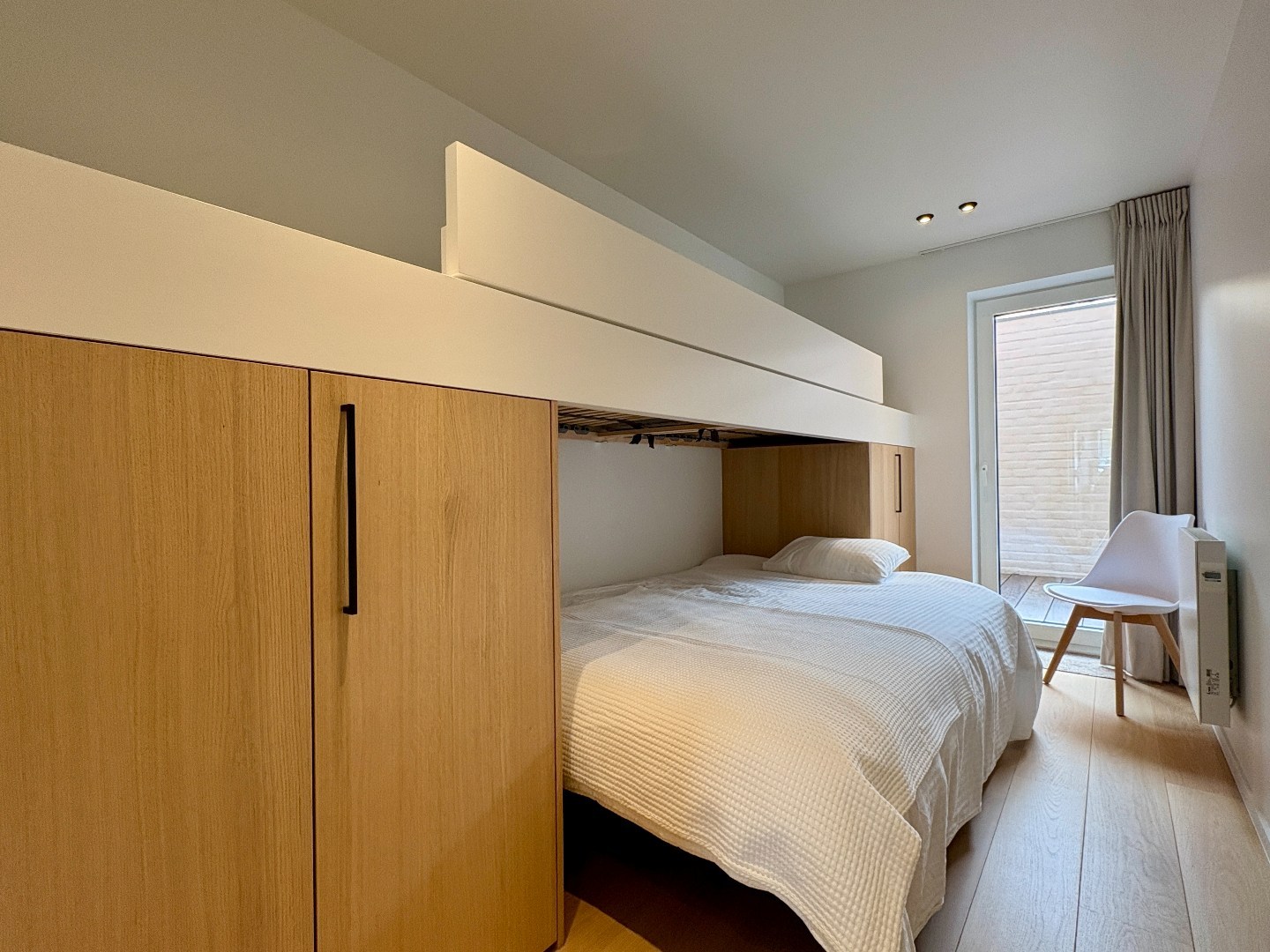 Achter het appartement zijn er 2 slaapkamers. In de kleinste kamer kunnen de meeste mensen slapen, door slim maatmeubilair is er een stapelbed en twijfelaar vast geïnstalleerd. De hoofdkamer heeft ook maatkasten en biedt ook toegang naar het achterliggend terras.