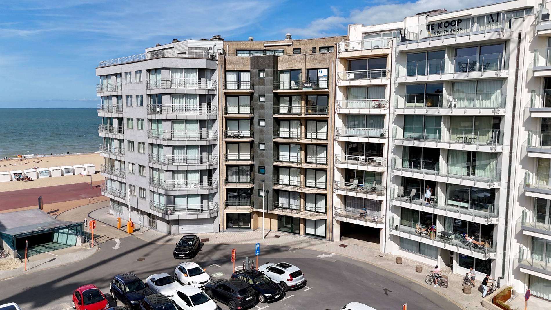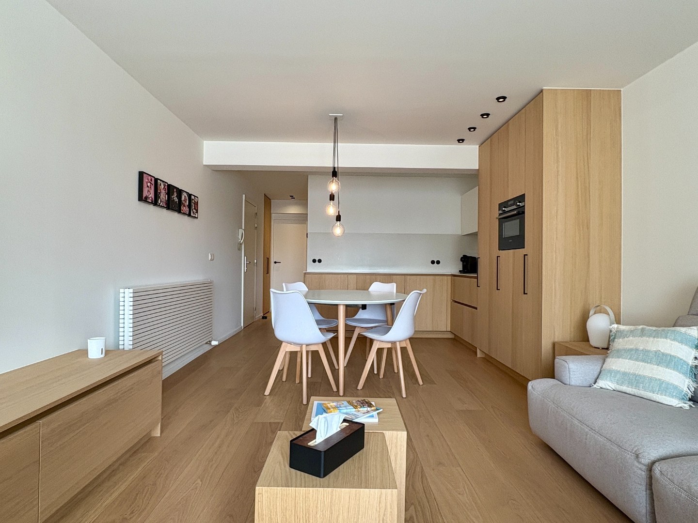 De leefruimte is volledig geïnstalleerd en heeft een gelijkvloers zicht over het Lucionplein, die verbonden is met het strand en de zee. Vele maatmeubilair maakt deze open keuken en leefruimte best gerieflijk. Een stofzuigkast, wasmachine mooi weggestopt, dressoir met TV benodigdheden,..