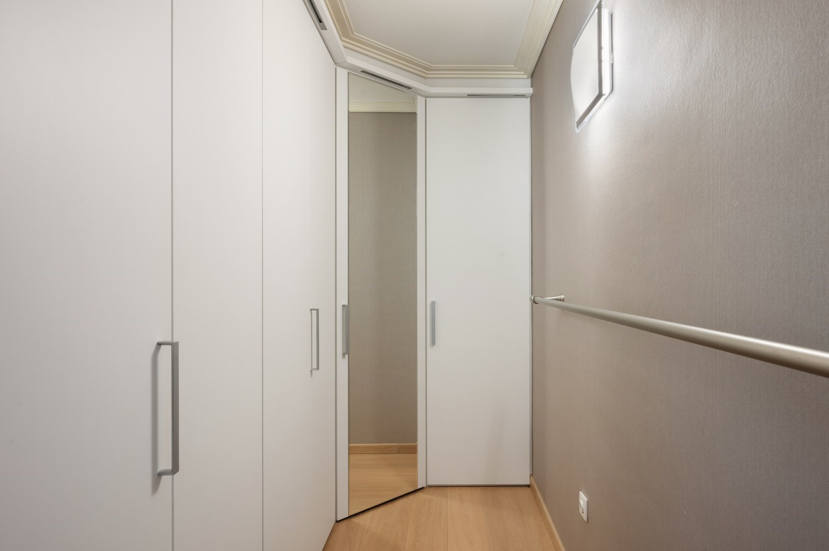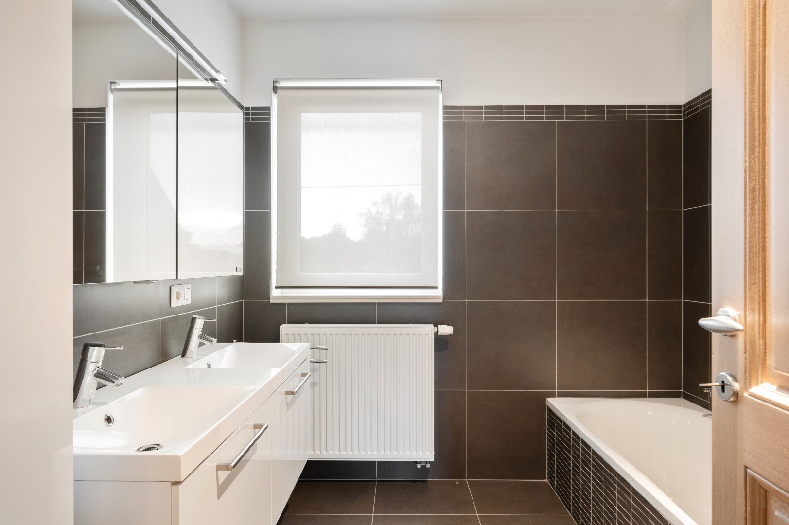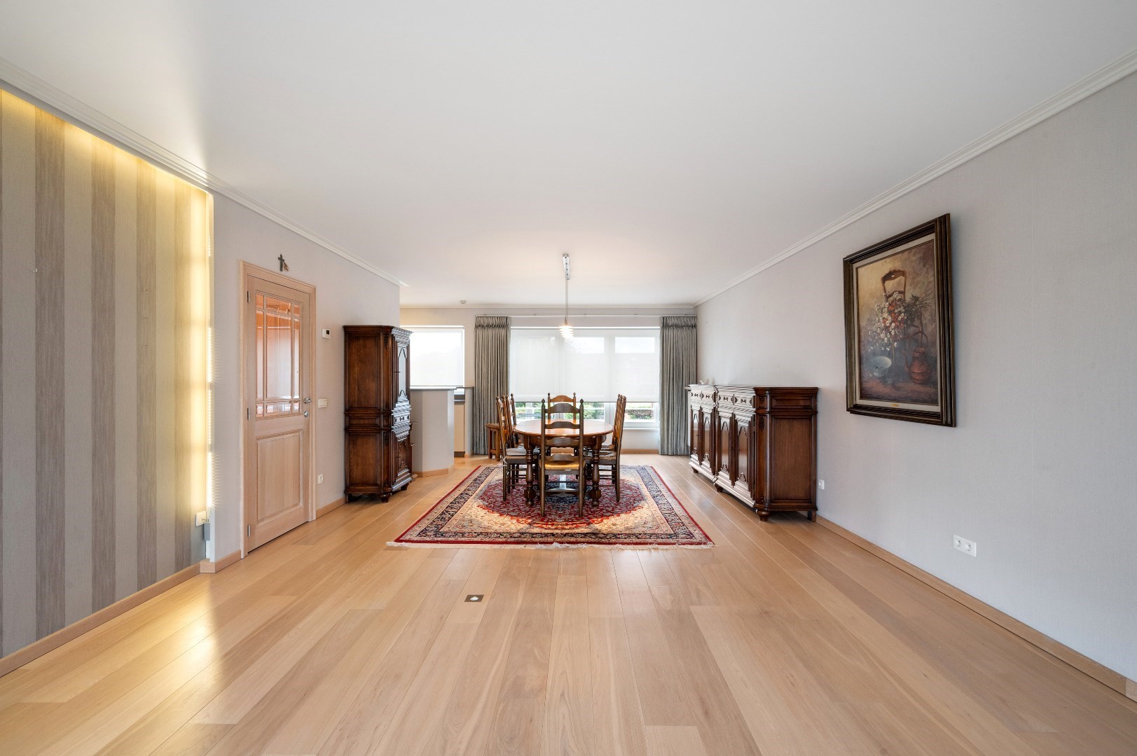 In de leefruimte, afgewerkt met massief eiken parket, valt het licht binnen langs twee kanten. Via het schuifraam (met ingebouwd vliegenraam) komen we terecht op het terras aan de achterkant van het gebouw, dat ook verbonden is met de eerste slaapkamer. Deze beschikt over een fantastische dressing. Verder is er een moderne badkamer met dubbele wastafel, bad en douche alsook een hoogwaardige keuken met inbouwtoestellen. In de berging is er een aansluiting voor een wasmachine en extra opslagruimte.