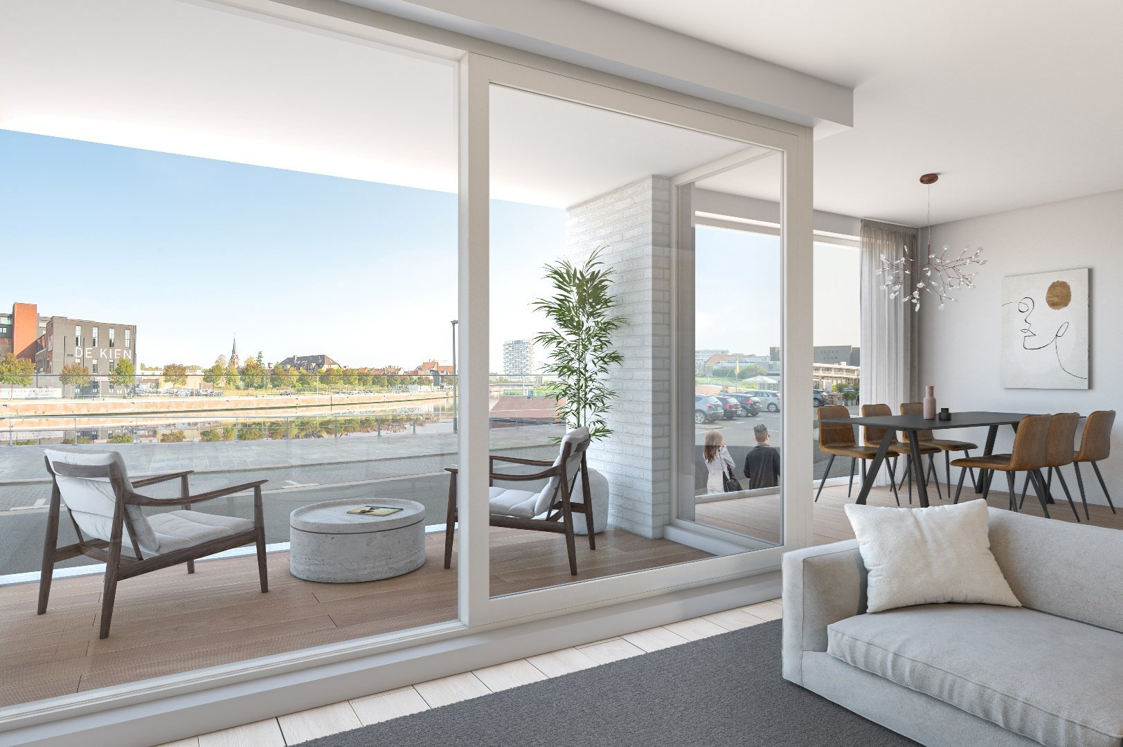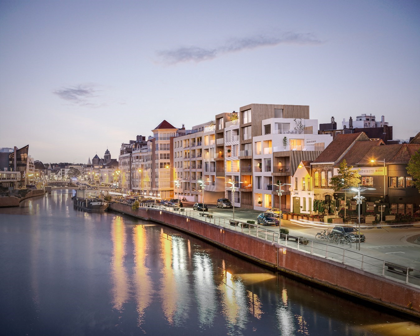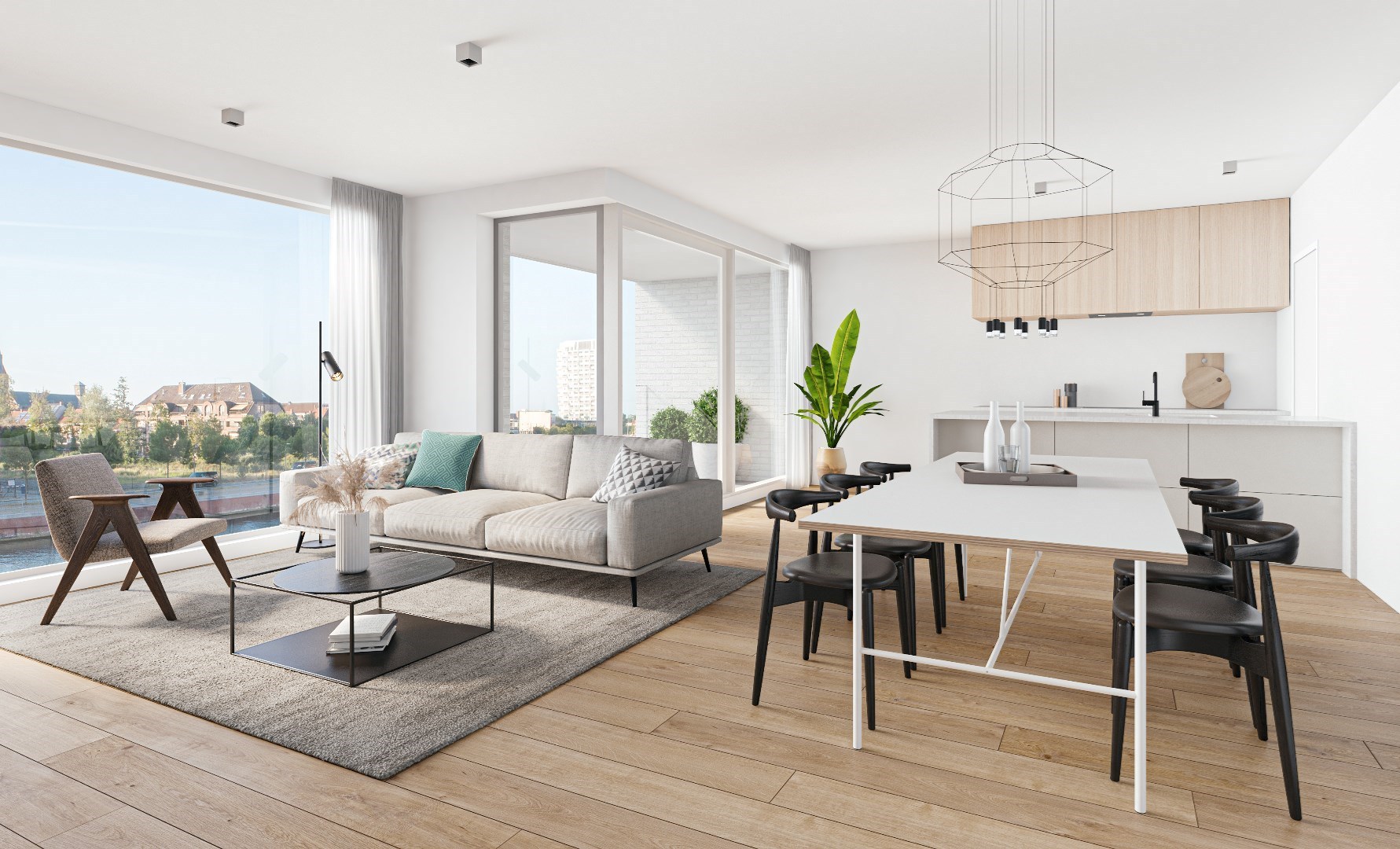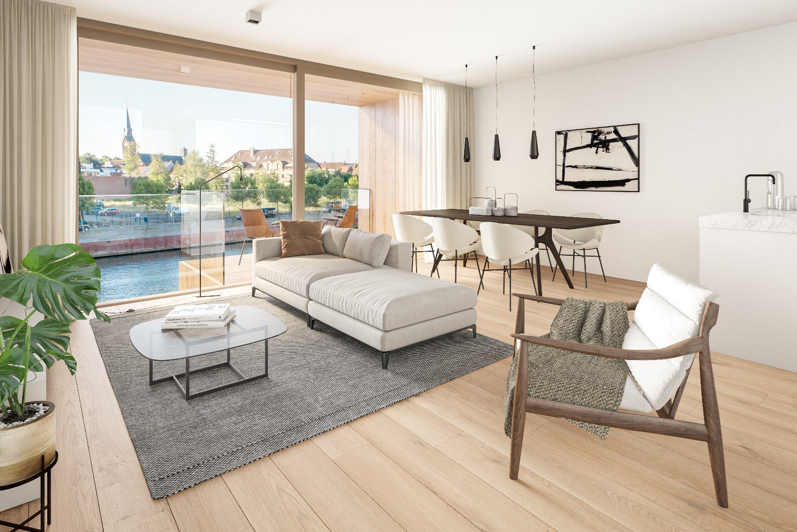 Dit moderne verhuurde appartement (C0.1) is volledig gericht naar het water en biedt dankzij de grote raampartijen een panoramisch zicht over de Leie. Met de rust van het water en de kracht van de stad binnen handbereik geniet je in Kaskade optimaal van het leven.