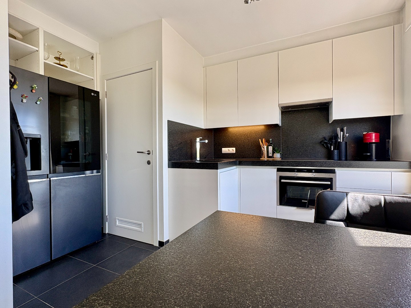 Leefruimte met open keuken. Deze keuken is voorzien van alle nodige toestellen en heeft een aparte bergruimte (voor was en droogkast te plaatsen).