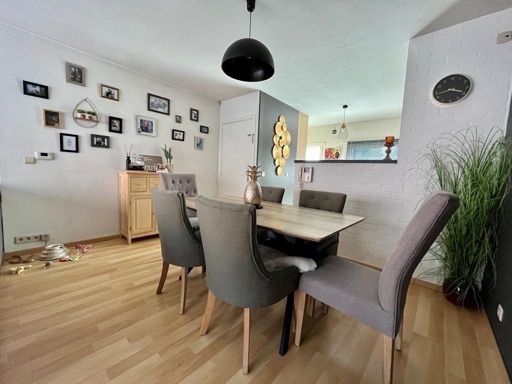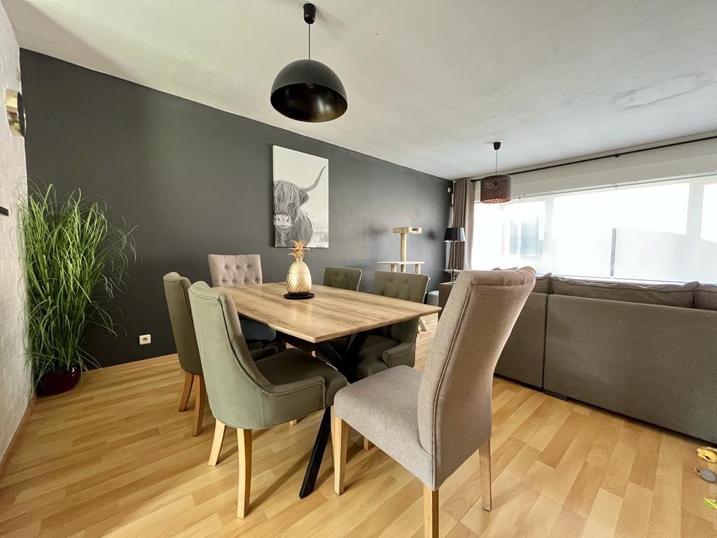 Deze eigendom heeft een zeer zonnig terras, een tafel met vier stoelen en nog andere zaken kunnen perfect geplaatst worden op het terras. Om de hoek is de keuken met vele kastruimten en alle nodige toestellen. De leefruimte is een open geheel met de open keuken. Op de gang is er alvast een apart toilet.