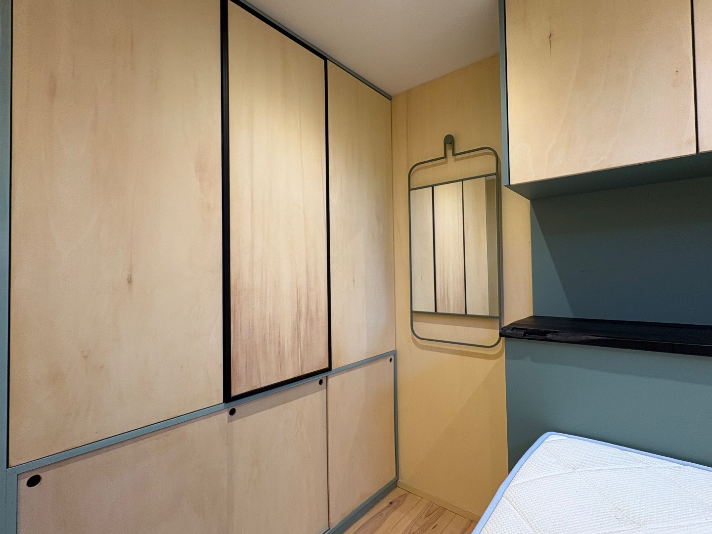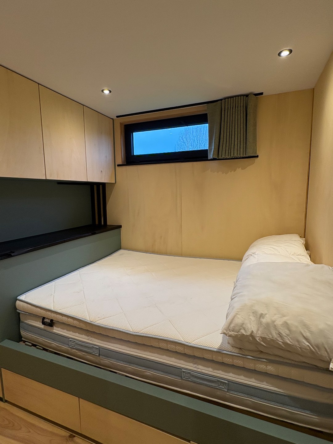 De tiny house is ontworpen voor 4 mensen. Bij het binnengaan kom je in de living en aansluitend de keuken met frigo, diepvries, kookvuur met geïntegreerde dampkap, hier is een elektrische boiler voorzien voor warm water. Er is een badkamer met douche en droog toilet. In de slaapkamer is er een groot 2 persoonsbed en veel kastruimte. In de living is er een slaapbank voor 2 extra personen. Er is een pelletkachel als hoofdverwarming.