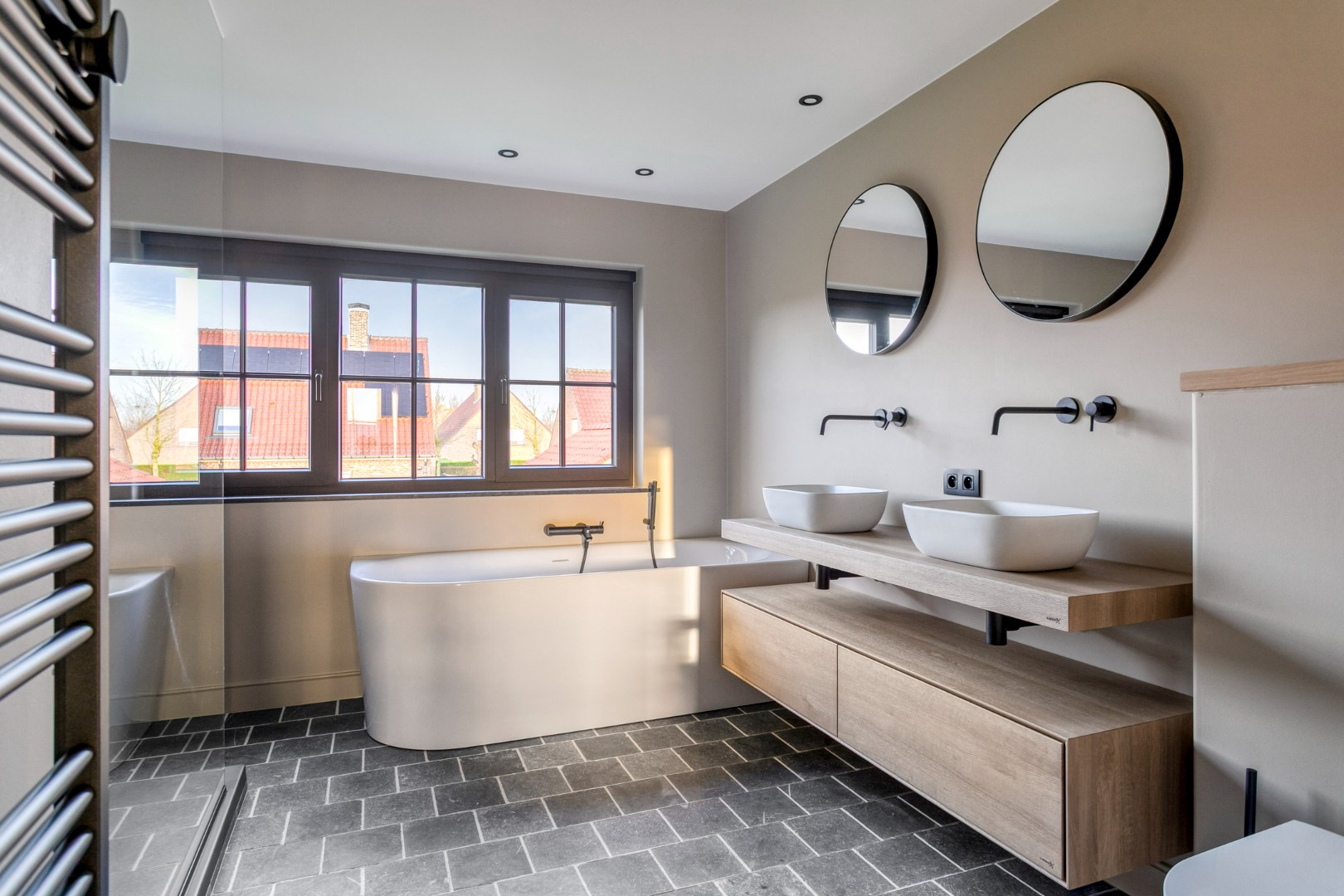 Op de verdieping vinden we 3 slaapkamers en een volledig uitgeruste badkamer (inloopdouche, ligbad, dubbele wastafel en toilet).