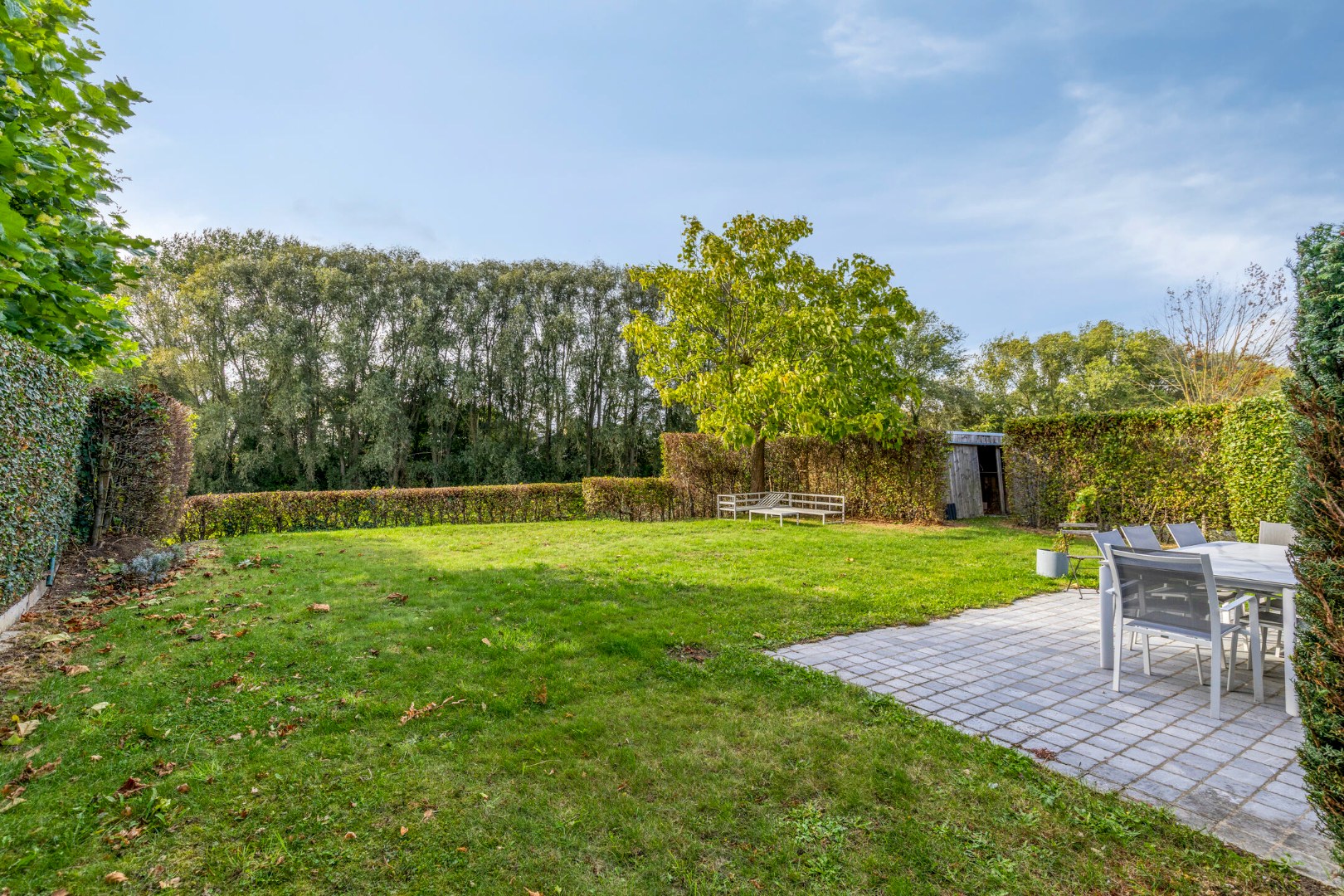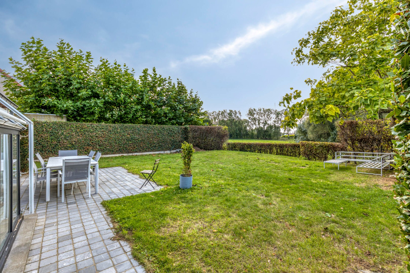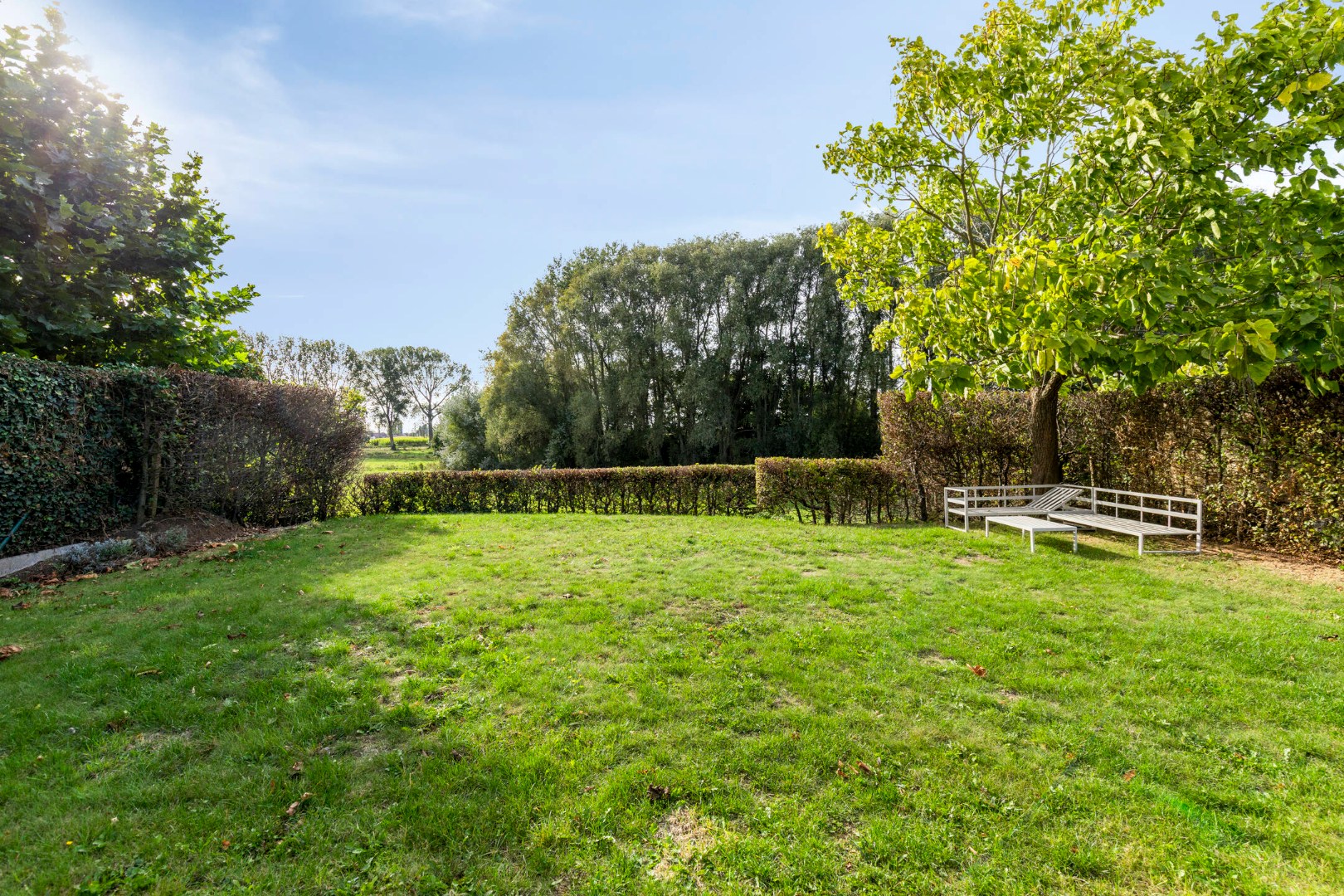 De tuin.. fantastisch georiënteerd, groot terras met zonneluifel maar vooral een groene kijk op de velden en bomen.