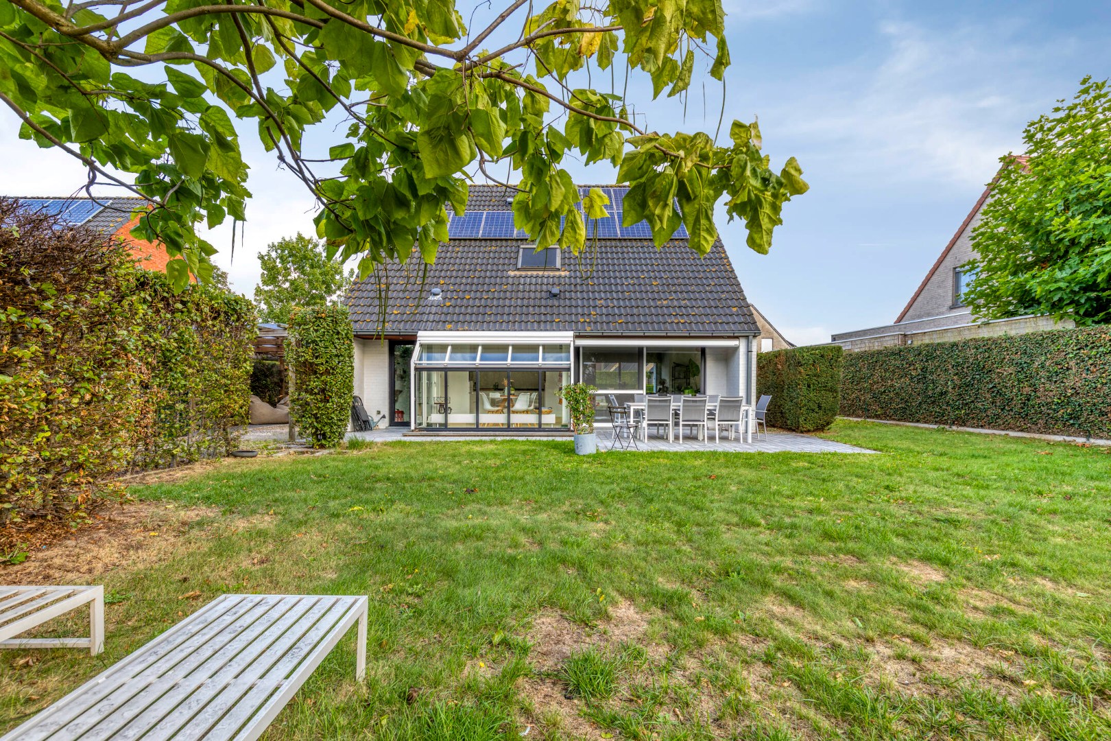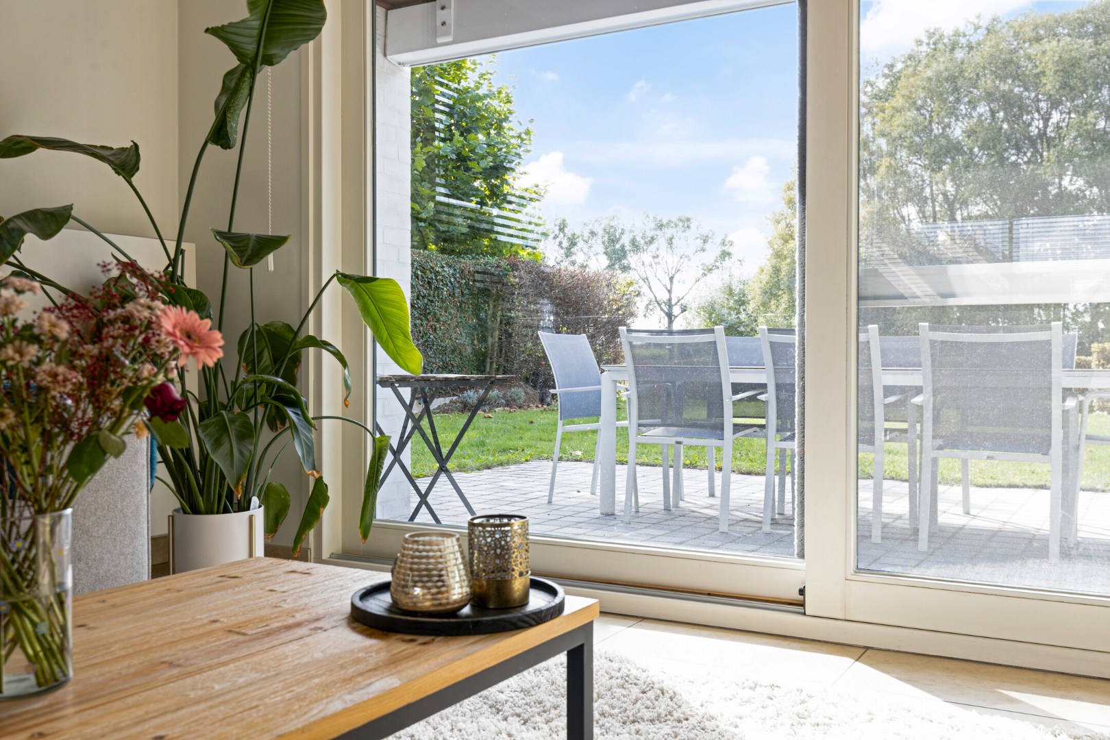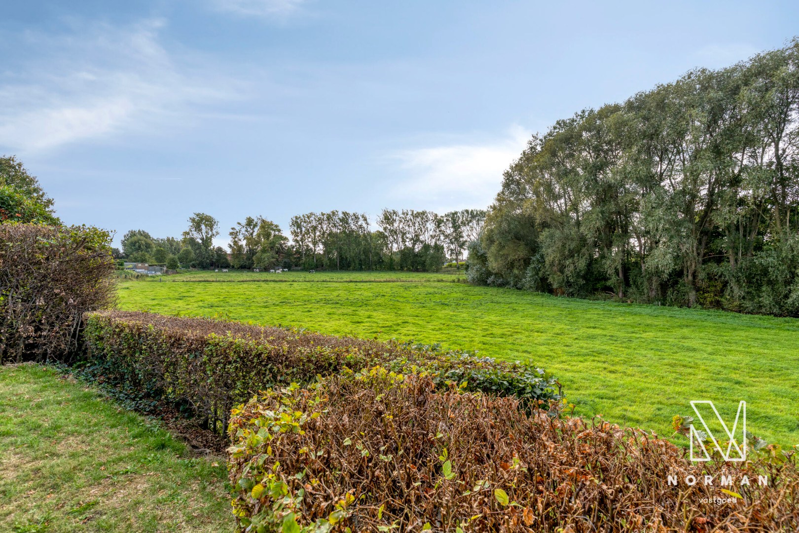 De tuin.. fantastisch georiënteerd, groot terras met zonneluifel maar vooral een groene kijk op de velden en bomen.