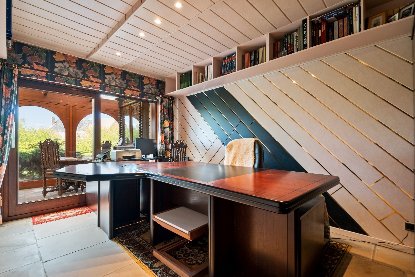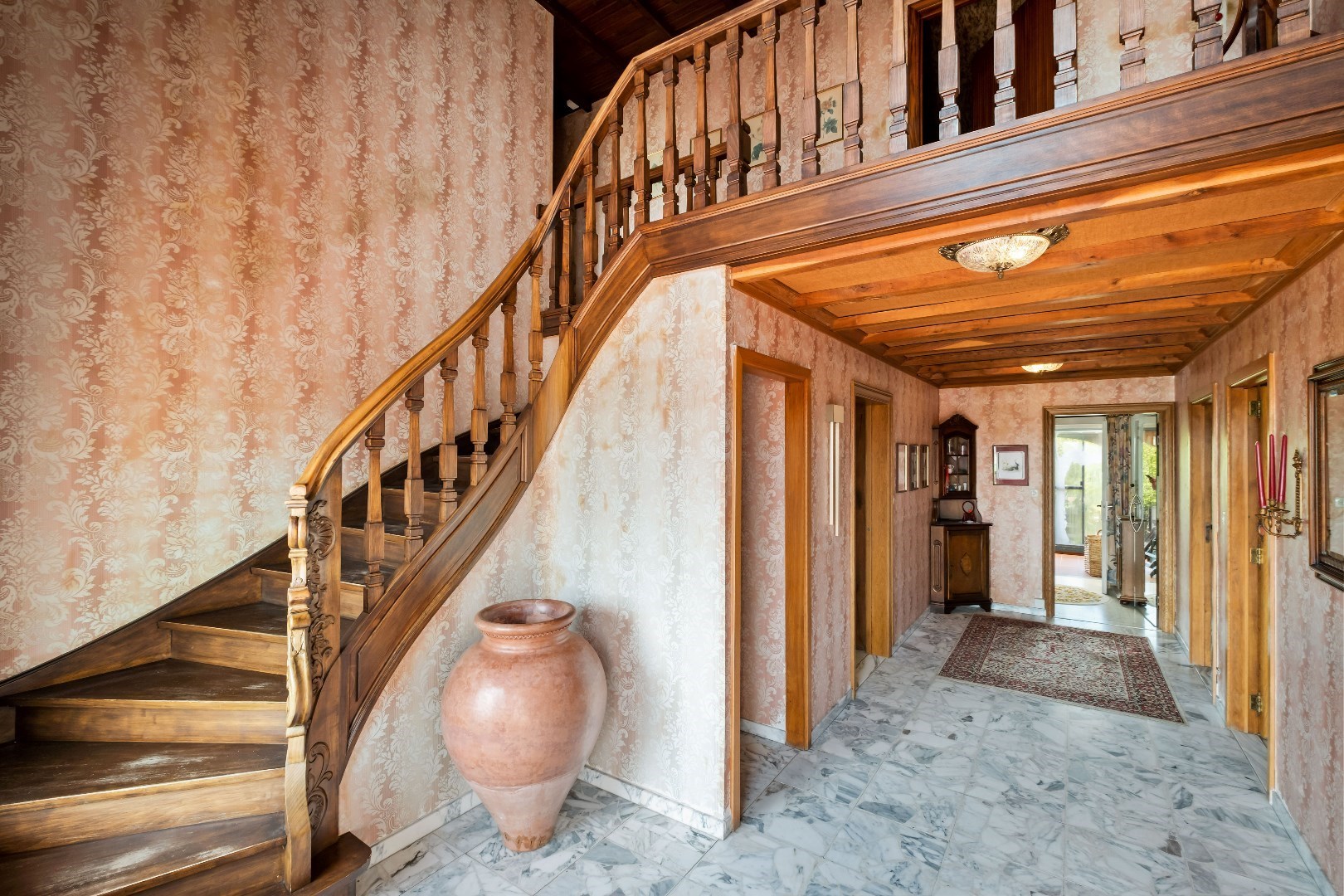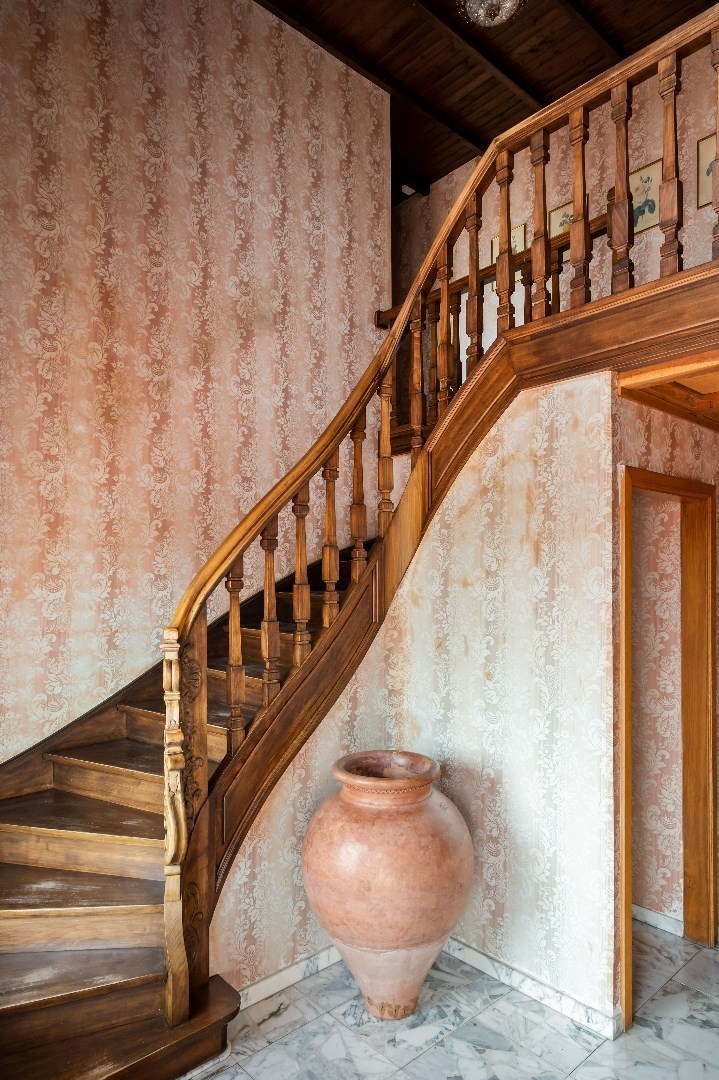 Bij het binnenkomen in de inkomhal met stijlvolle trappenhal hebben we op de linkerkant een leesruimte, daarnaast het toilet en nog in de inkomhal een aparte bureauruimte.