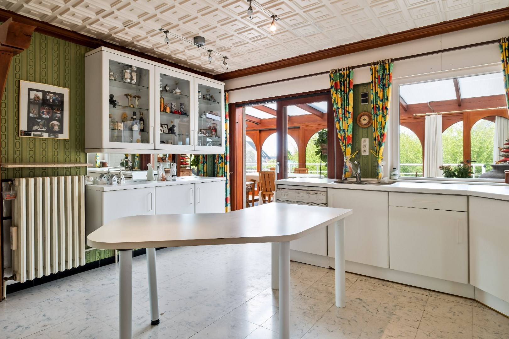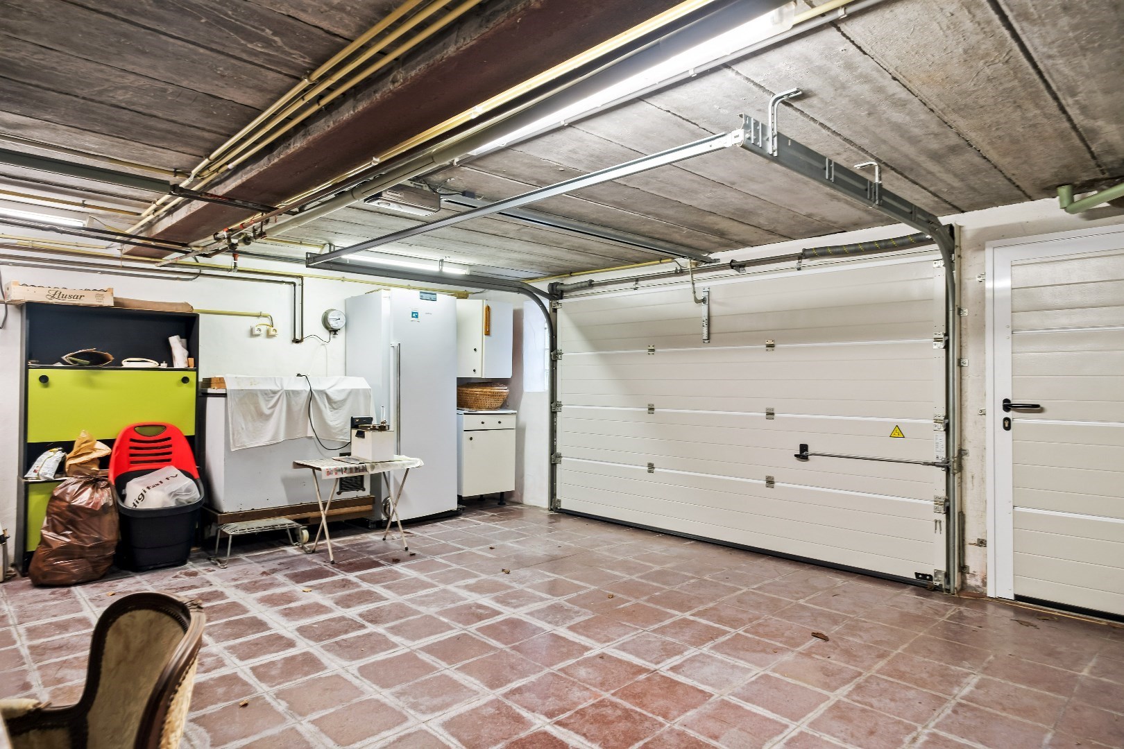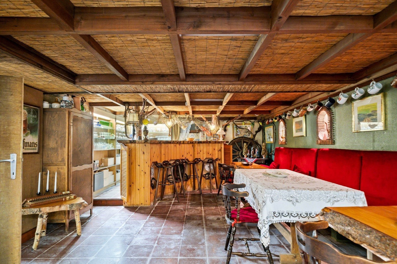 Op de linkerkant komen we terecht in de ruime keuken met toegang tot de grote veranda die bovendien is uitgerust met open haard voor gezellige avonden. De keuken biedt ook toegang tot de kelder, de woning is volledig onderkelderd en deze is ook toegankelijk aan de zijkant van de woning via de sectionale garagepoort. 1 van de troeven bevindt zich ook hier in de kelder, namelijk een heel toffe volledig uitgeruste bar.