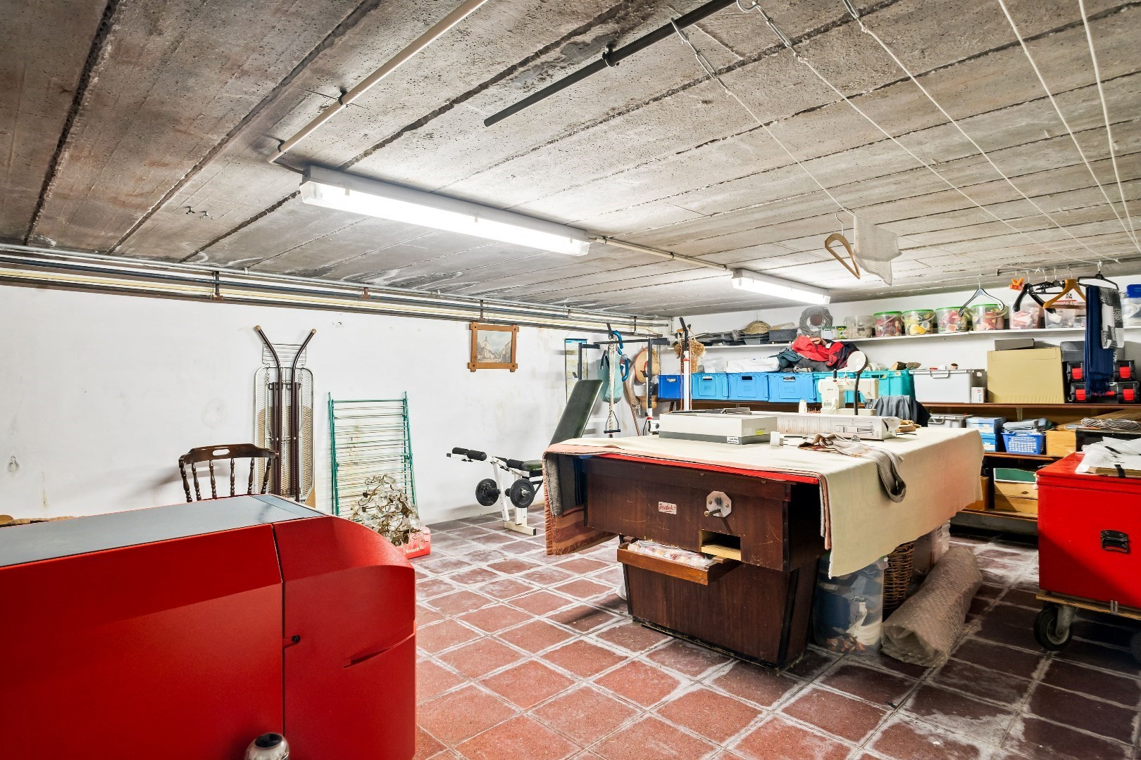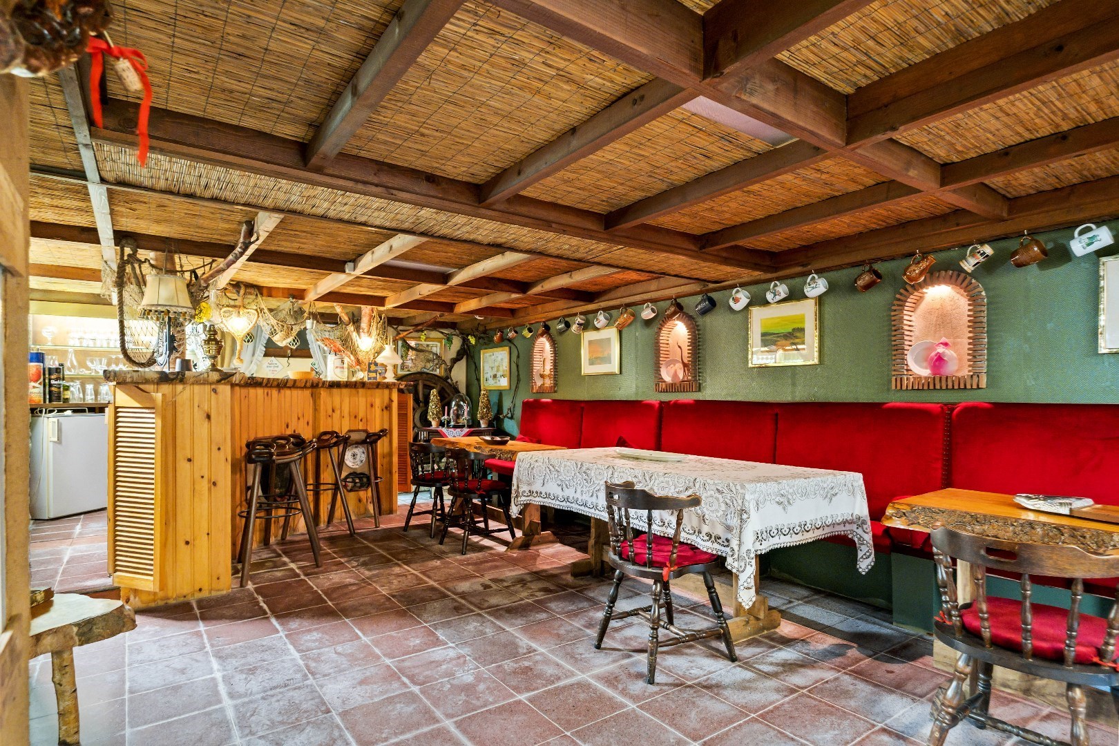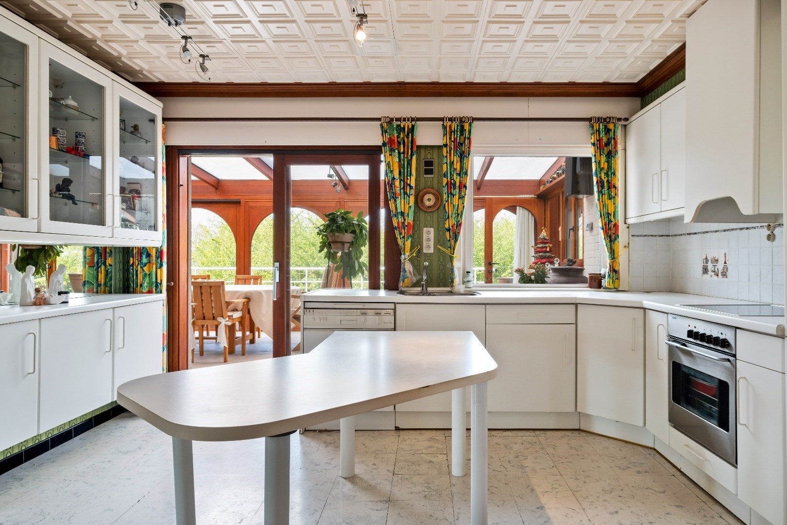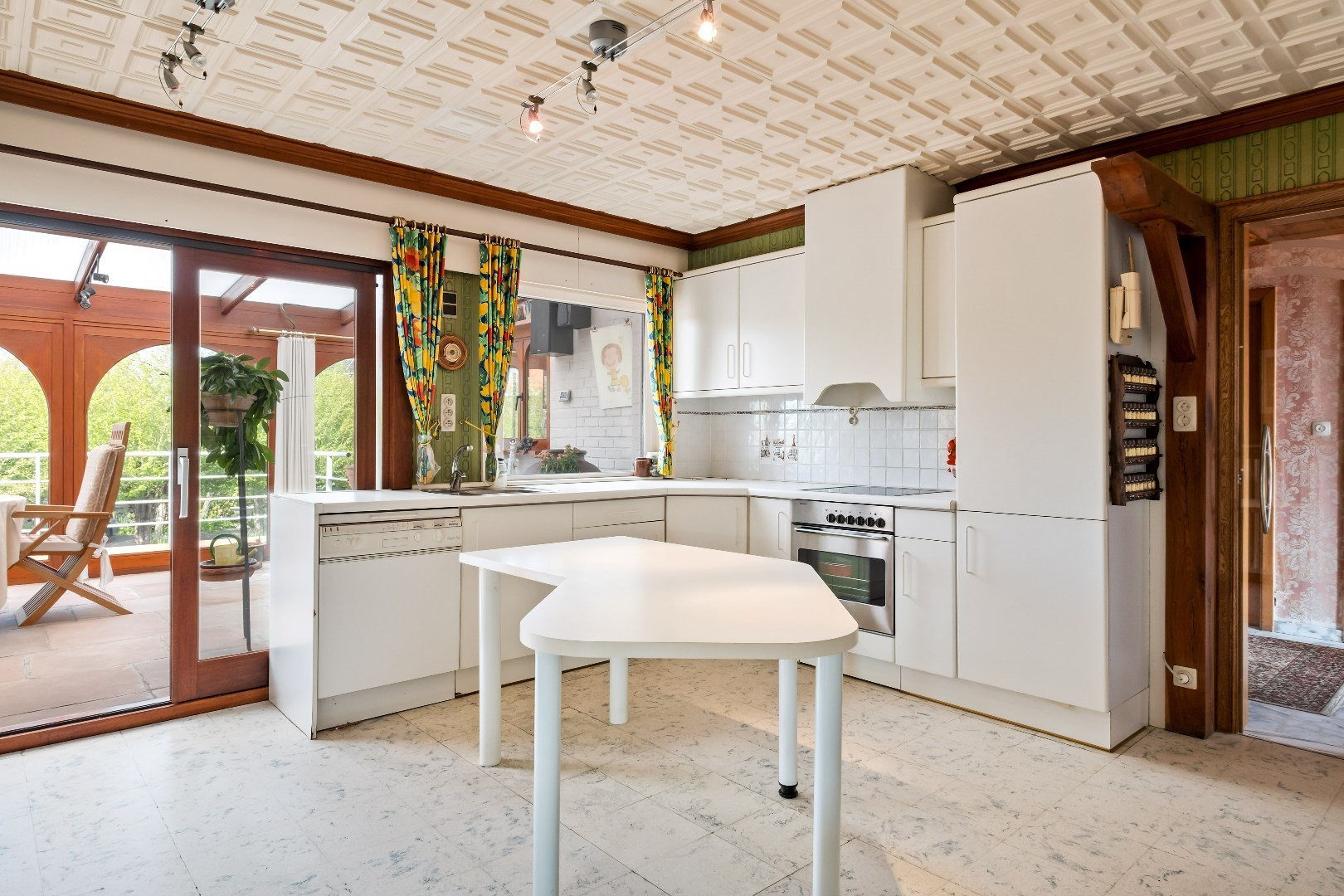 Op de linkerkant komen we terecht in de ruime keuken met toegang tot de grote veranda die bovendien is uitgerust met open haard voor gezellige avonden. De keuken biedt ook toegang tot de kelder, de woning is volledig onderkelderd en deze is ook toegankelijk aan de zijkant van de woning via de sectionale garagepoort. 1 van de troeven bevindt zich ook hier in de kelder, namelijk een heel toffe volledig uitgeruste bar.
